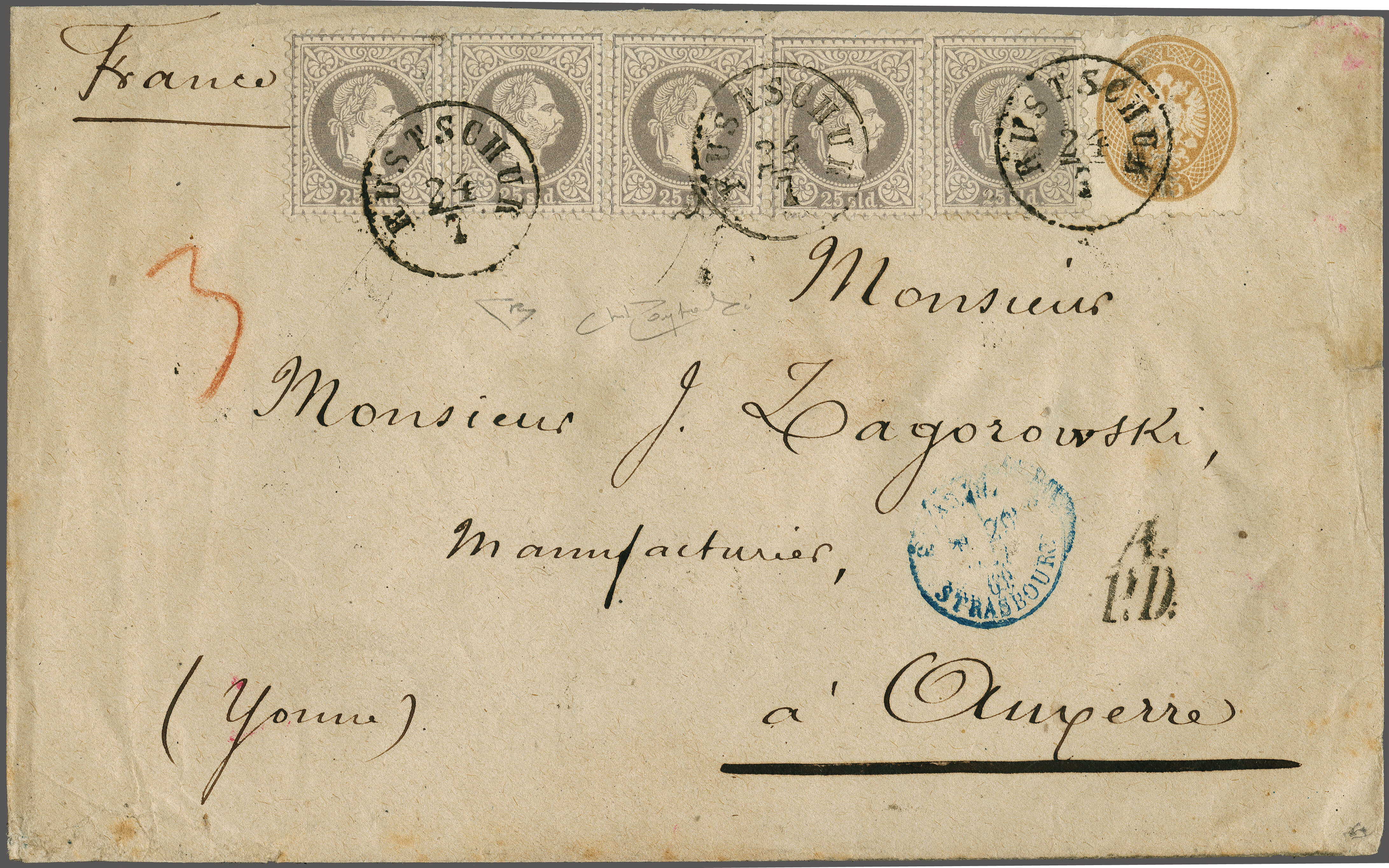 in black and Strasbourg transit (July 29) in blue on obverse and Auxerre arrival on reverse. A wonderful mixed issue franking - whilst marked for triple rate in manuscript, it appears this led to confusion as the cover is paid in full at quadruple