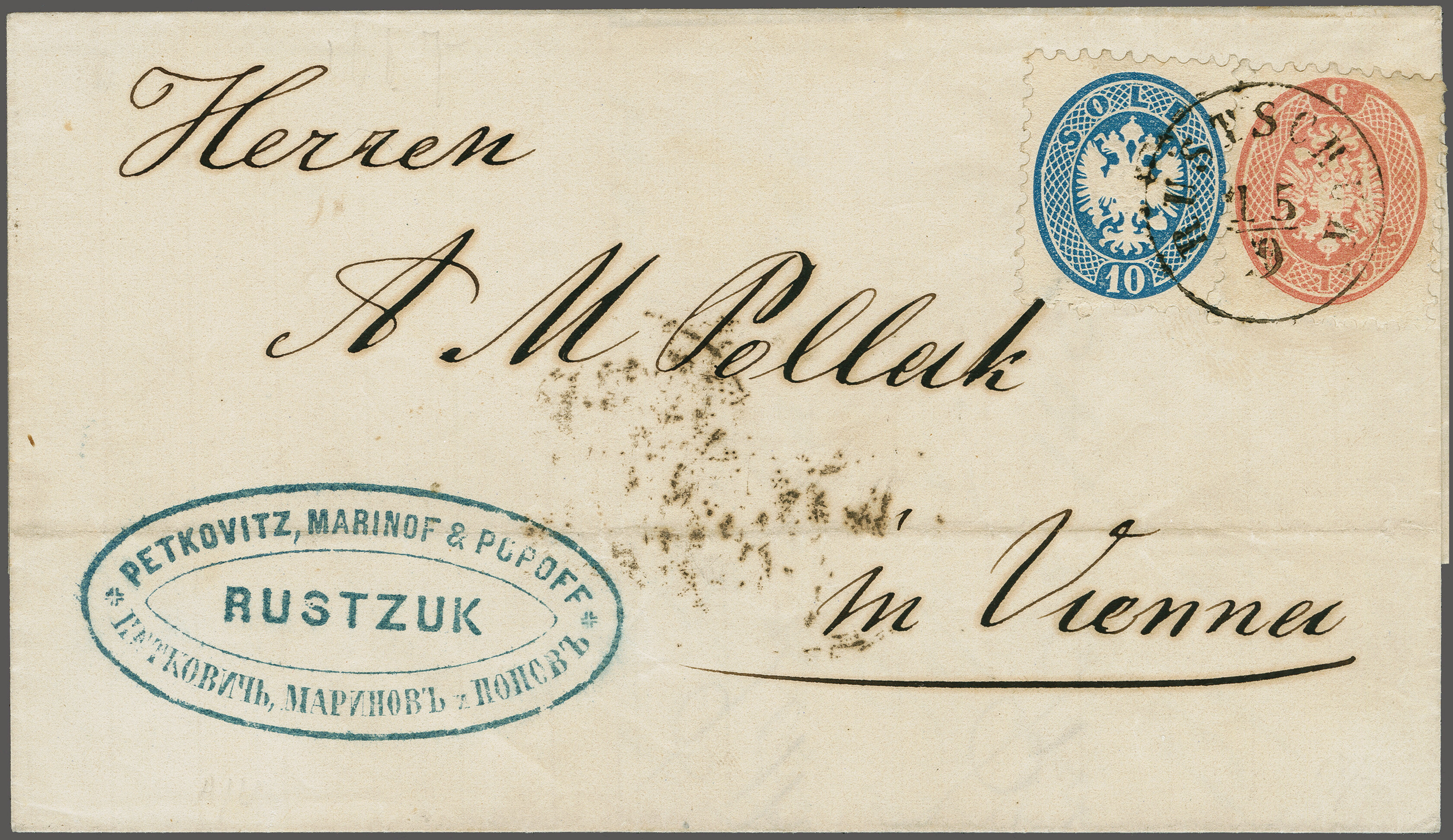 Austrian P.O. 1864: Arms 5 s. rose and 10 s. blue, perf. 9½, used on 1867 cover to Vienna, neatly tied by "RUSTSCHUK" circular datestamp (Sept 15) in black (Tchilinghirian fig. 877). Vienna arrival on reverse. Scarce and most