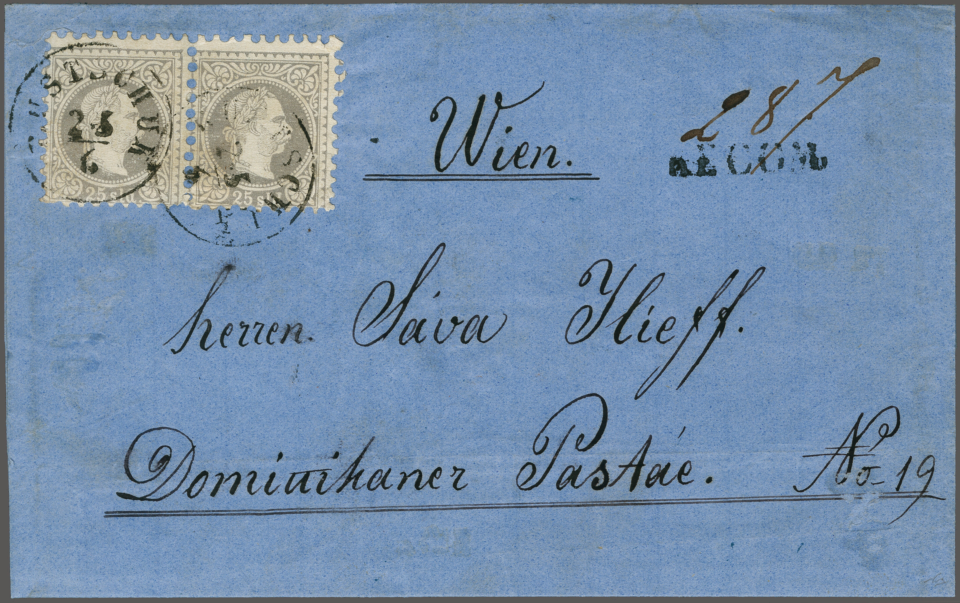 Austrian P.O. 1867: 25 s. grey-lilac, a horizontal pair used on 1870 registered entire letter to Vienna tied by "RUSTSCHUK" circular datestamps (June 25) in black (Tchilinghirian fig. 877) with straight line "RECOM." at right