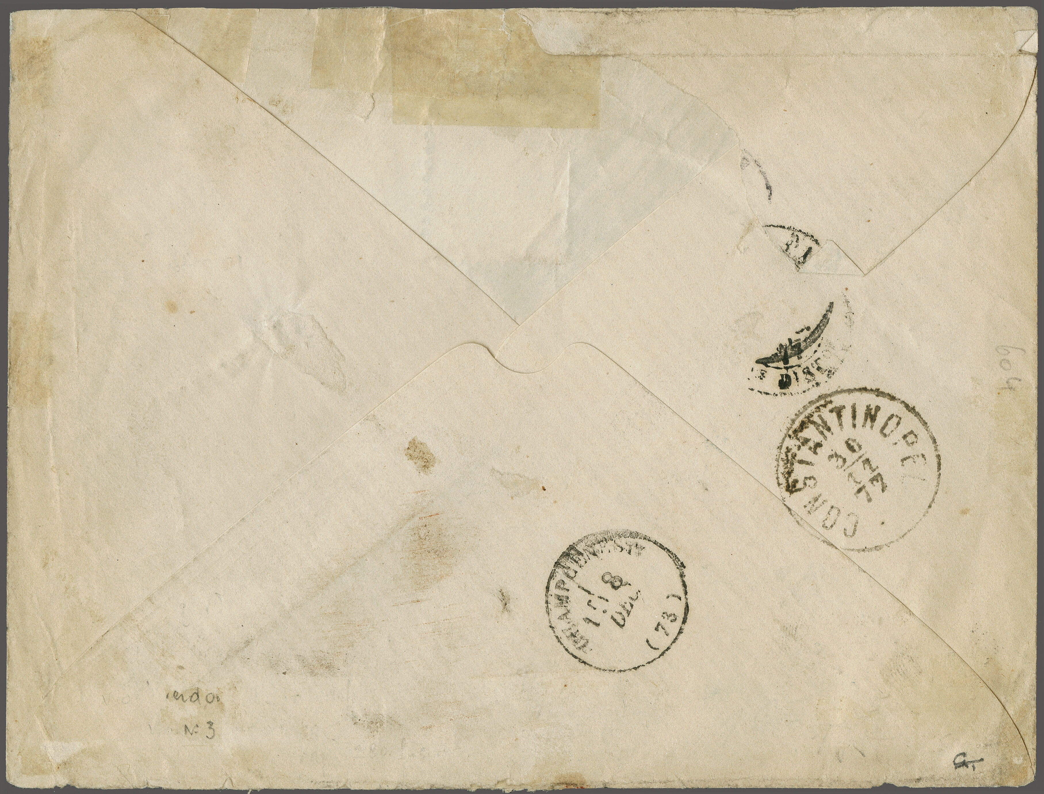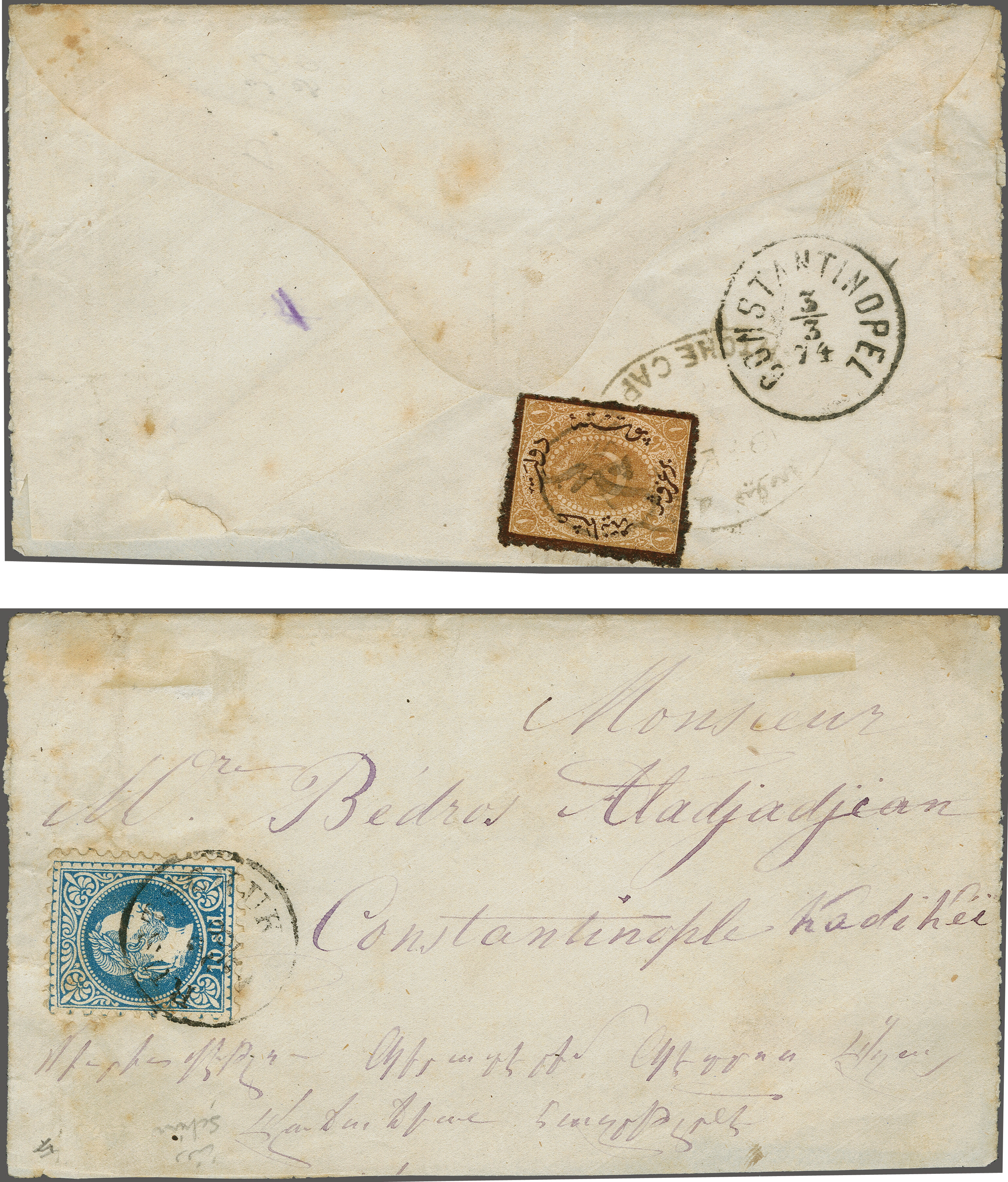(March 3) and passed to the City Post with Turkey 1870/71 'Sehir' 1 pi. red-orange, perf. 5-12, for Istanbul Local City Post delivery to the suburb tied by oval "Baghtche Capussi" datestamp. A fine and rare cover, sensibly opened for Exhibit display.