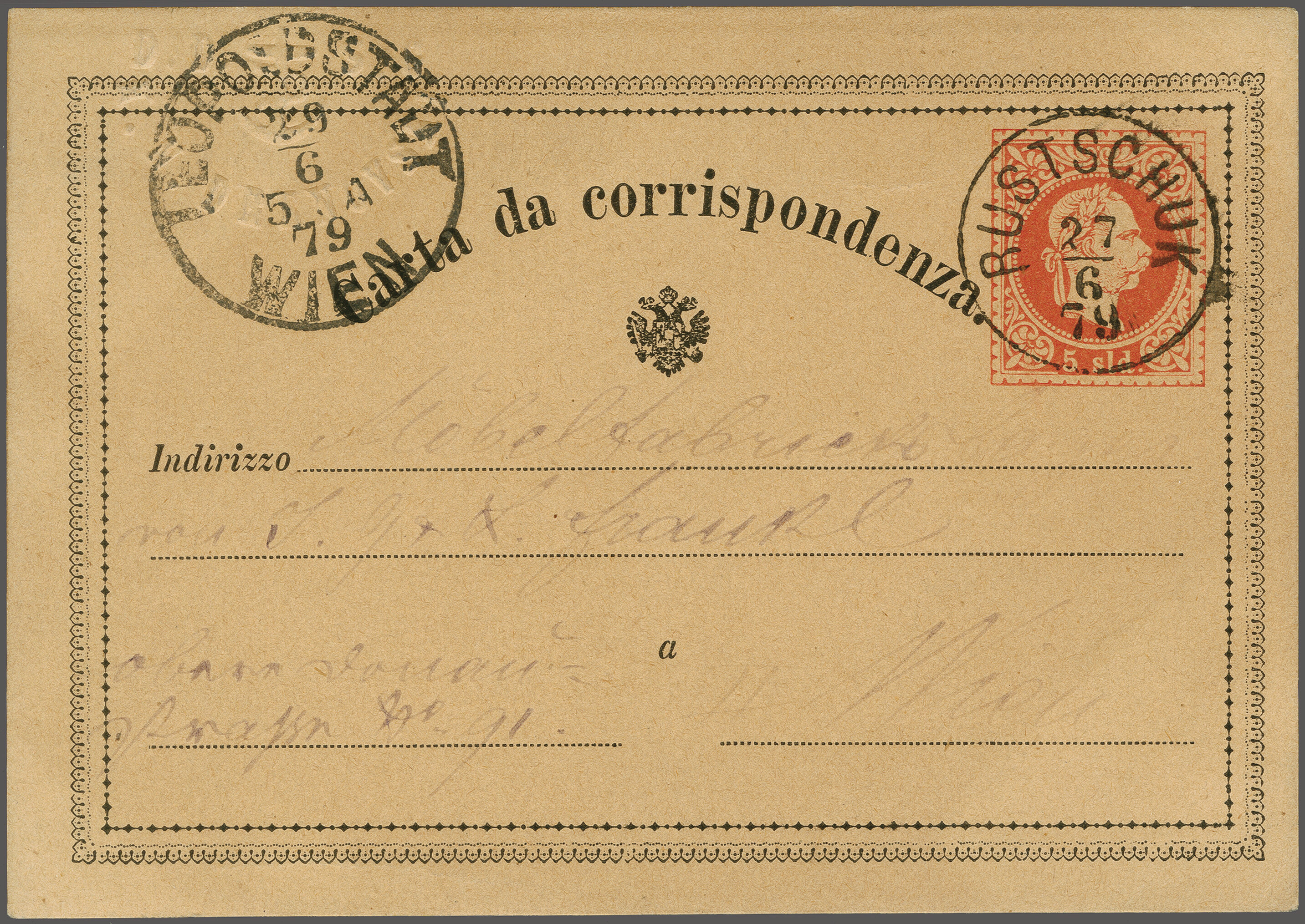 Austrian P.O. 1867: 5 s. red postal stationery card, a used example to Vienna cancelled by large (25mm. diameter) "RUSTSCHUK" three line circular datestamp (June 27, 1879) in black (Tchilinghirian fig. 879). 'Leopoldstadt /