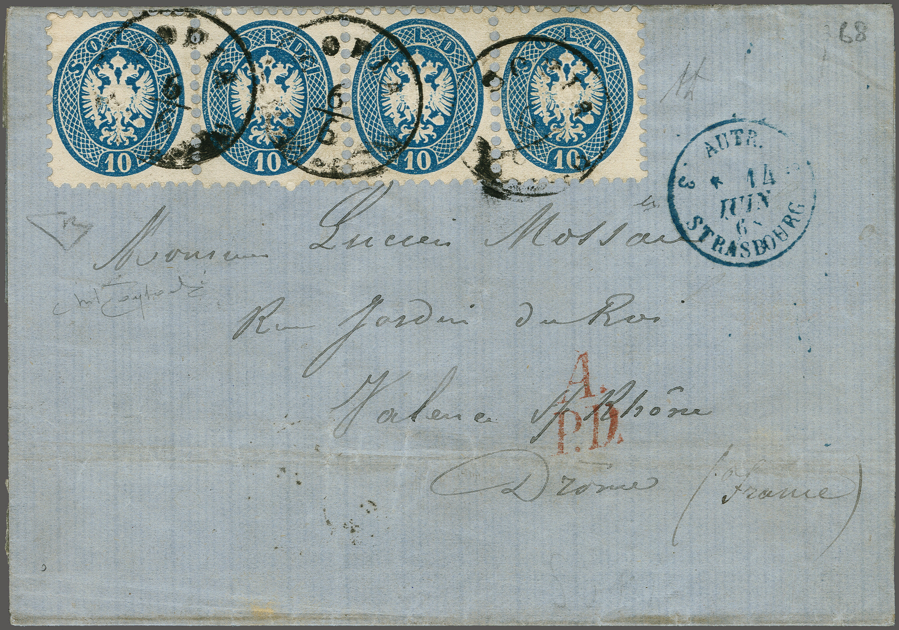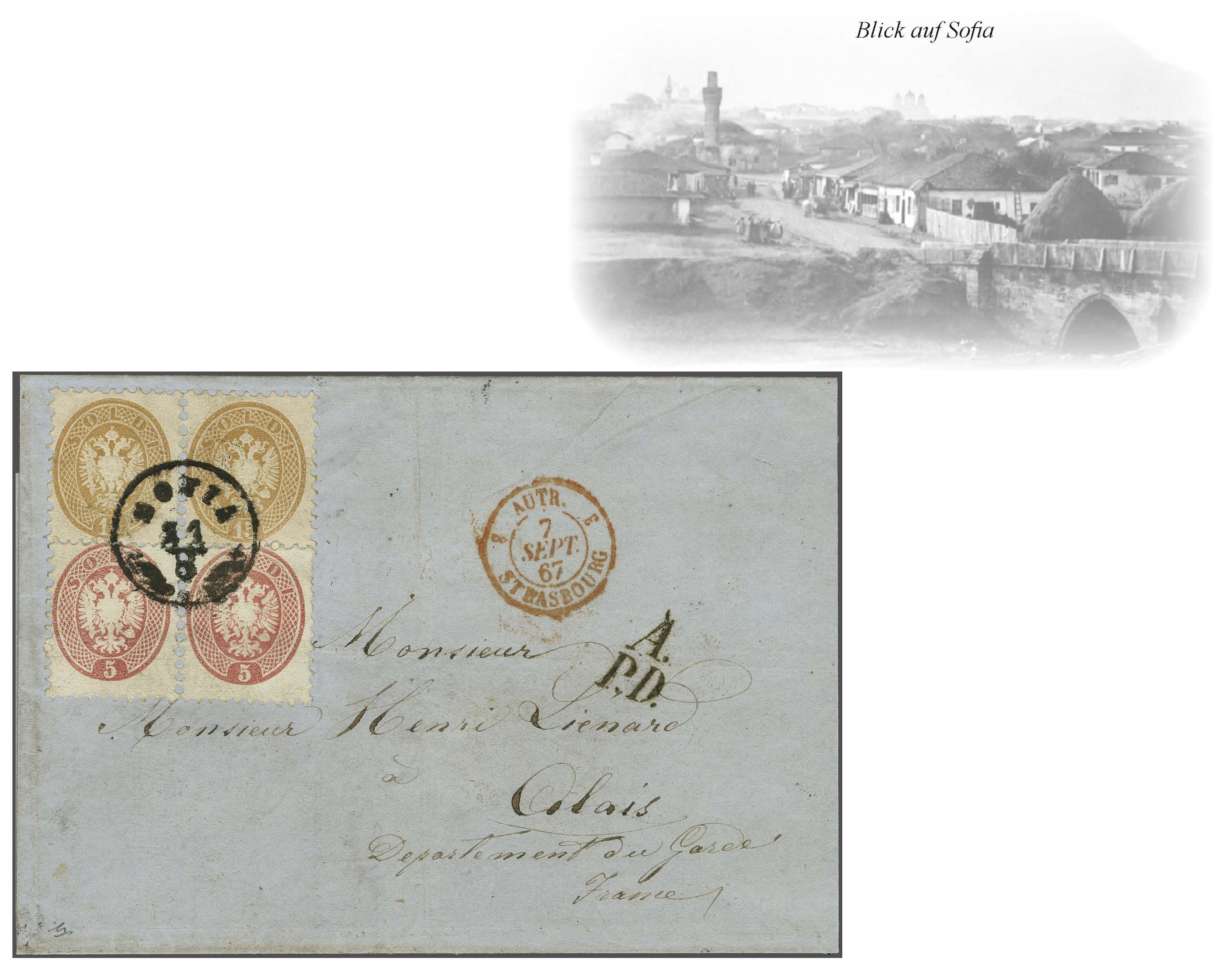Austrian P.O. 1864: Arms 10 s. blue, perf. 9½, a horizontal strip of four, used on 1868 entire letter to Valence, Drôme, France tied by "SOFIA" circular datestamps (June 6) in black (Tchilinghirianm fig. 864). "A/PD" handstamp