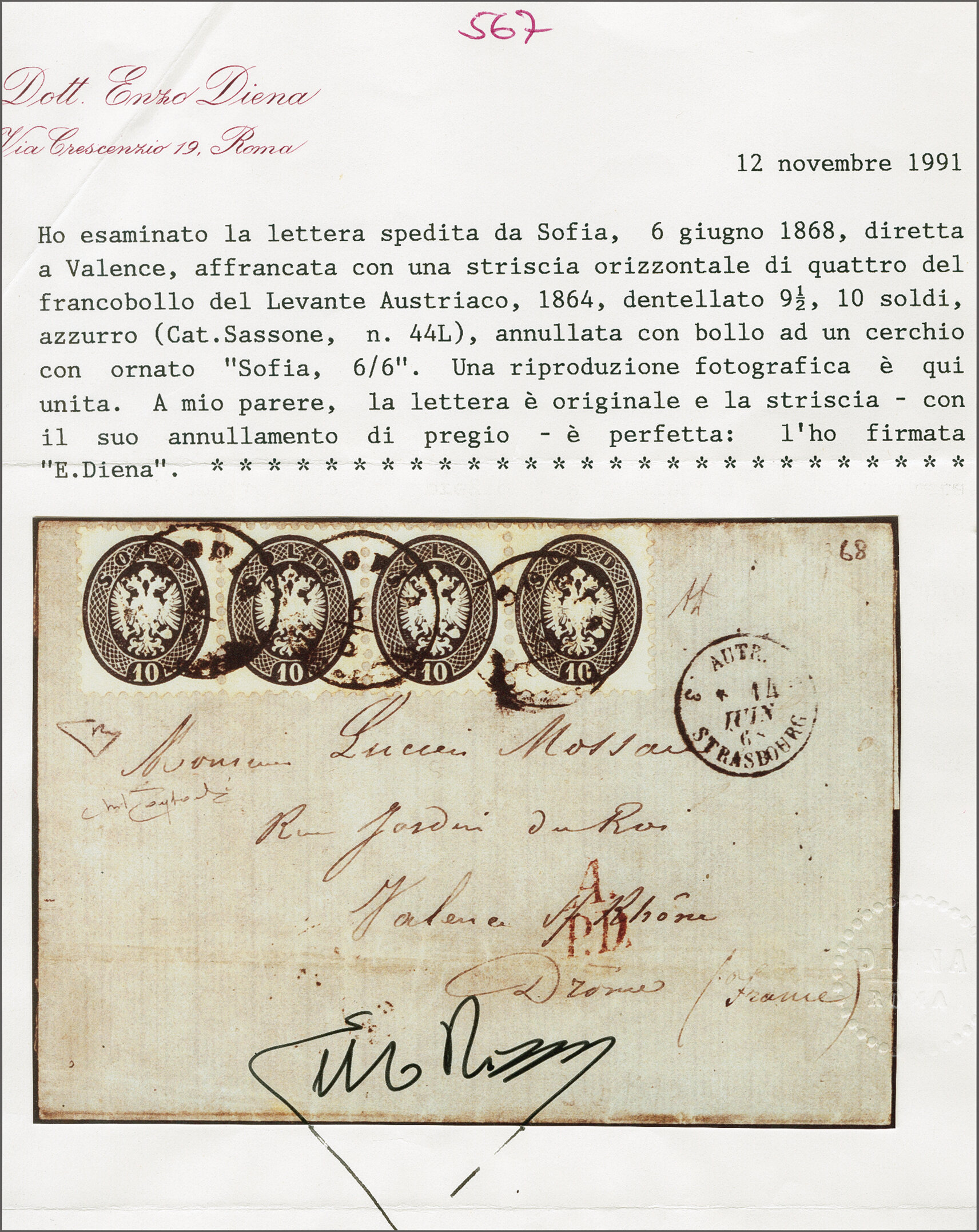 applied in red, Strassbourg entry marking in blue (June 14) on obverse. An exceptional and extremely rare multiple - the largest recorded for the Arms issue in Sofia - on a superb entire. Signed E. Diena, A. Diena and C. Raybaudi. Cert. E. Diena