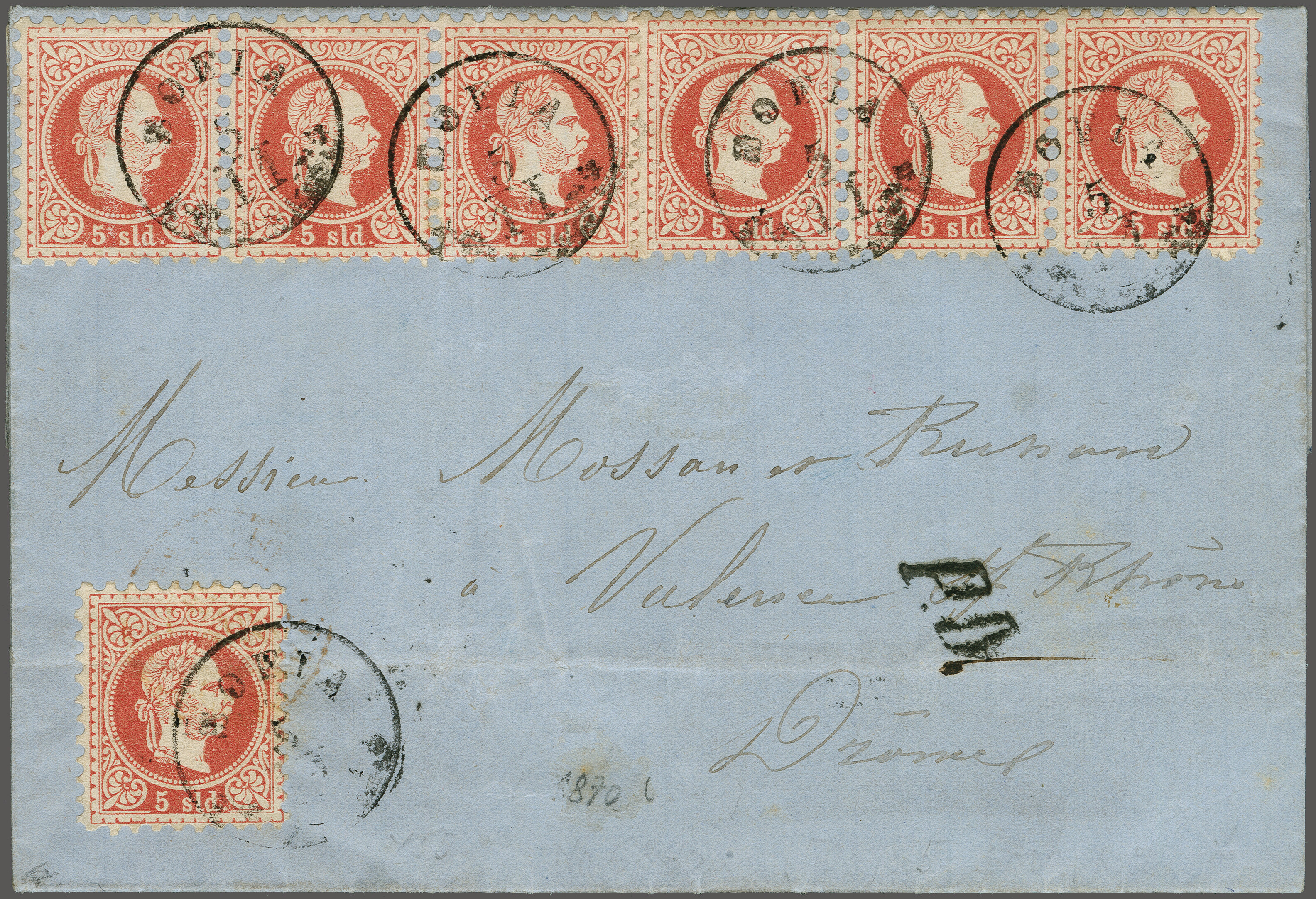 Austrian P.O. 1867: 5 s. red, a single example with two horizontal strips of three used on 1870 entire letter to Valence, Drôme, France neatly tied by five strikes of "SOFIA" circular datestamps (Nov 5) in black