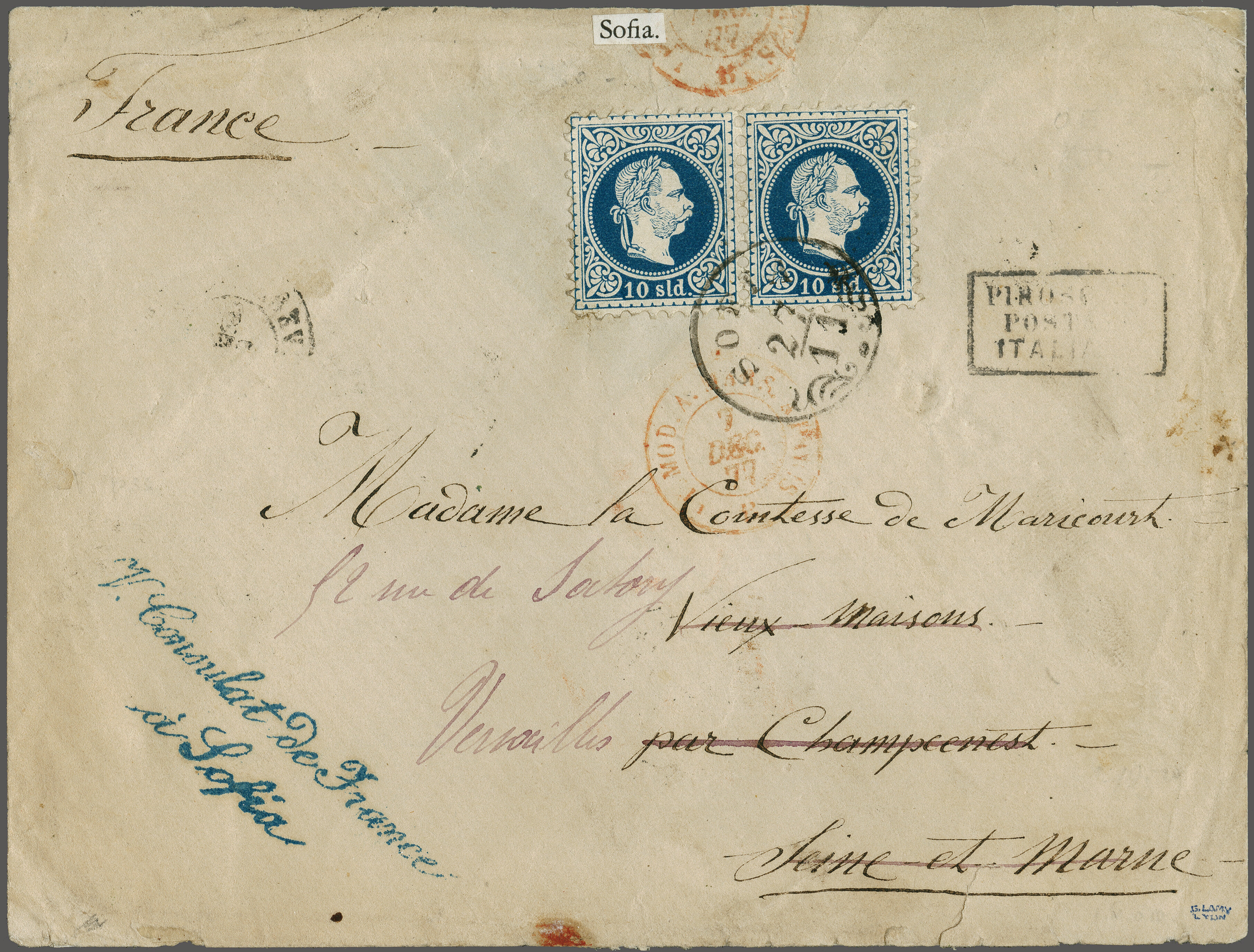 Austrian P.O. 1867: 10 s. blue, a horizontal pair used on 1877 cover from the Vice Conulate of France in Sofia with blue cachet at left; to France and readdressed on arrival to Versailles, neatly tied by fine strike of "SOFIA"