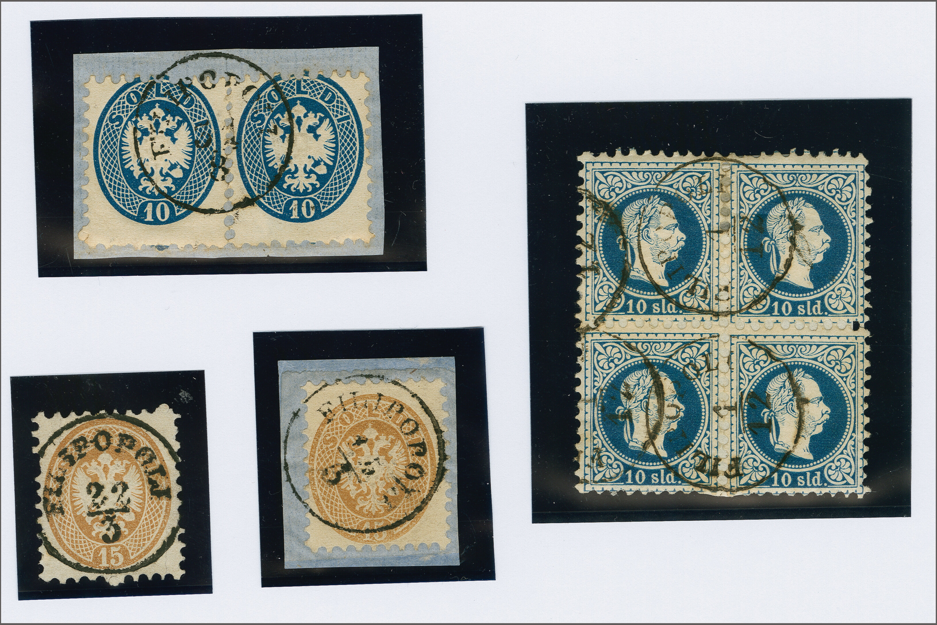 Philippopolis 1863/67: Small used range (4) with 1864 Arms 10 s. blue (two) used on piece, 15 s. brown single examples (one on piece), and scarce 1867 10 s. blue block of four; all cancelled by fine strikes of