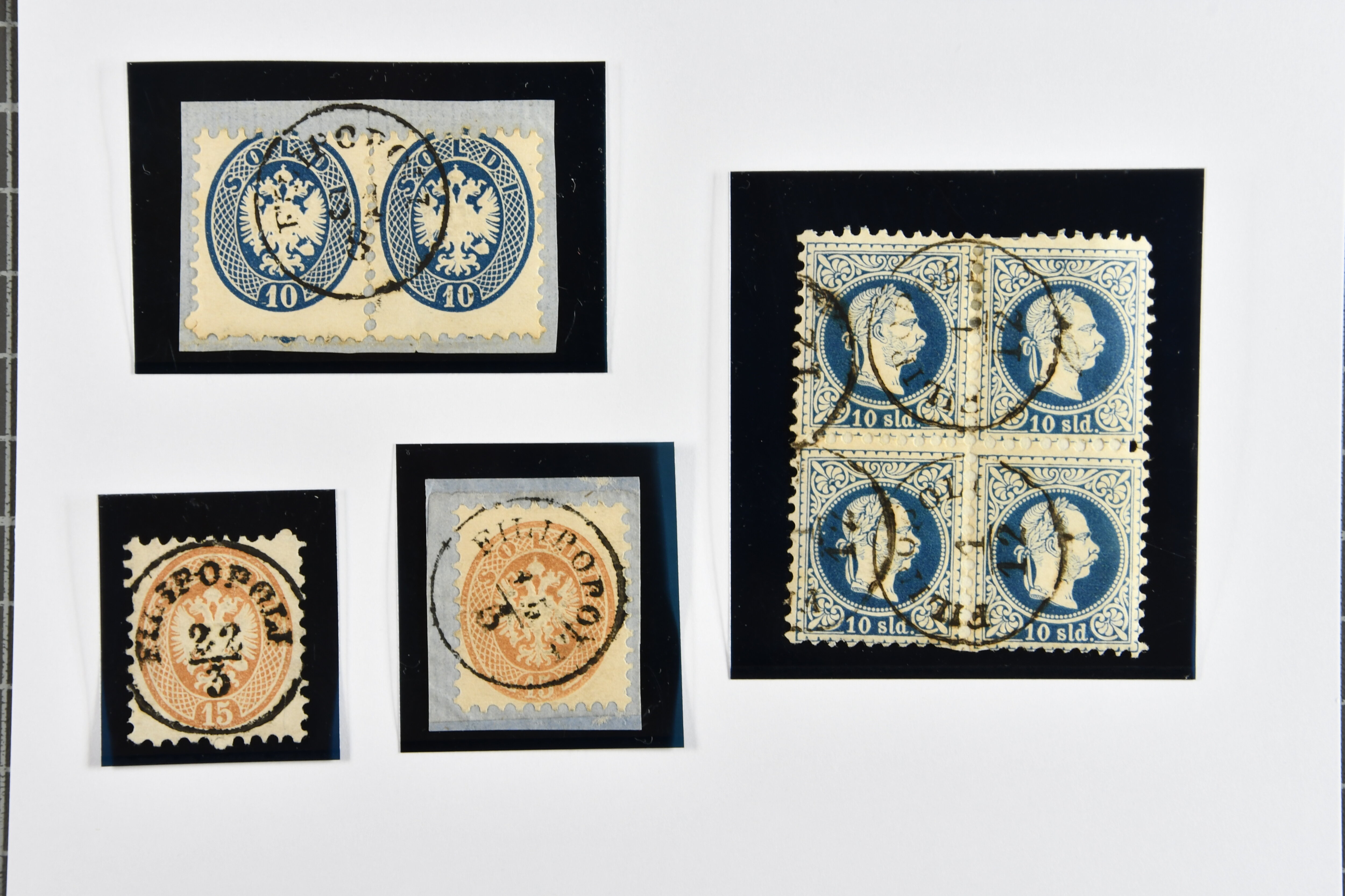 Austrian P.O. 1864: Arms 15 s. brown, perf. 9½ used with astonishing 25 s. grey-lilac in a horzontal strip of five, tied by three strikes of "RUSTSCHUK" circular datestamp (July 24) in black (Tchilinghirian fig. 877). "A/PD"