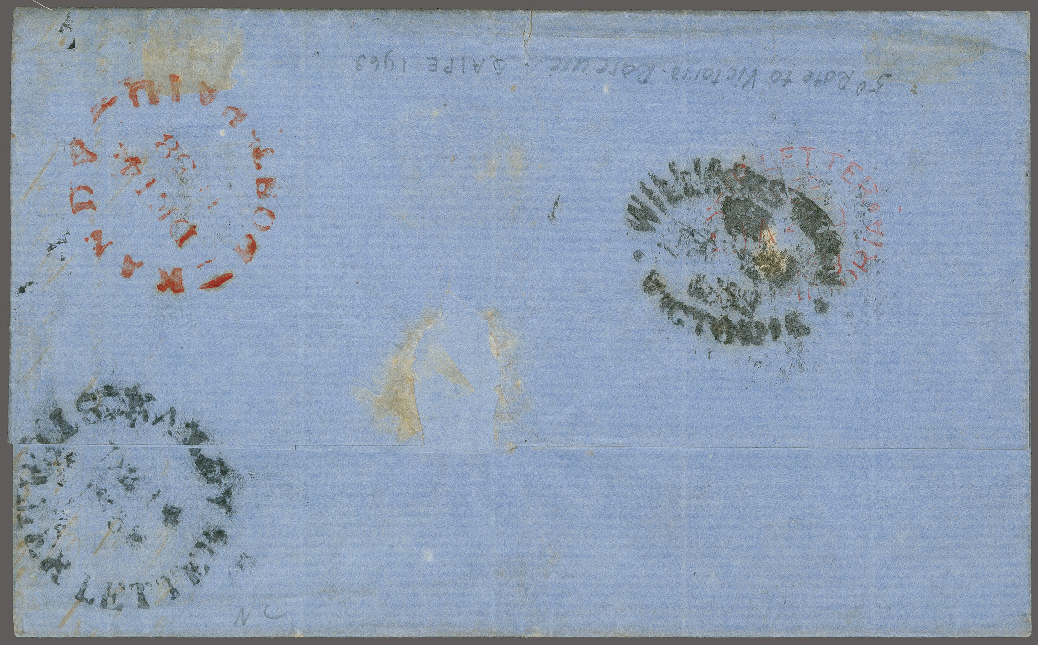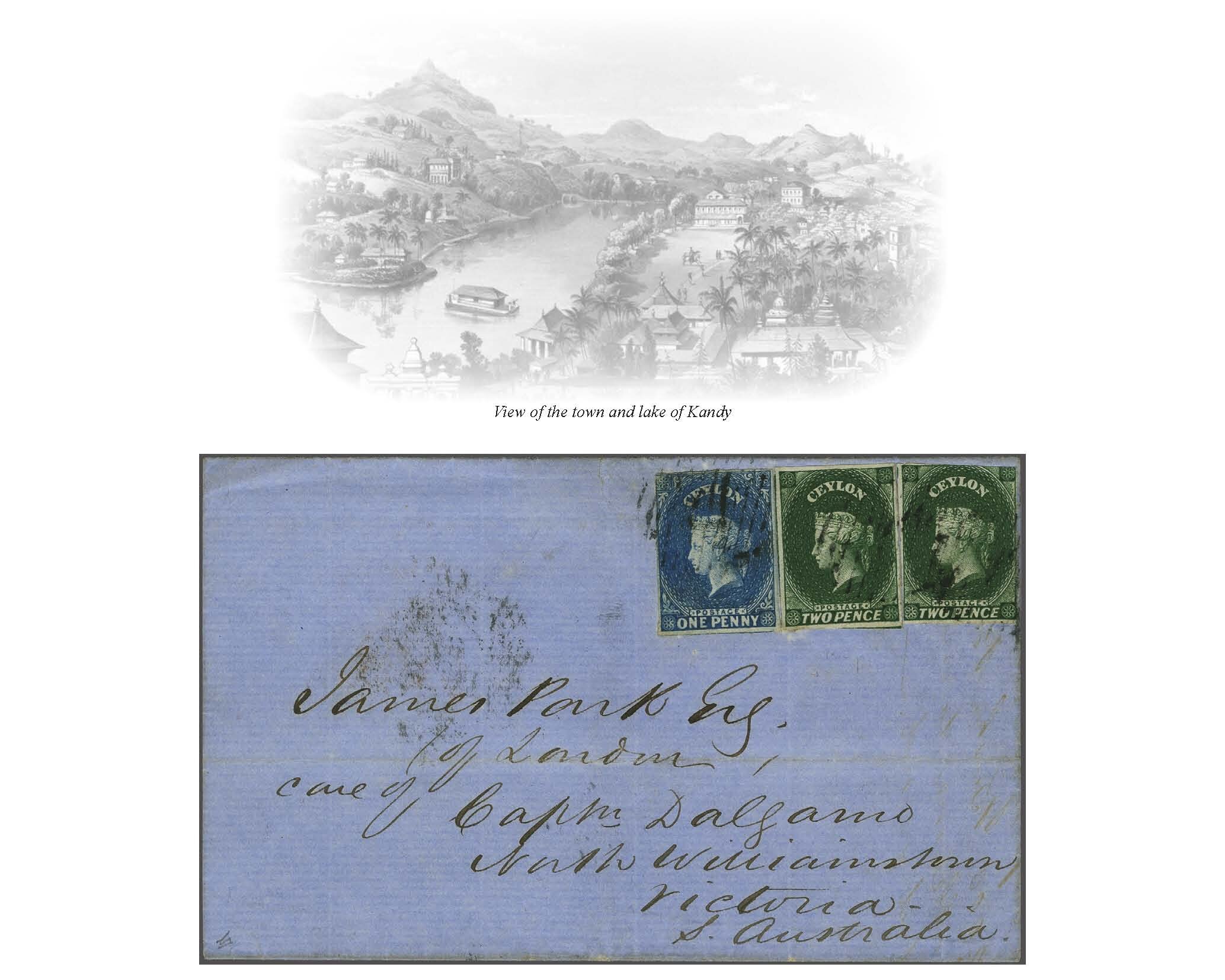 attractive cover. Cert. RPSL (2013). Route: Departed Kandy 14 Dec 1858 overland to Galle. The European and Australian Royal Mail Co: Departed Galle (25 Dec) per “Oneida” via King Georges Sound (13 Jan 1859) to Melbourne, arriving 19 Jan 1859 (35