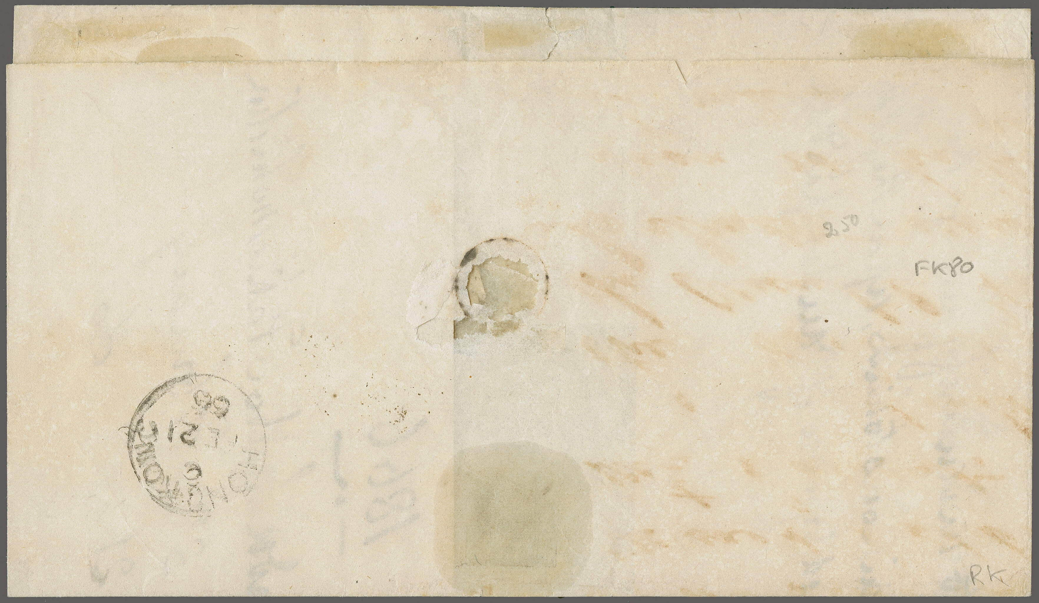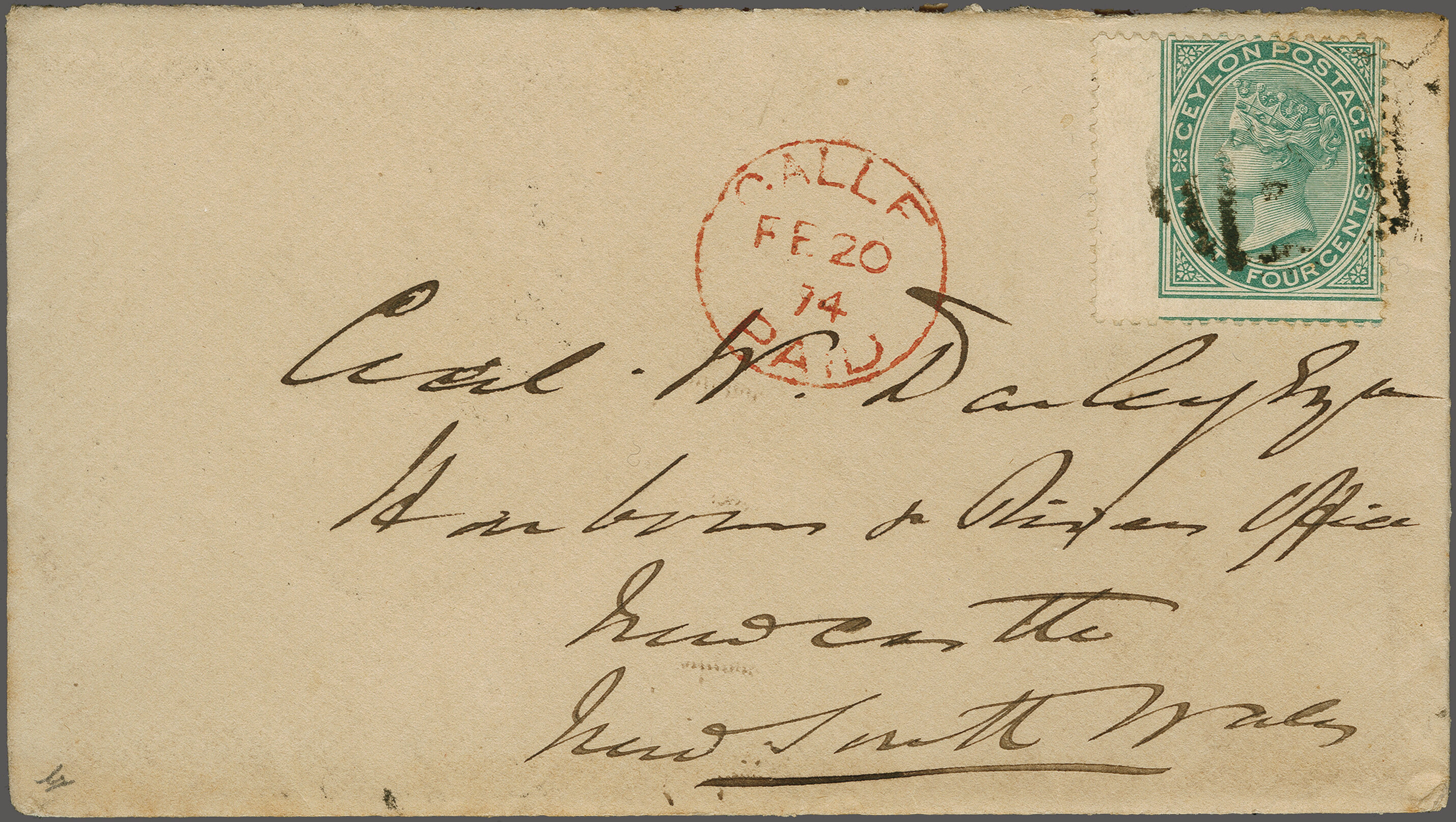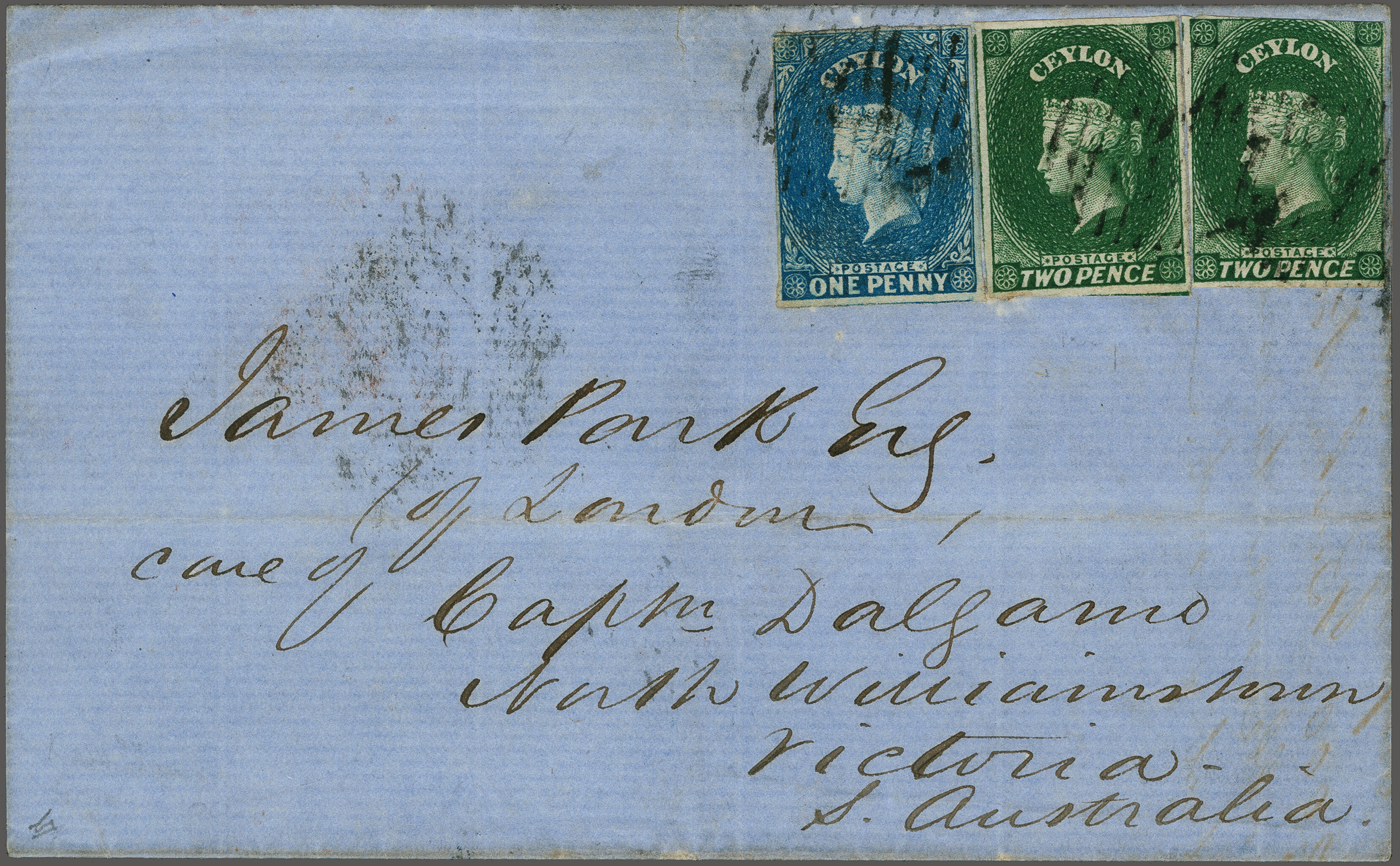 days). Note: Three imperforate covers are recorded from Ceylon to Victoria, this being the finest. Provenance: Collection Shenfield, Hackmey. (Image 1)