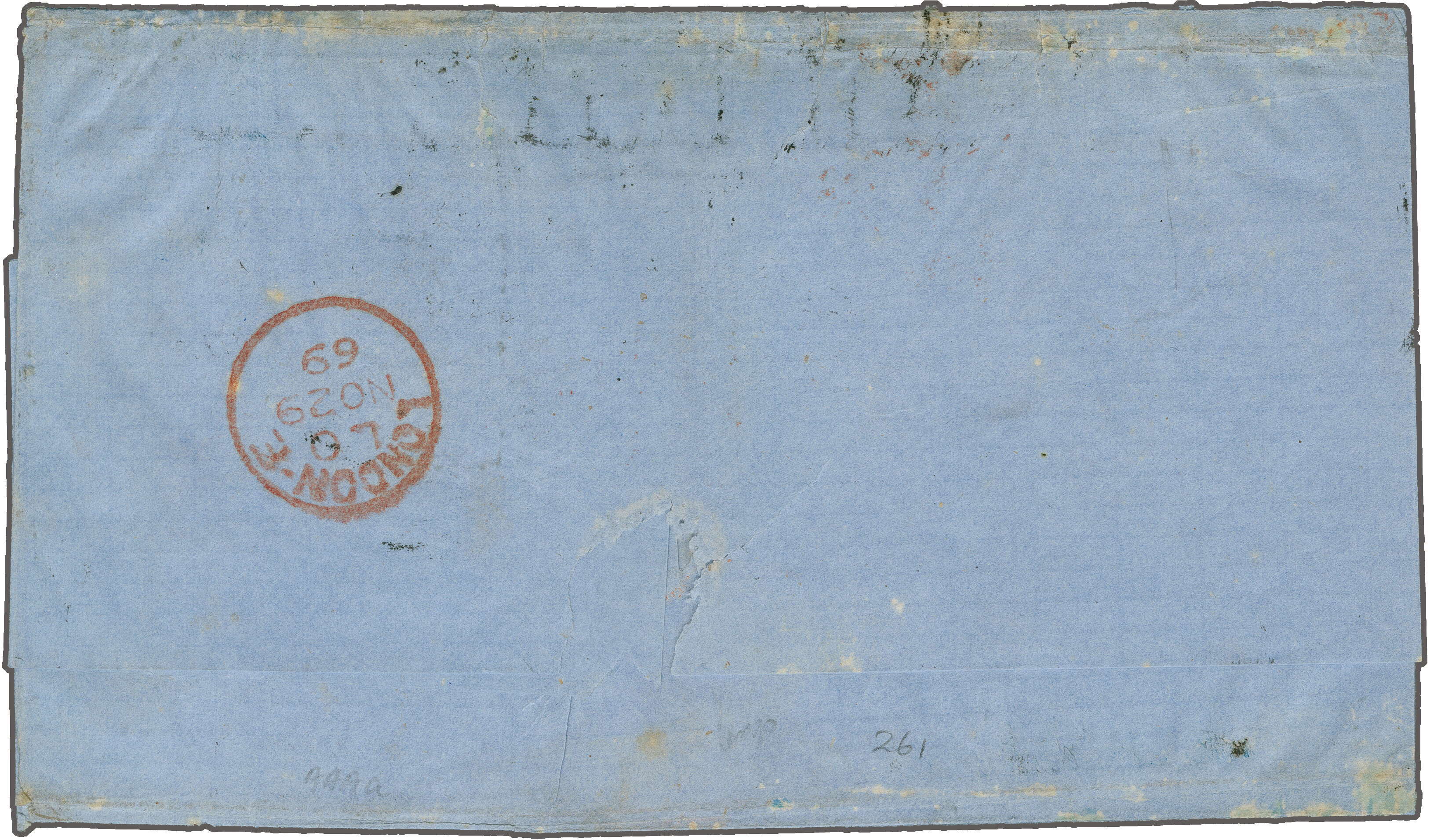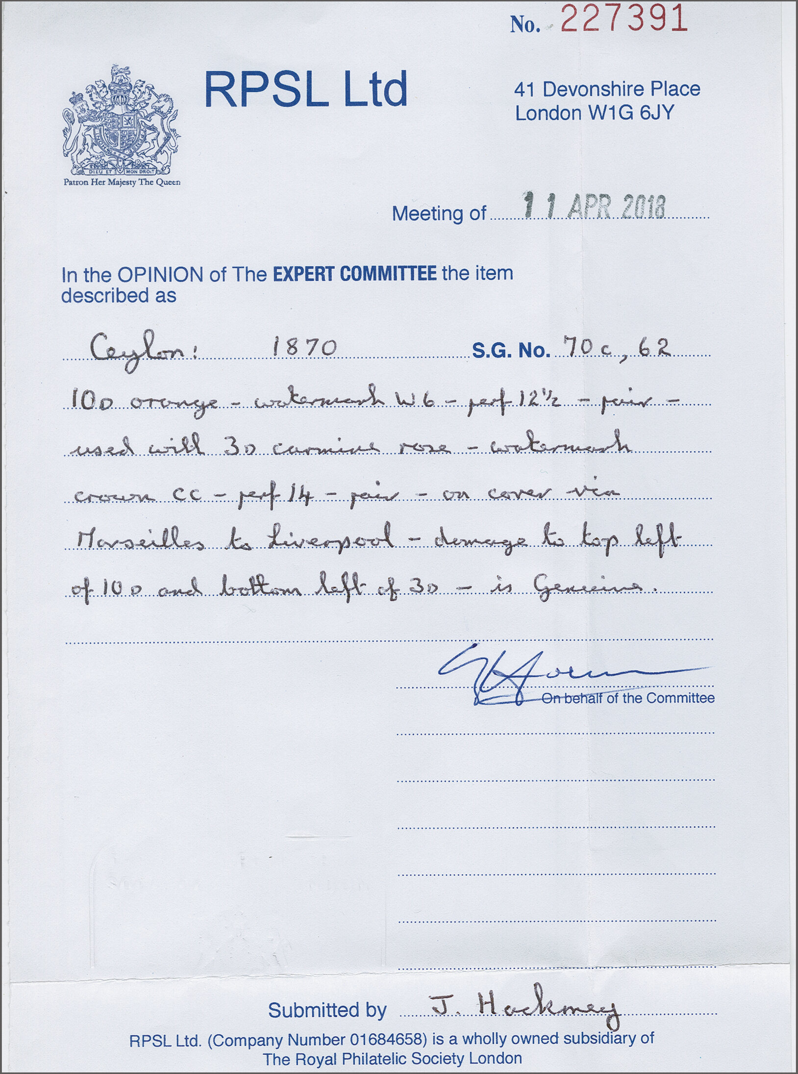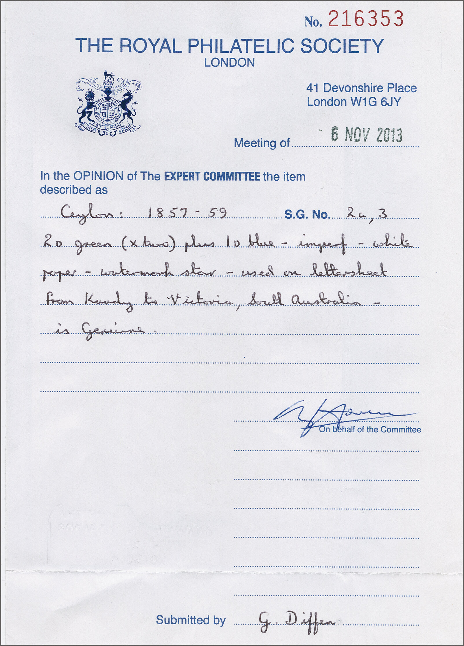 days). Note: Three imperforate covers are recorded from Ceylon to Victoria, this being the finest. Provenance: Collection Shenfield, Hackmey. (Image 1)