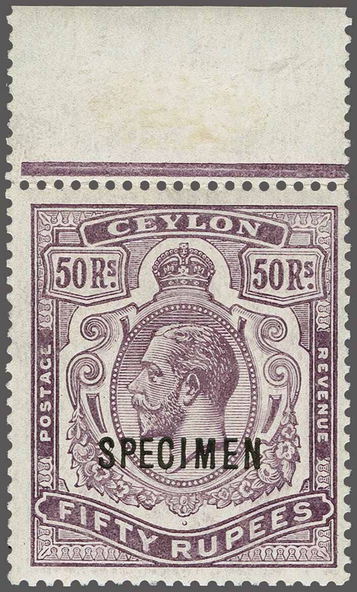 1912-25: 50r dull purple, wmk. Multiple Crown CA, upper margin single, overprinted SPECIMEN, perf. 14, unmounted original gum, fresh and fine. Gi = £225 as mounted. (Image 1)