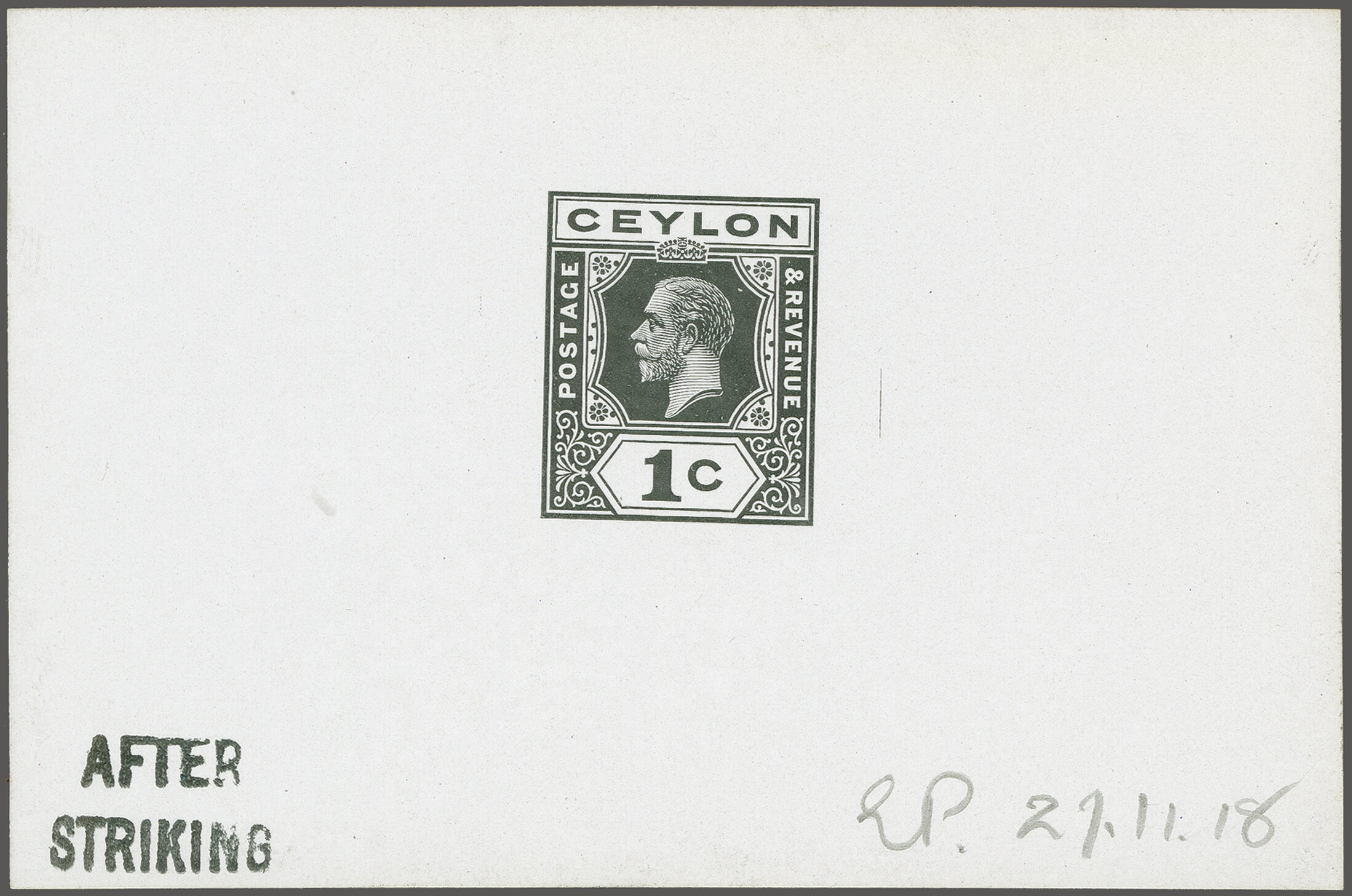1918: De La Rue Die Proof for the completed 1 c. value printed in black on glazed white card, handstamped "AFTER / STRIKING" in black and dated "27/11/18" in pencil at lower right. Scarce and very fine. (Image 1)