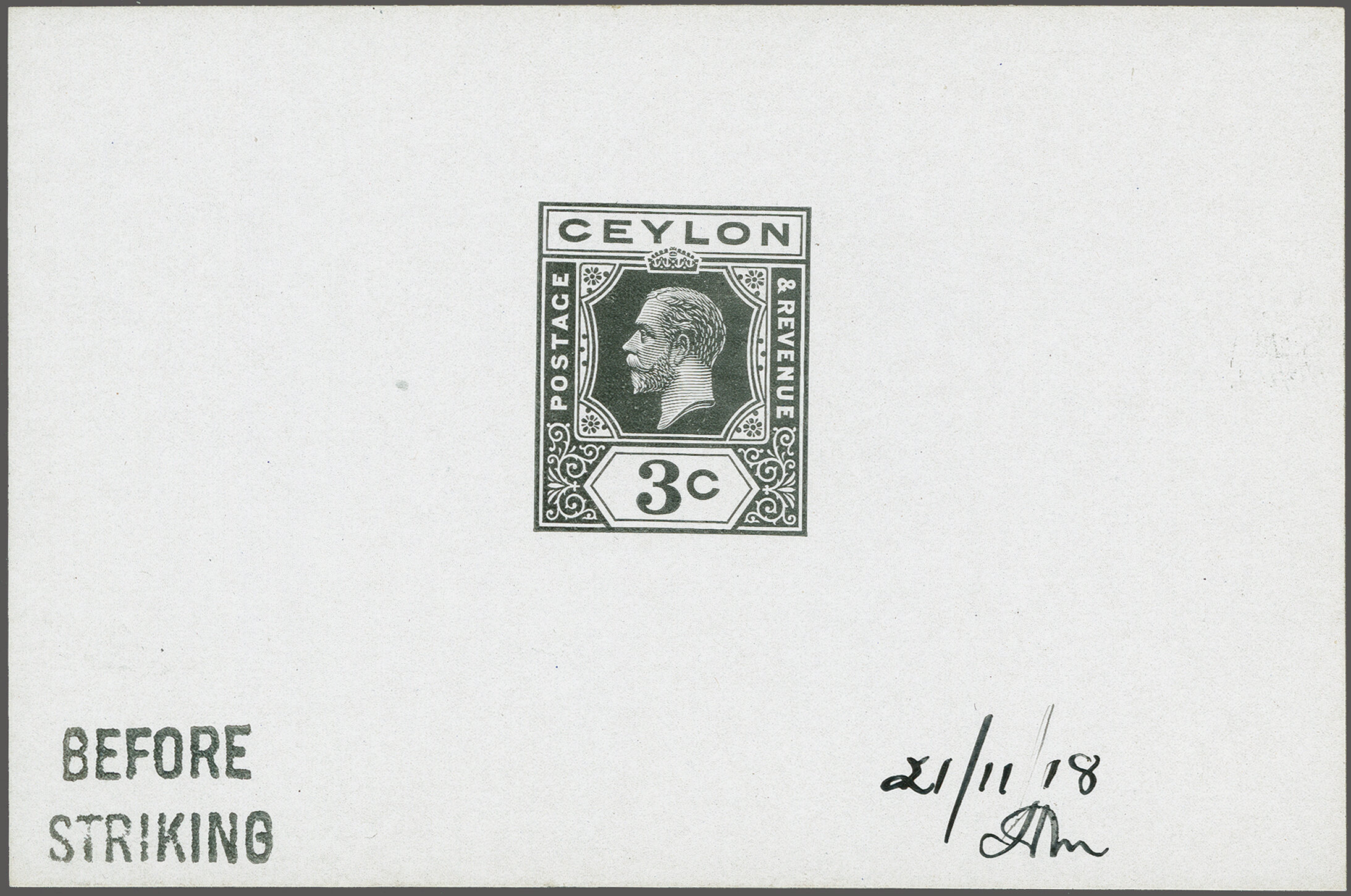 1918: De La Rue Die Proof for the completed 3 c. value printed in black on glazed white card, handstamped "BEFORE / STRIKING" in black and dated "21/11/18" in manuscript ink and signed at lower right. Scarce and very fine. (Image 1)