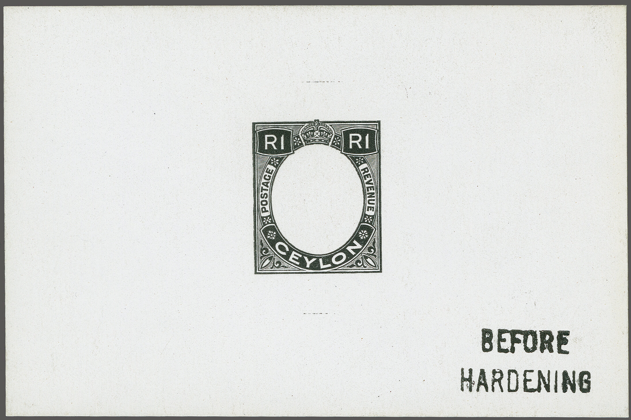 1927/29: De La Rue Die Proof for the 1 rupee value, frame only printed in black on glazed white card, handstamped "BEFORE / HARDENING" in black at lower right. Scarce and very fine. (Image 1)