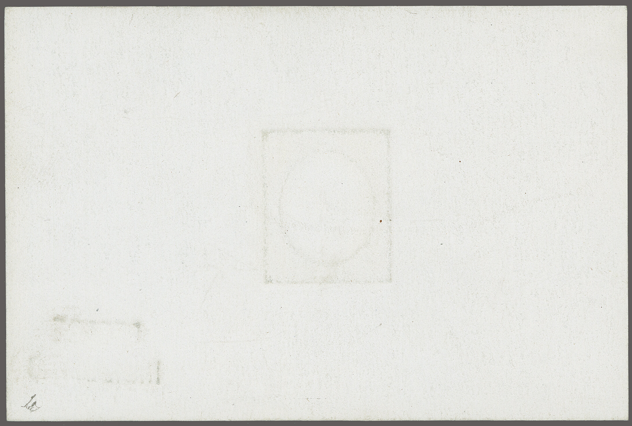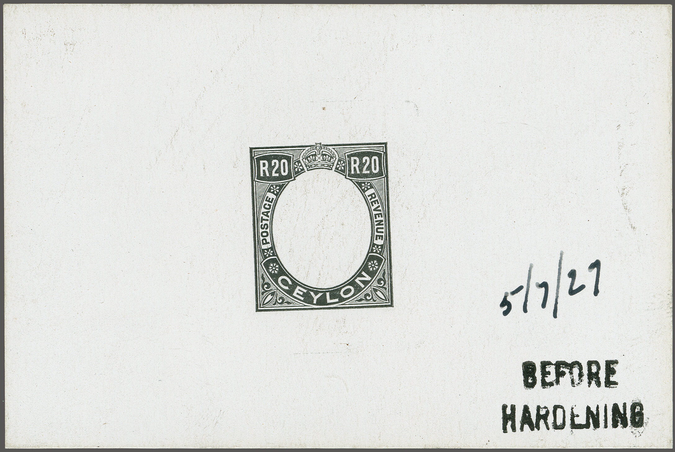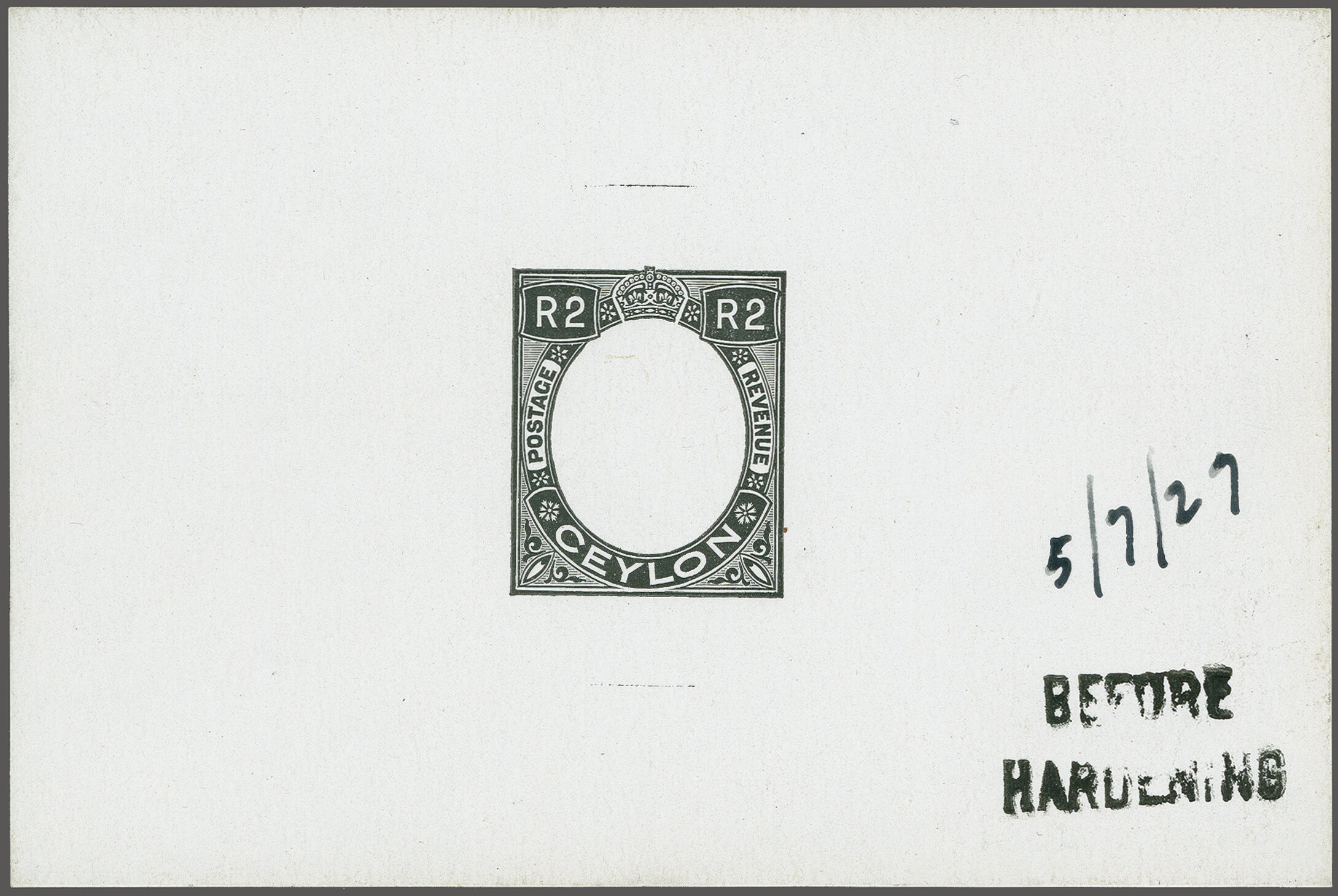 1927/29: De La Rue Die Proof for the 2 rupee value, frame only printed in black on glazed white card, handstamped "BEFORE / HARDENING" in black at lower right and manuscript dated "5/7/27" in ink. Scarce and very fine. (Image 1)