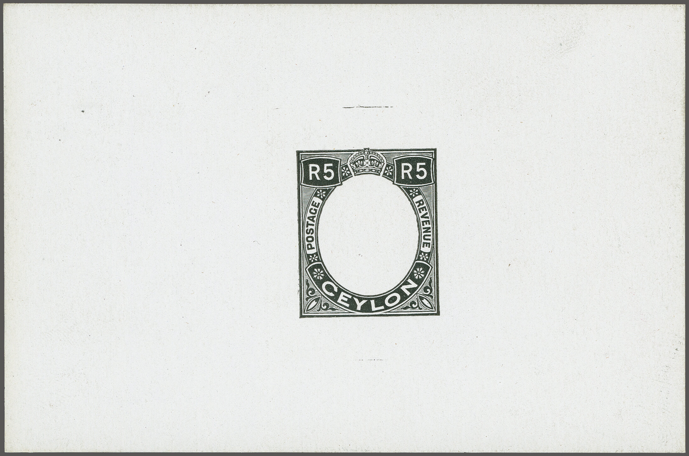 1927/29: De La Rue Die Proof for the 5 rupee value, frame only printed in black on glazed white card, without date or handstamps. Scarce and very fine. (Image 1)