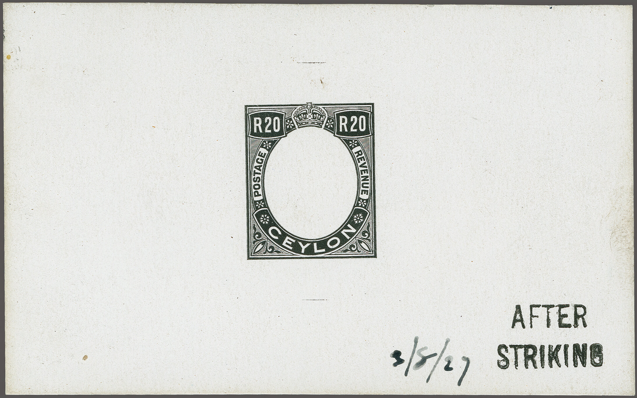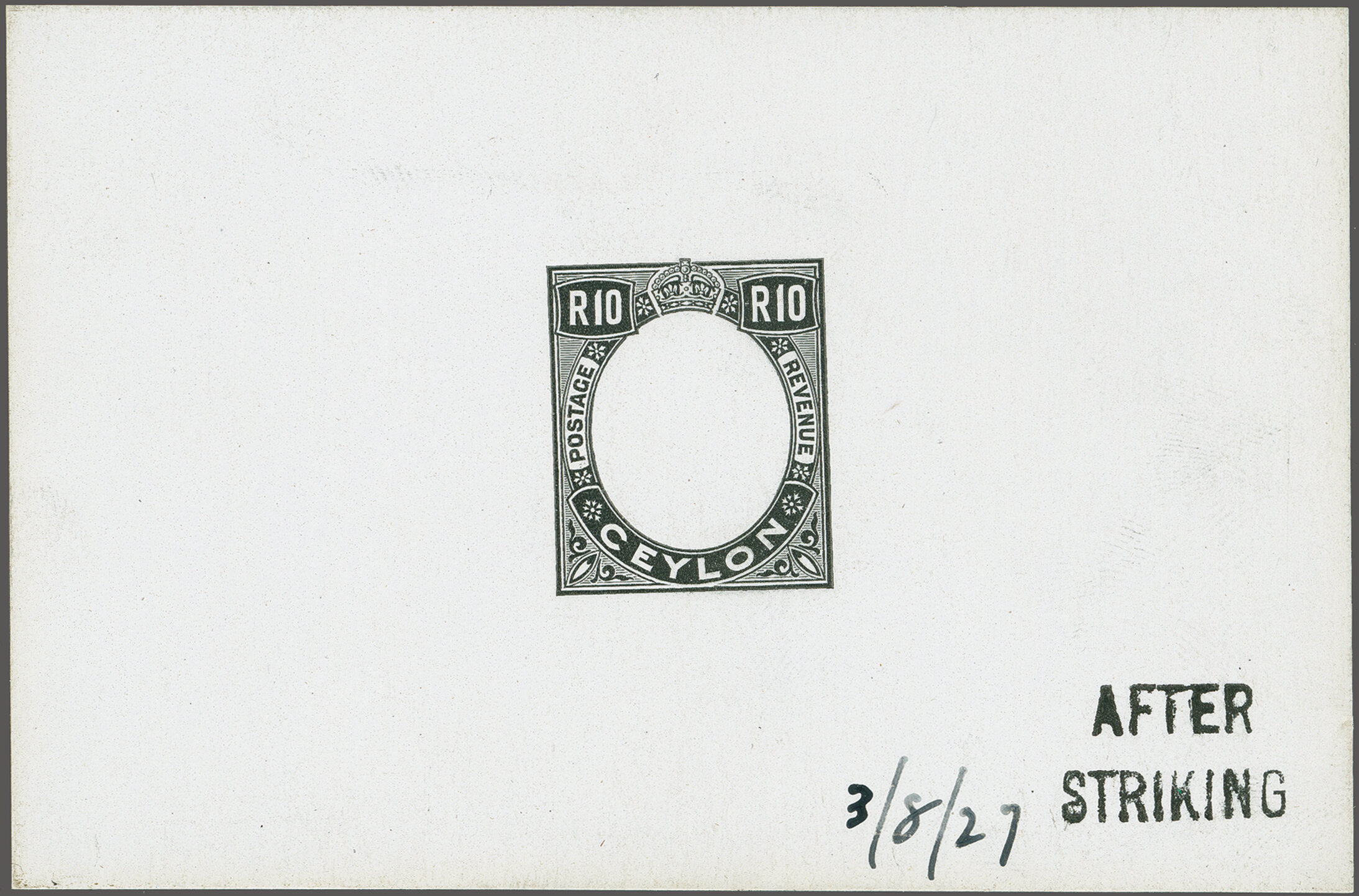 1927/29: De La Rue Die Proof for the 10 rupee value, frame only printed in black on glazed white card, handstamped "AFTER / STRIKING" in black at lower right and manuscript dated "3/8/27" in ink. Scarce and very fine. (Image 1)