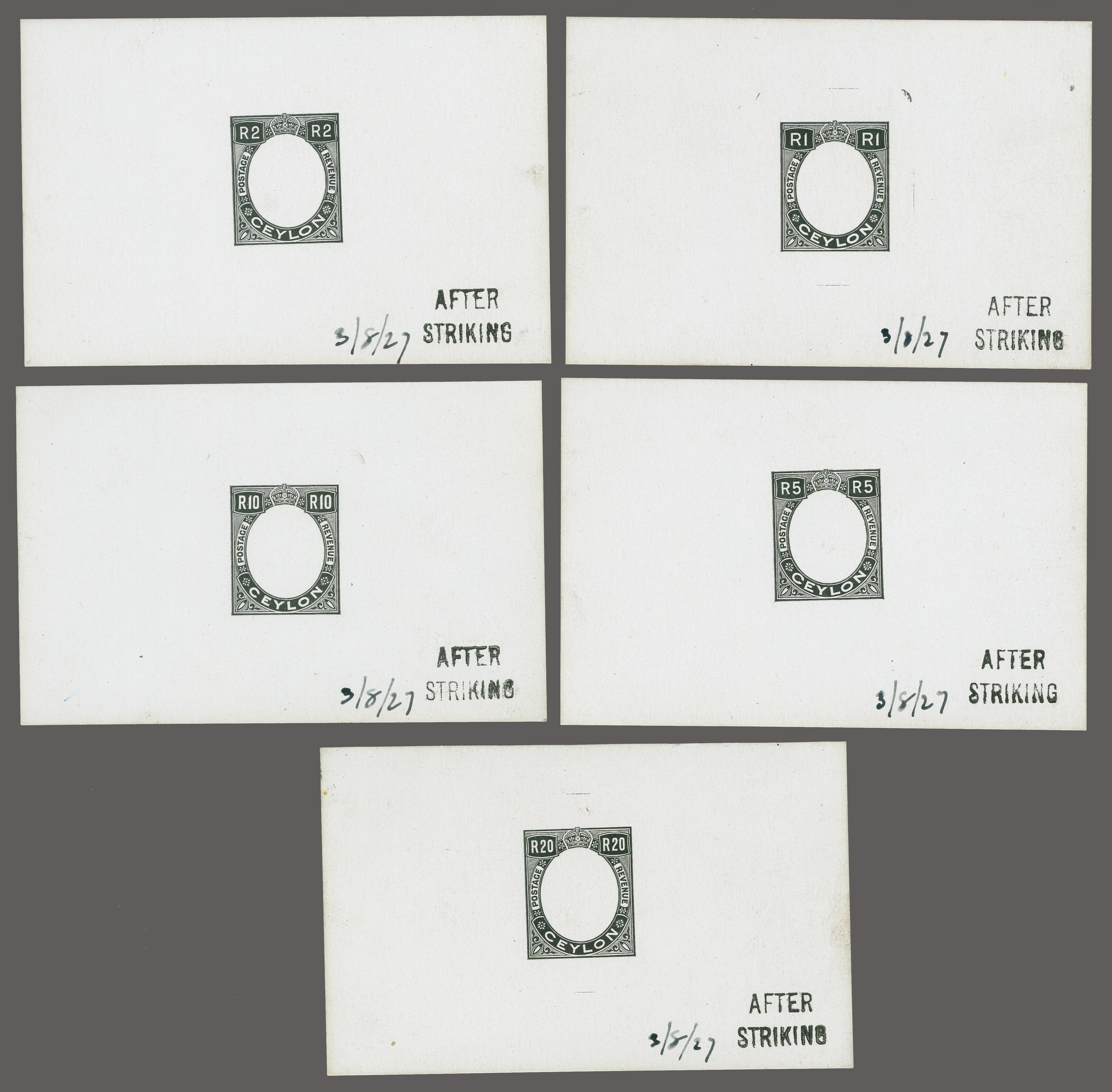 1927/29: De La Rue Die Proofs (5) for the 1 r., 2 r., 5 r., 10 r. and 20 rupee values, all frame only printed in black on glazed white card, each handstamped "AFTER / STRIKING" in black at lower right and each manuscript dated