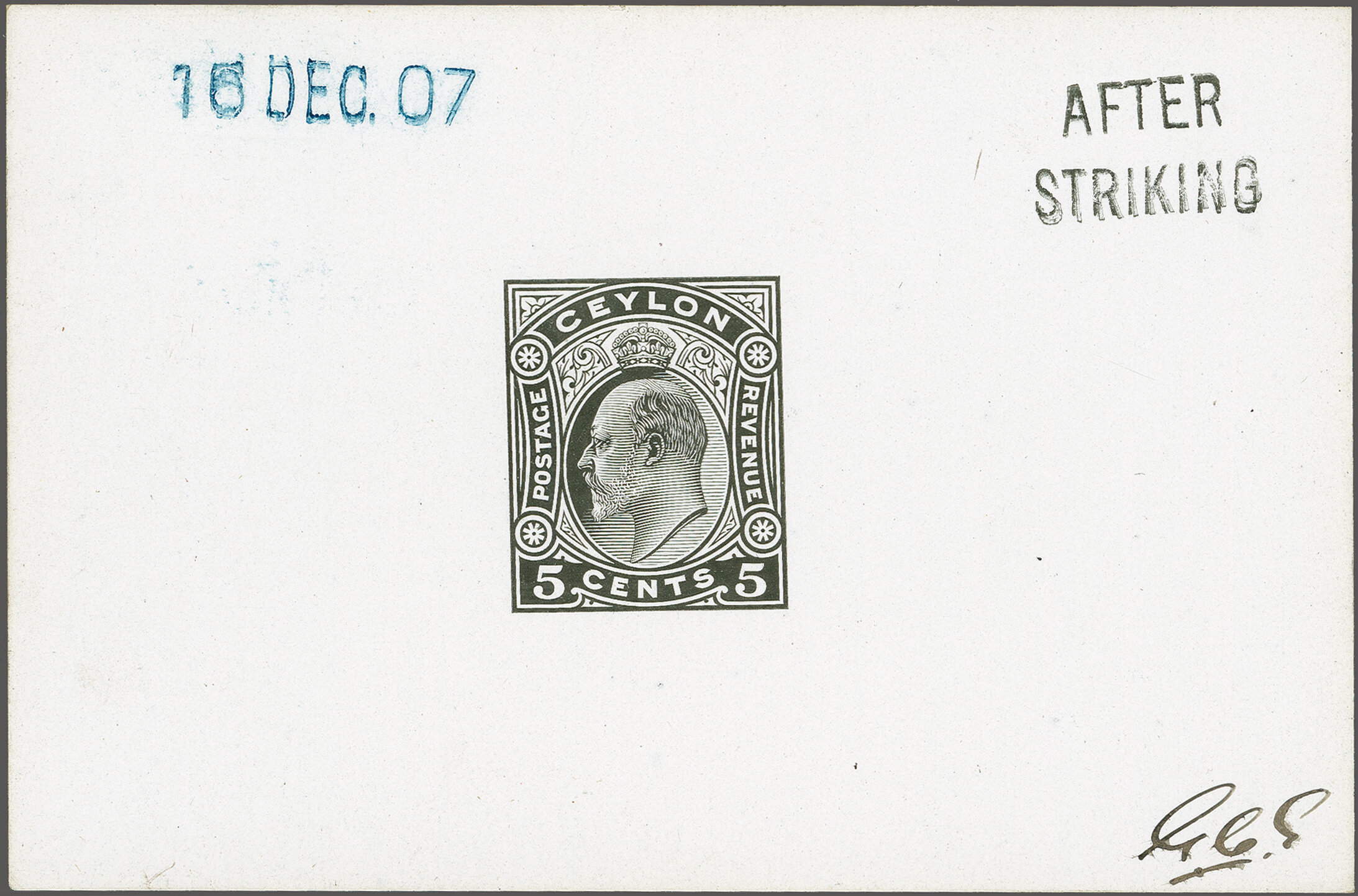 1907: De La Rue Die Proof for the completed 5 c. value, printed in black on glazed white card, handstamped "AFTER / STRIKING" in black at right and dated "16 DEC. 07" in blue at top, with manuscript "GCG" at lower right.