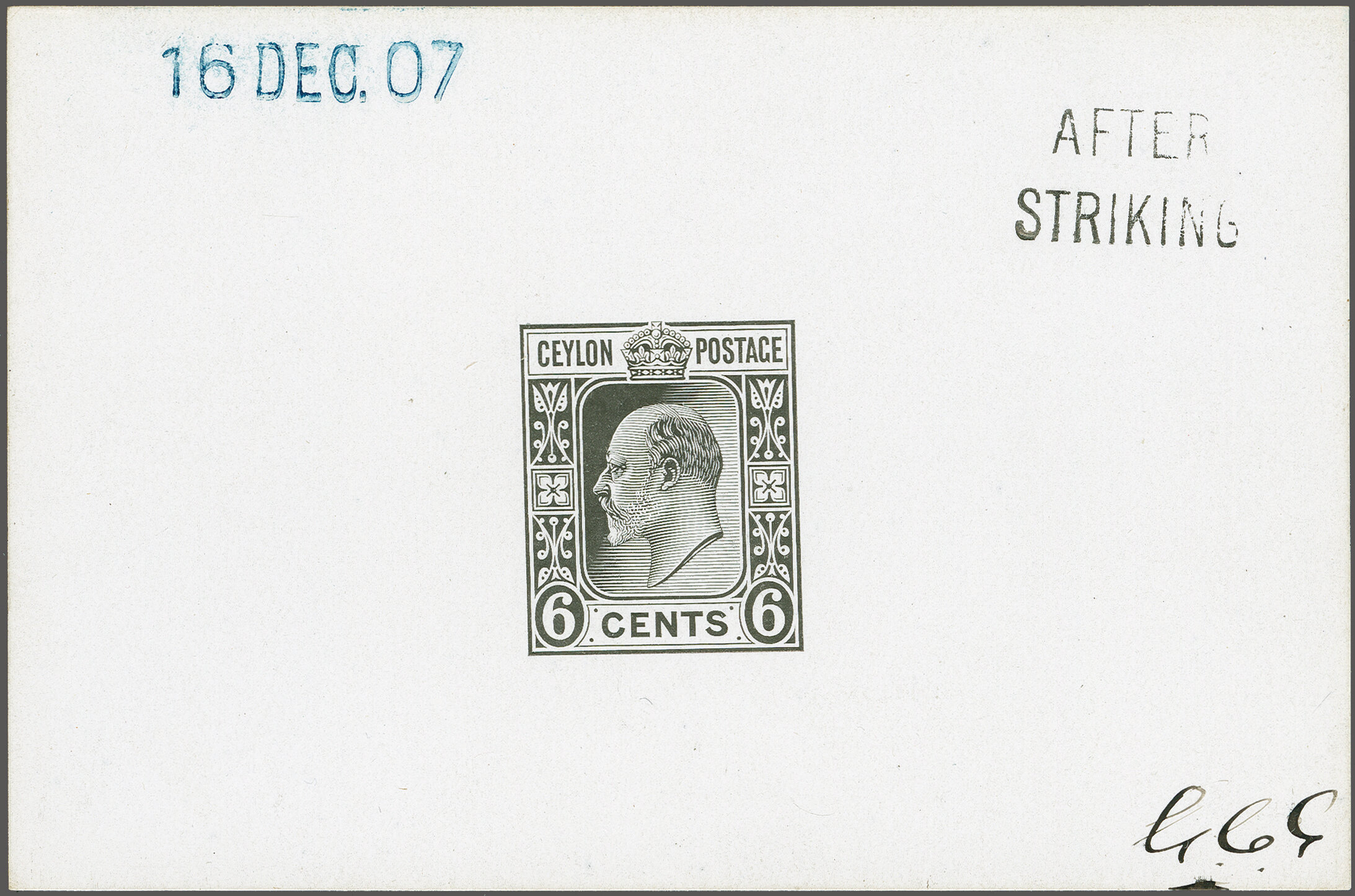 1907: De La Rue Die Proof for the completed 6 c. value, printed in black on glazed white card, handstamped "AFTER / STRIKING" in black at right and dated "16 DEC. 07" in blue at top, with manuscript "GCG" at lower right.