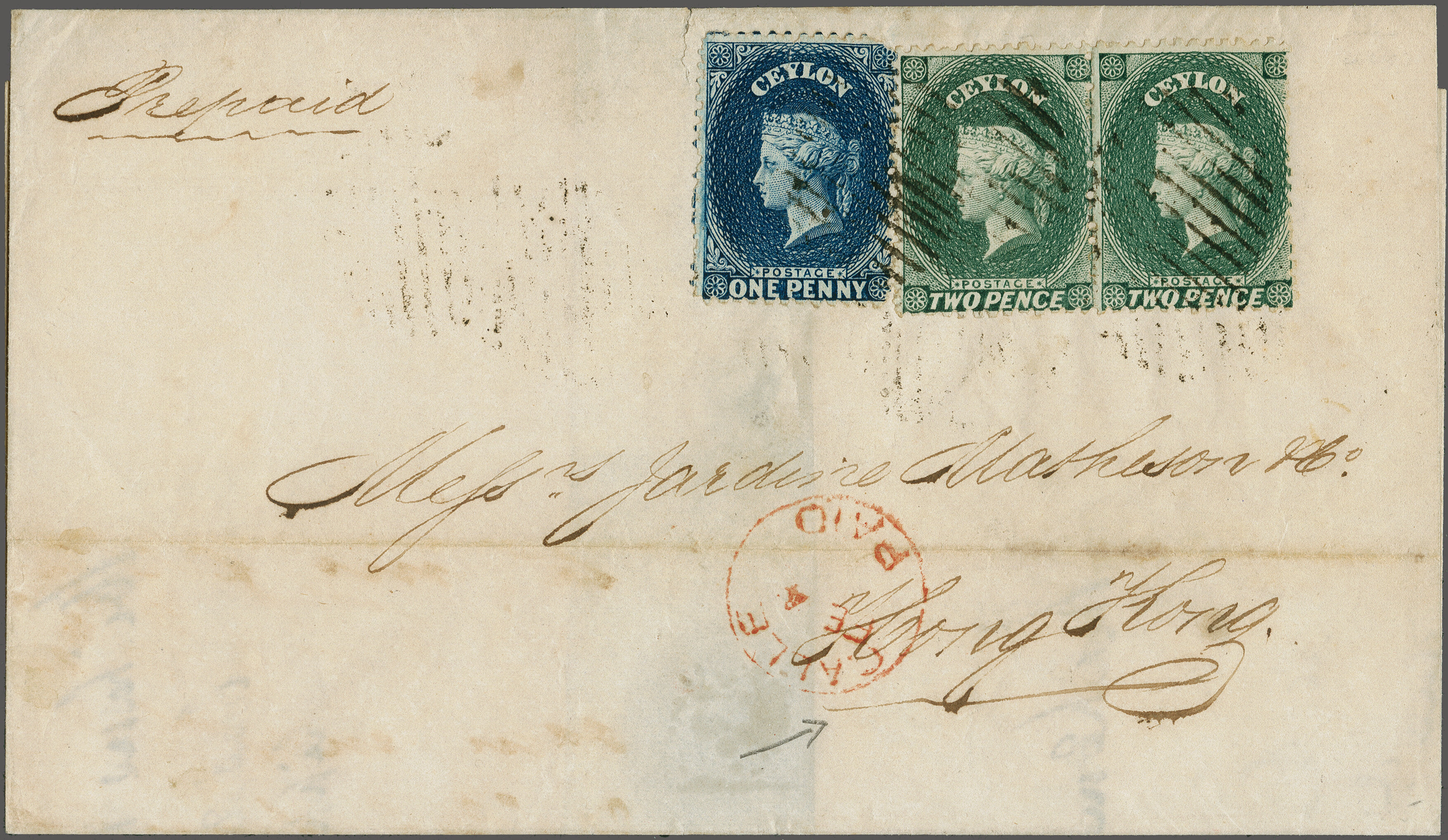 1866 (Feb 4): Folded cover to Hong Kong franked 1863/66 perf. 1 d. blue and pair 2 d. grey-green tied by barred cancel, "GALLE PAID" cds in red alongside, arrival "HONG-KONG" backstamp (Feb 21). (Image 1)