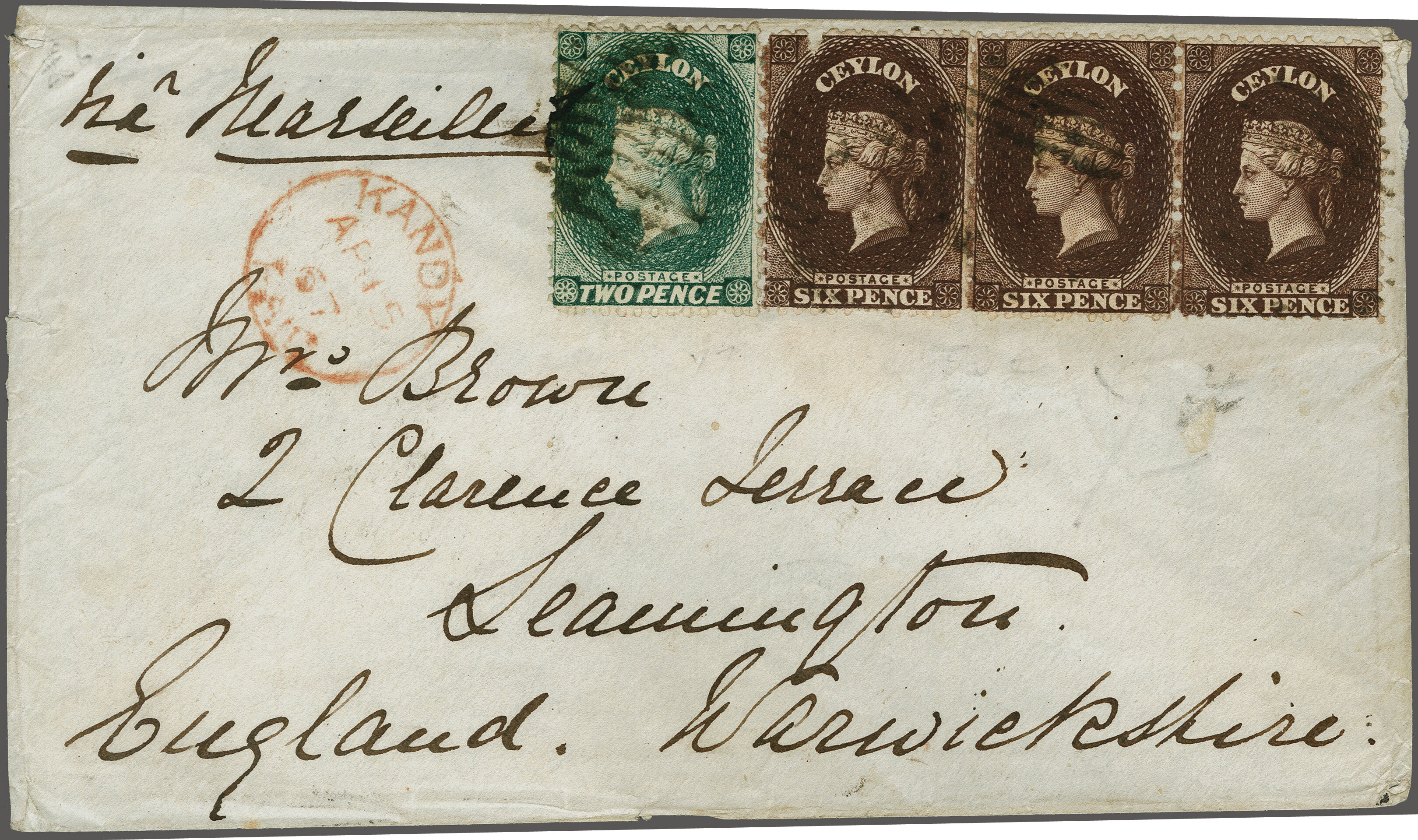obliterators, "KANDY PAID" despatch cds in red alongside, reverse with "GALLE PAID" in red and arrival (May 13) cds's. Small fault at top of first 6 d. adhesive, a scarce franking. Provenance: Rev. G.E.K. Cornwall-Brooks, Harmers, London, 20 March