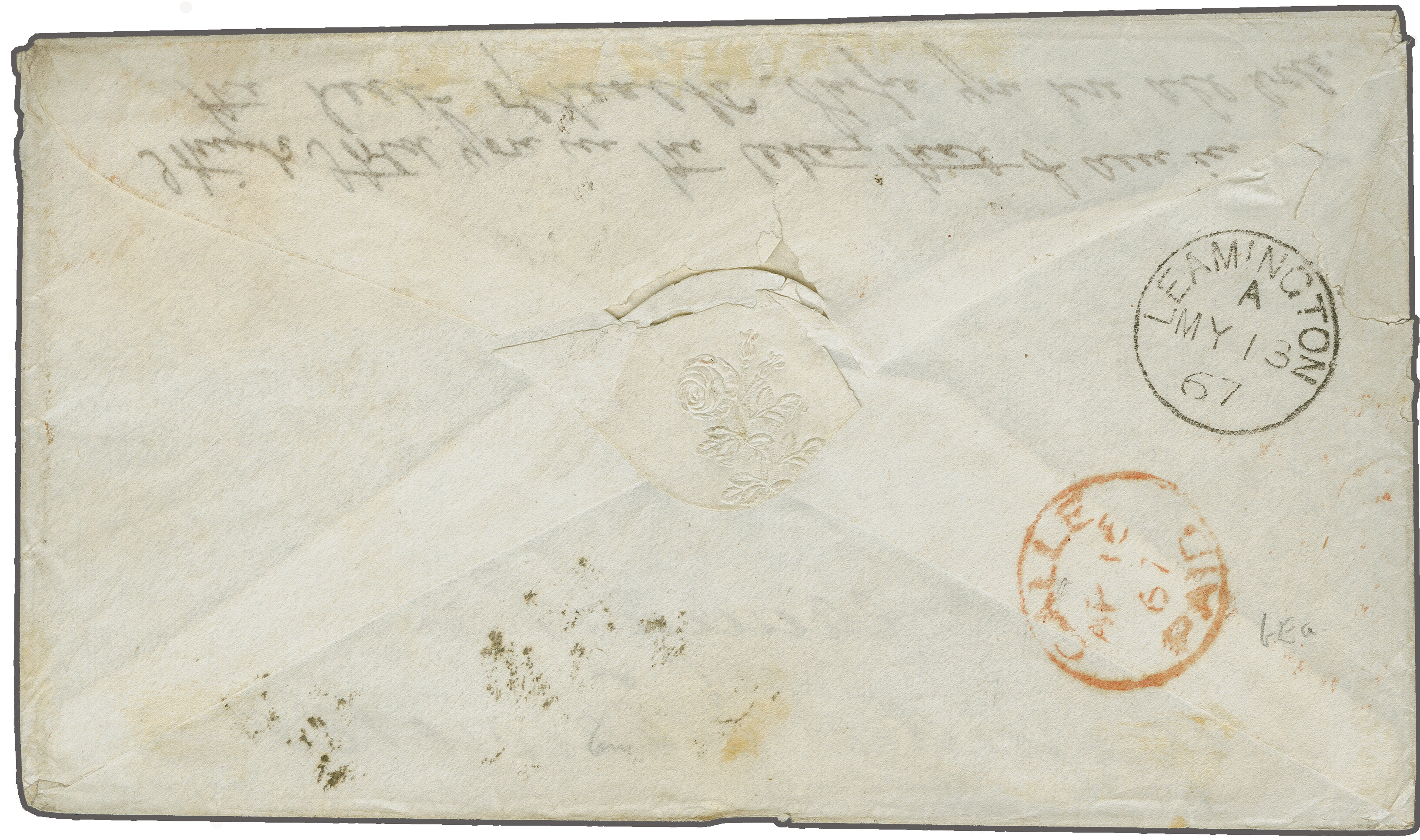 1867 (April 15): Envelope to Leamington, England endorsed "Via Marseilles", franked 1863/66 Recess De La Rue 2 d. grey-green and 6 d. blackish-brown in a single and pair, wmk Crown CC, perf. 12½, cancelled by barred