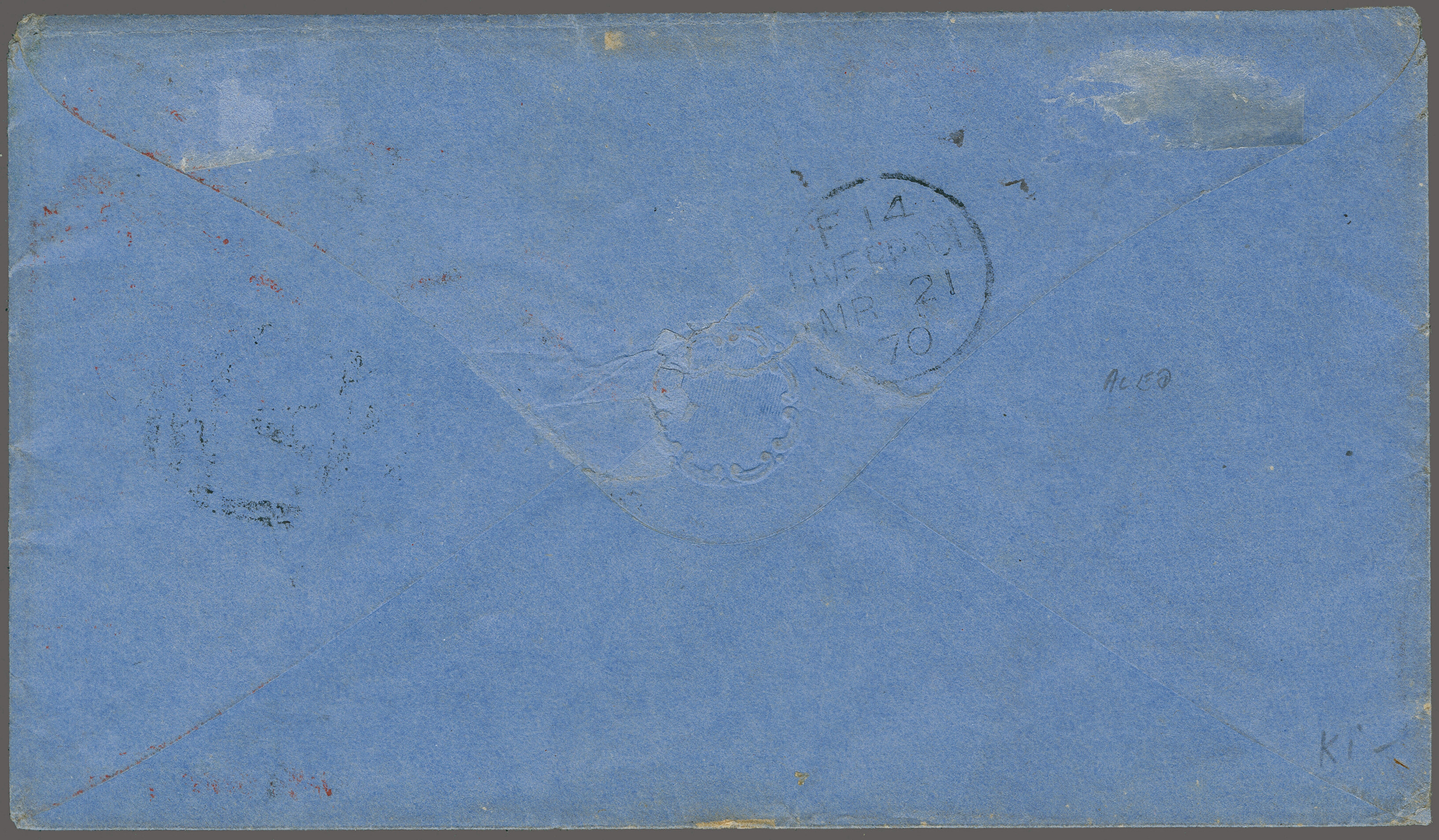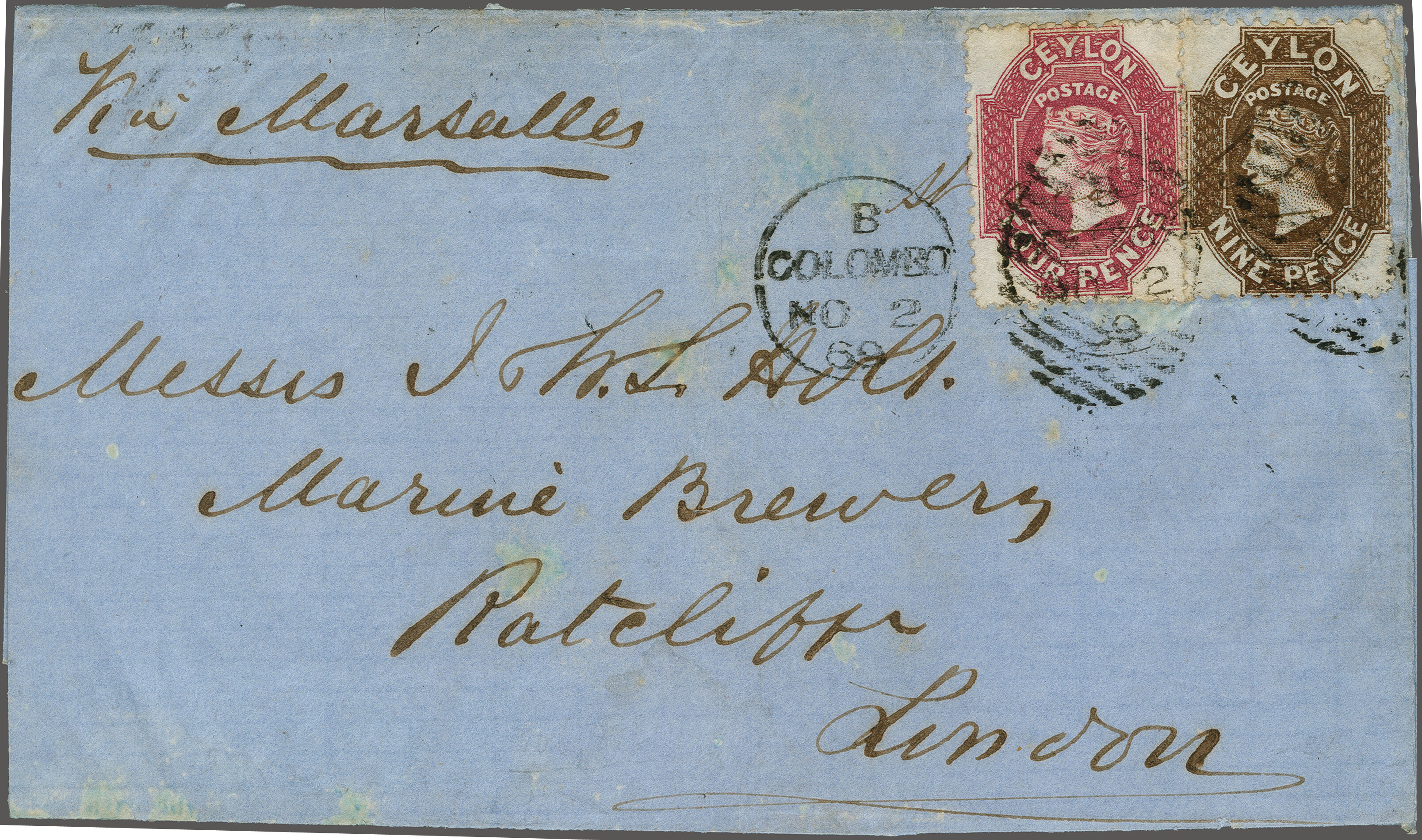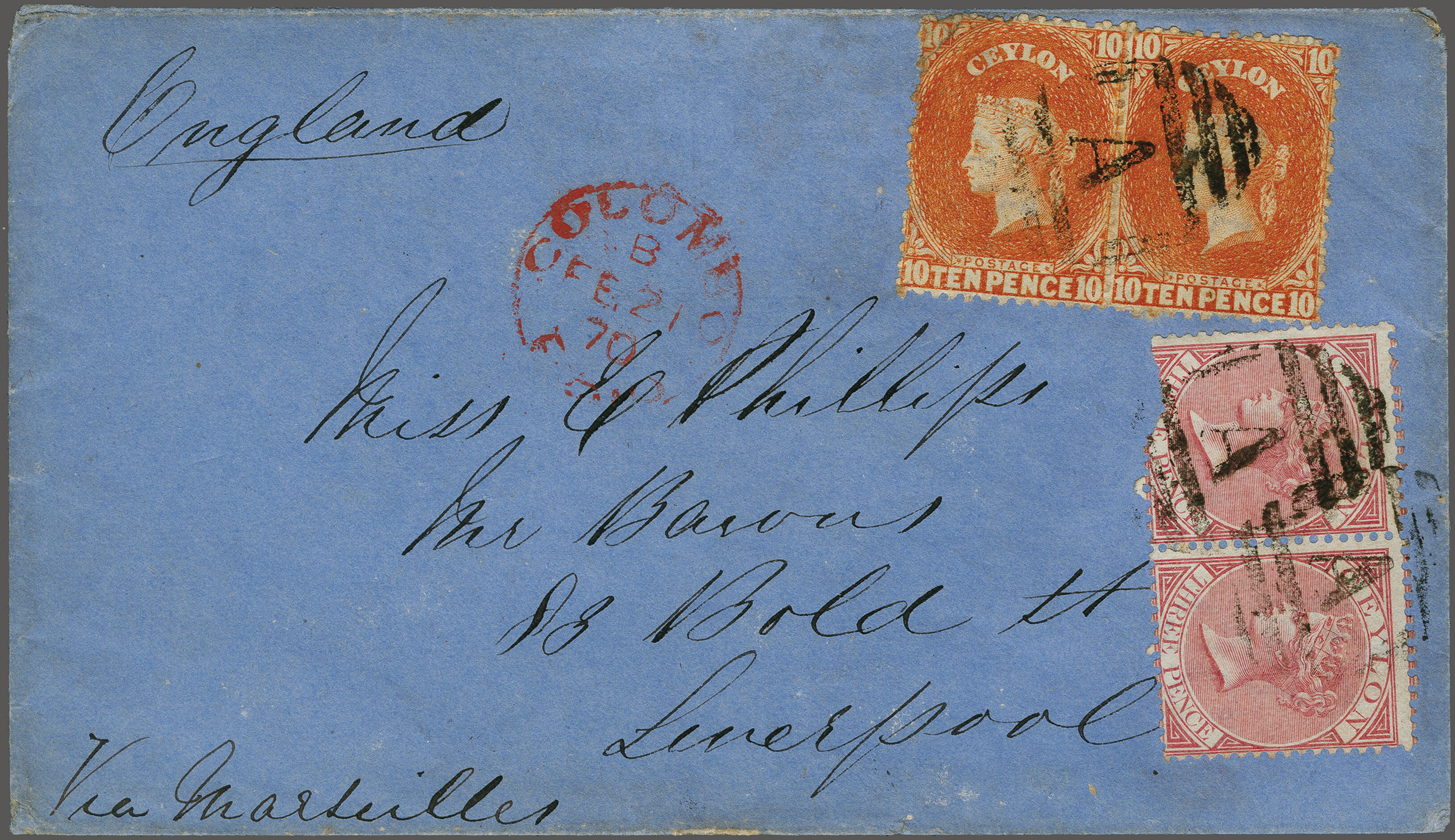 1870 (Feb 21): Double rate envelope from Colombo to Liverpool, endorsed "Via Marseilles", bearing horizontal pairs of 1867 3 d. carmine-rose, one defective, and 1870 10 d. orange, one with corner fault, both cancelled by 'A'