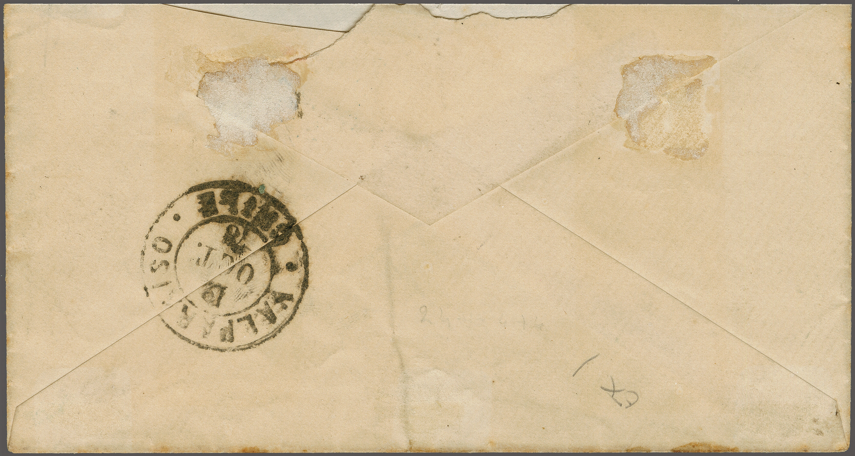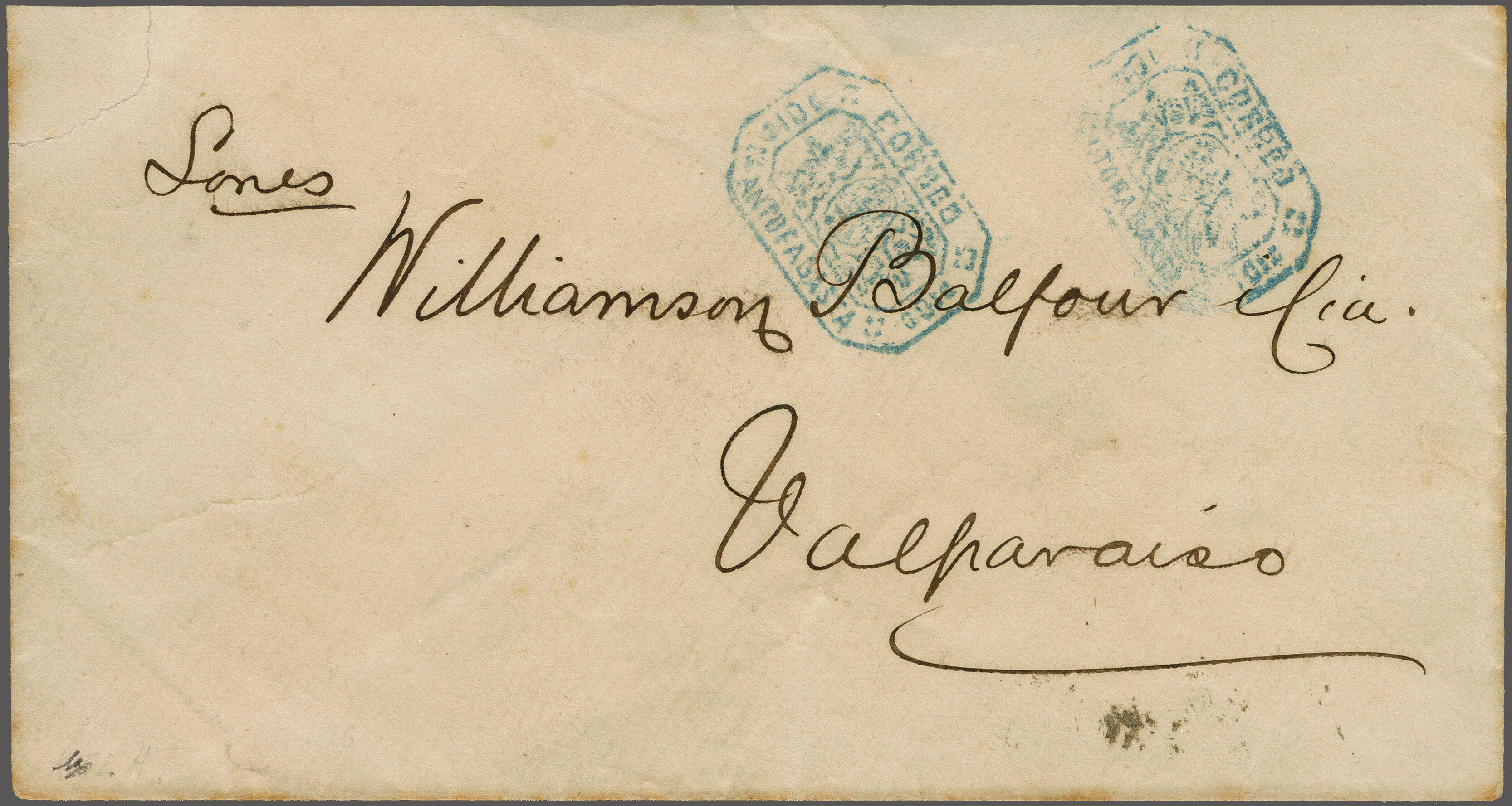 Antofagasta 1878: Cover from Antofagasta to Valparaiso during stamp shortage period, struck with two impressions of octagonal framed "CORREO / ANTOFAGASTA / 10 c." in blue paying the 20 centavos rate, with Valparaiso arrival