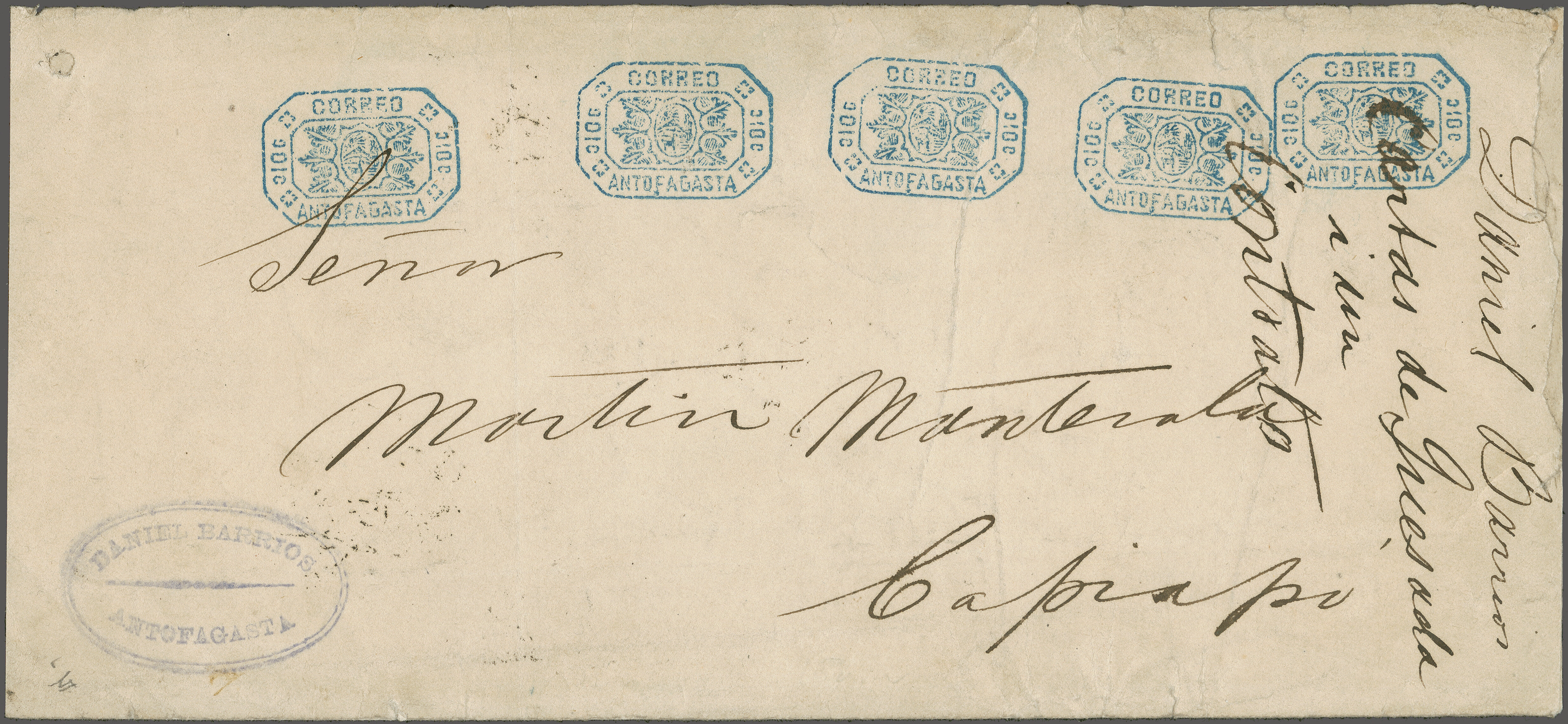 1879: Cover from Antofagasta with sender's cachet at left mailed to Copiapo, Chile at quintuple rate, struck with five impressions of the octagonal 10 c. "Correo / Antofagasta" frank marking in blue; reverse with COPIAPO