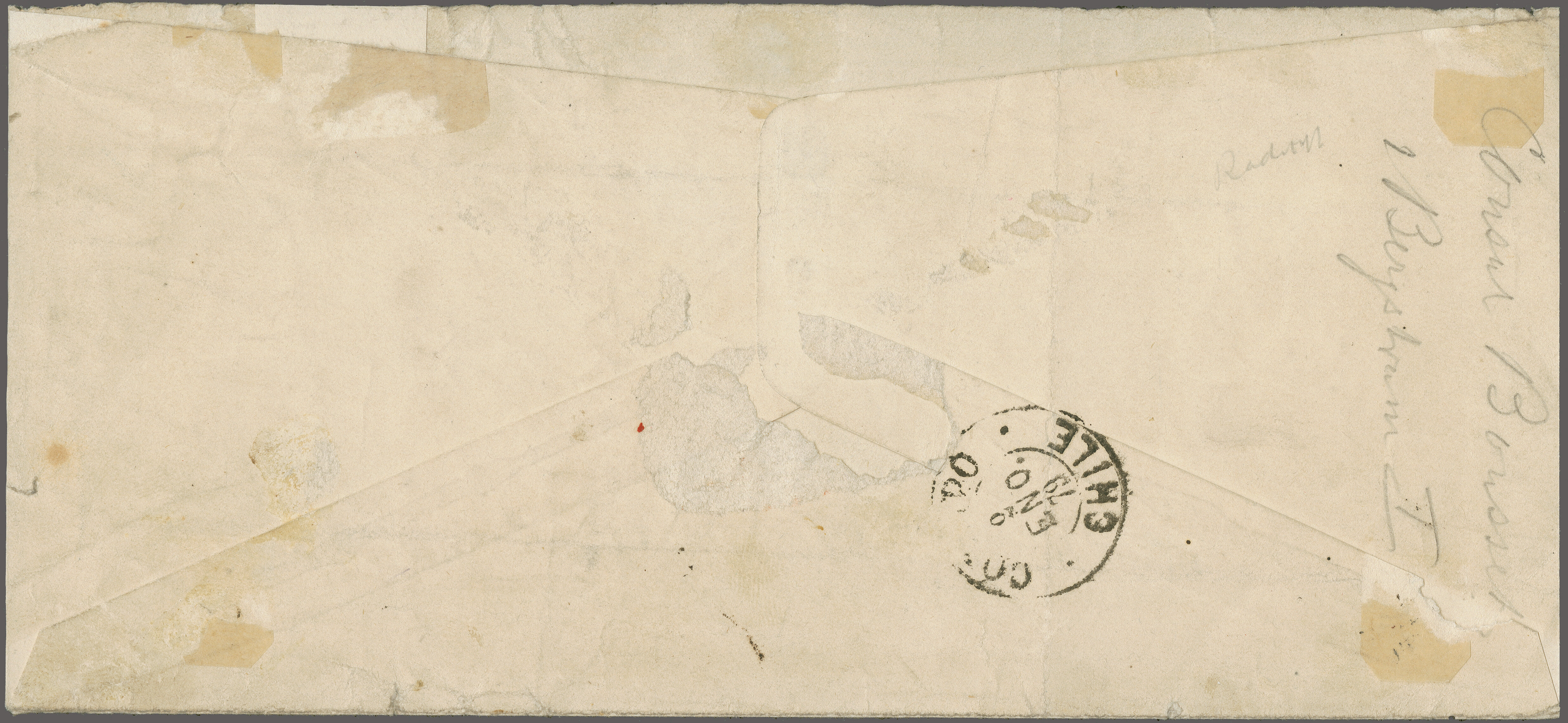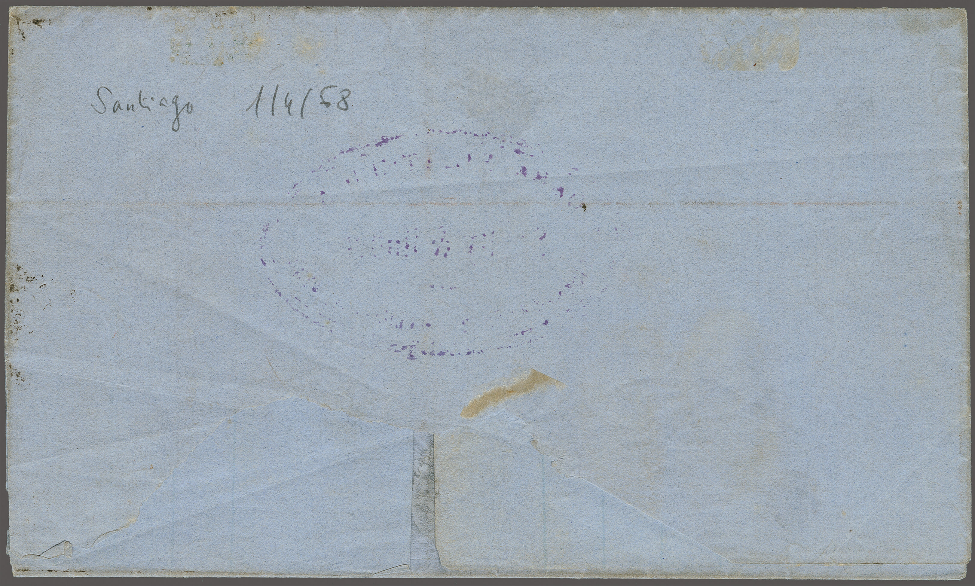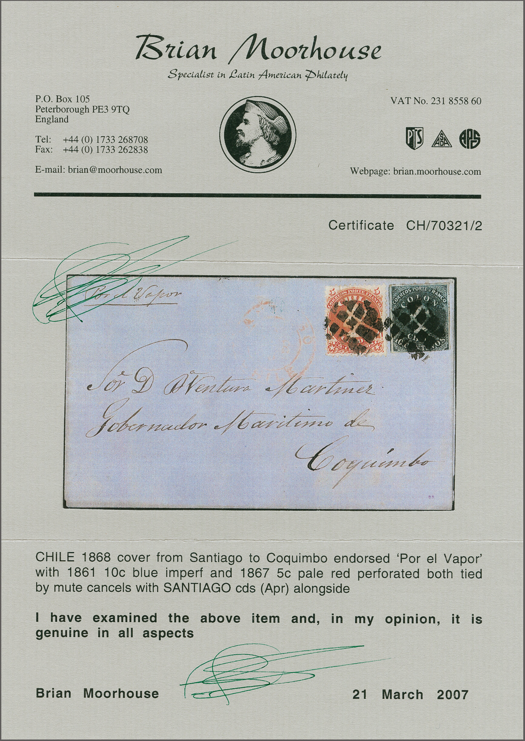 the other used in similar fashion in 1861 from Serena (Sept 5) to Santiago tied by "CANCELLED" obliterators in black Gi = £ 340+/Scott = $ 400+. (Image 1)