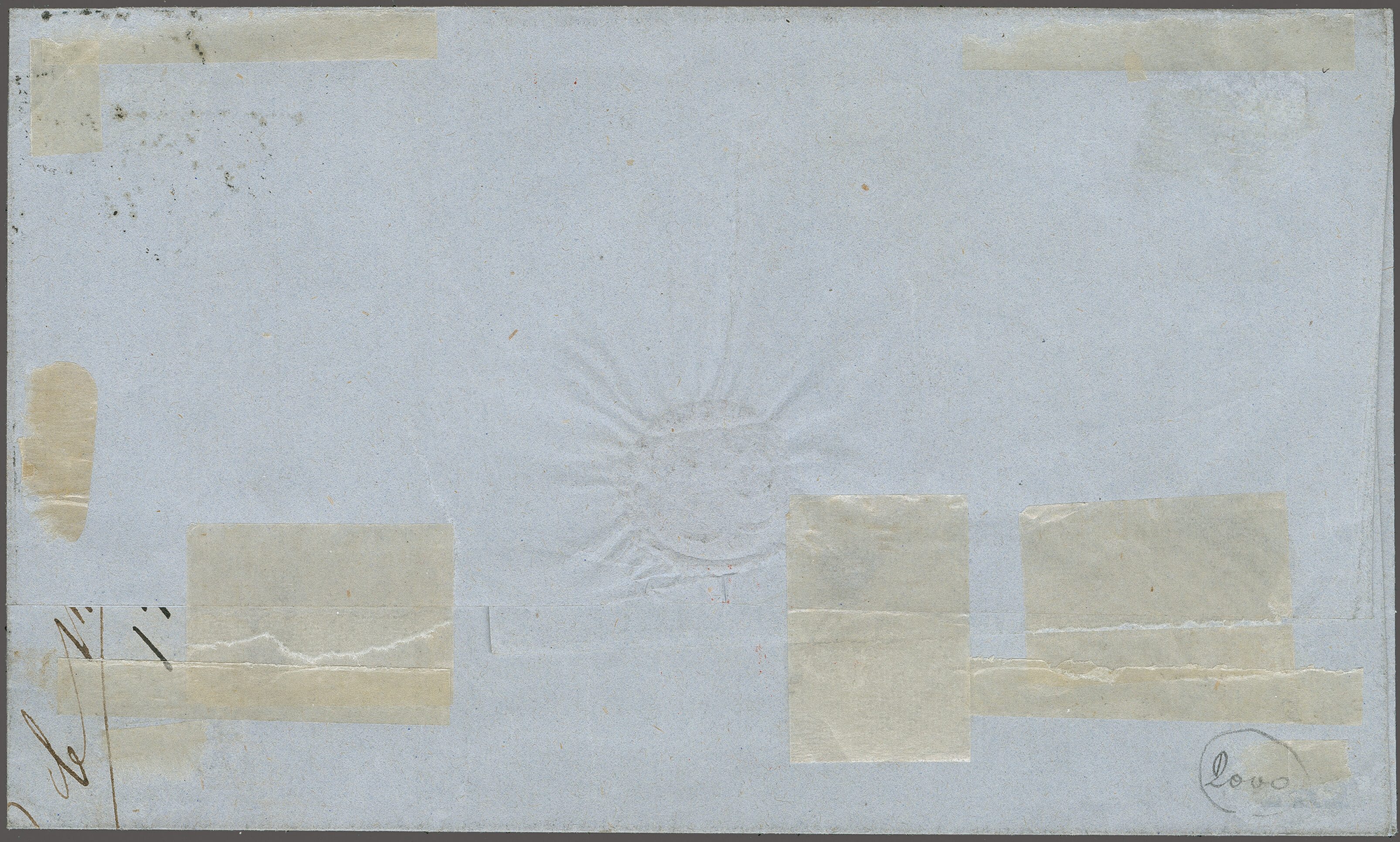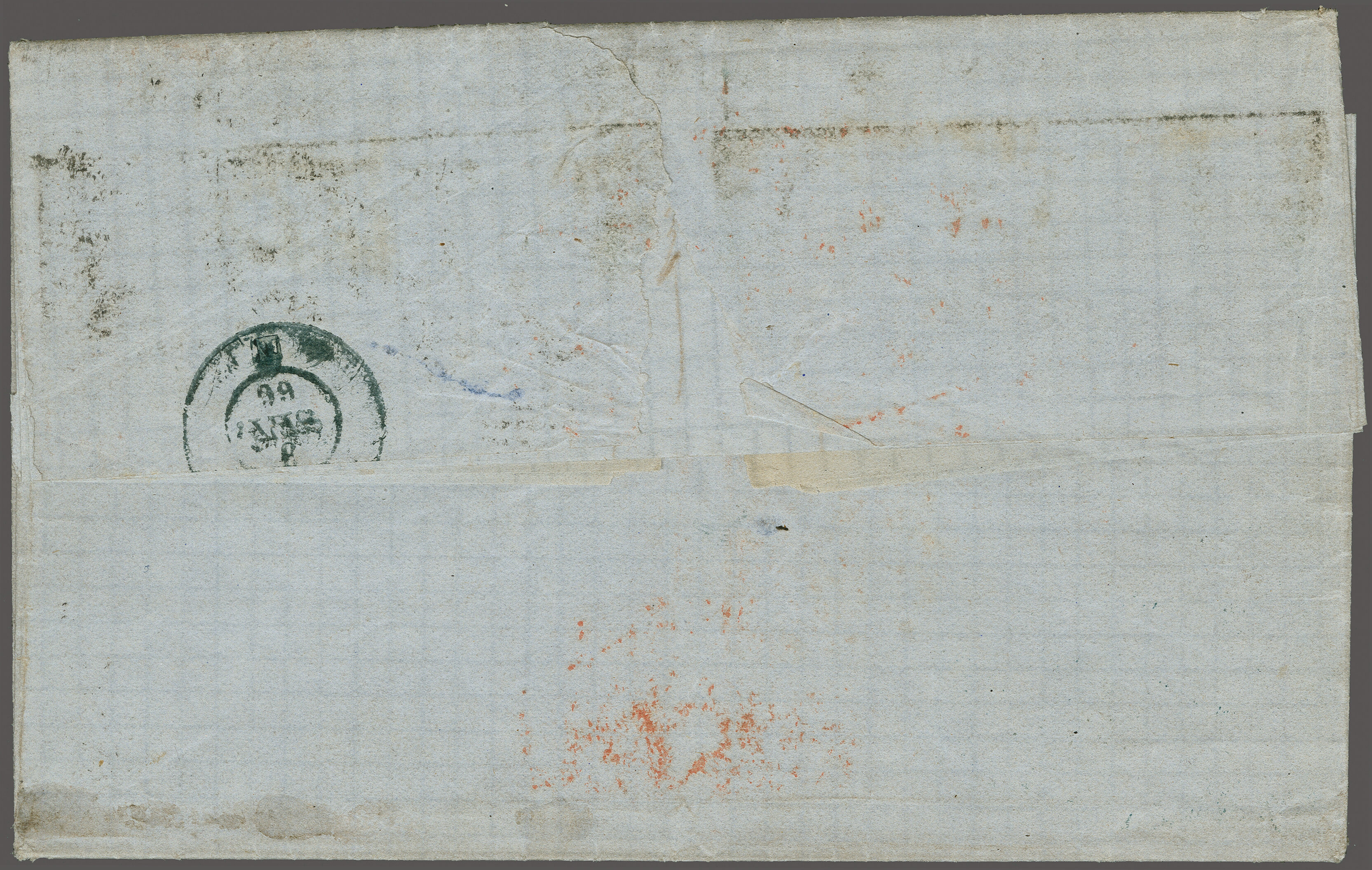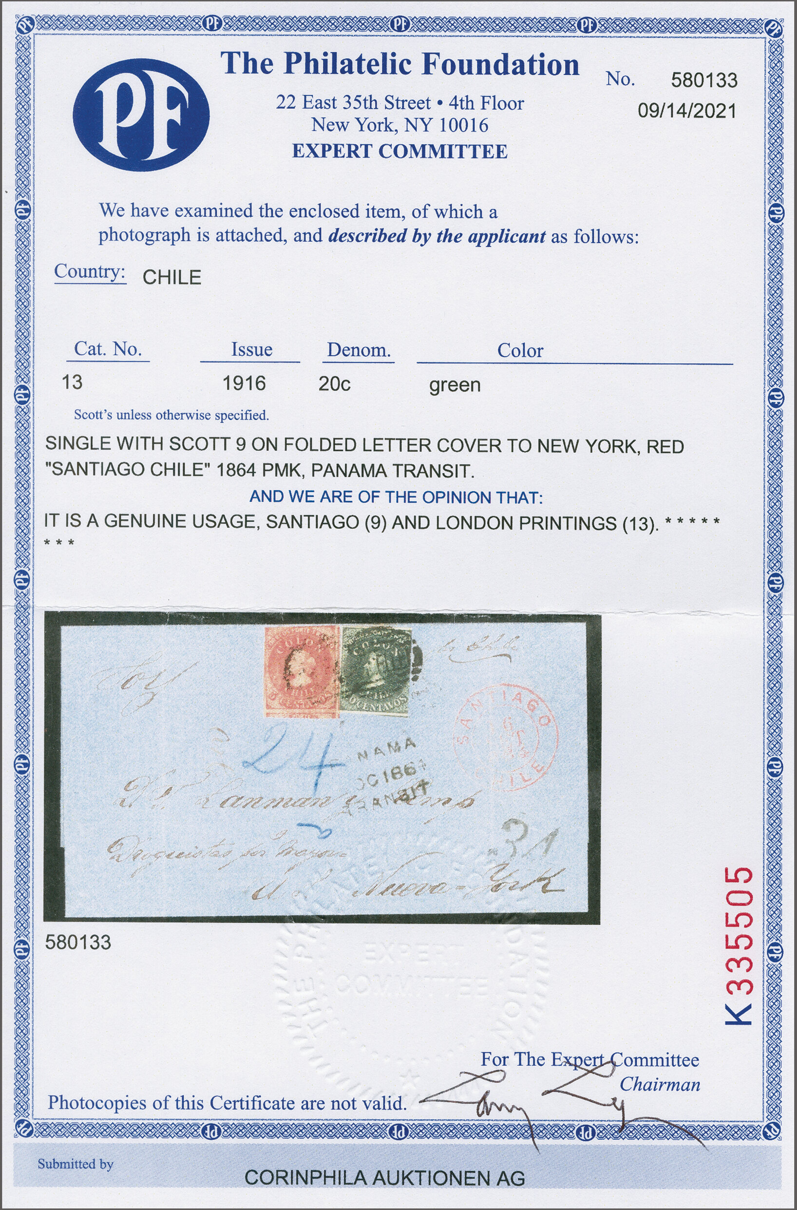 the other used in similar fashion in 1861 from Serena (Sept 5) to Santiago tied by "CANCELLED" obliterators in black Gi = £ 340+/Scott = $ 400+. (Image 1)