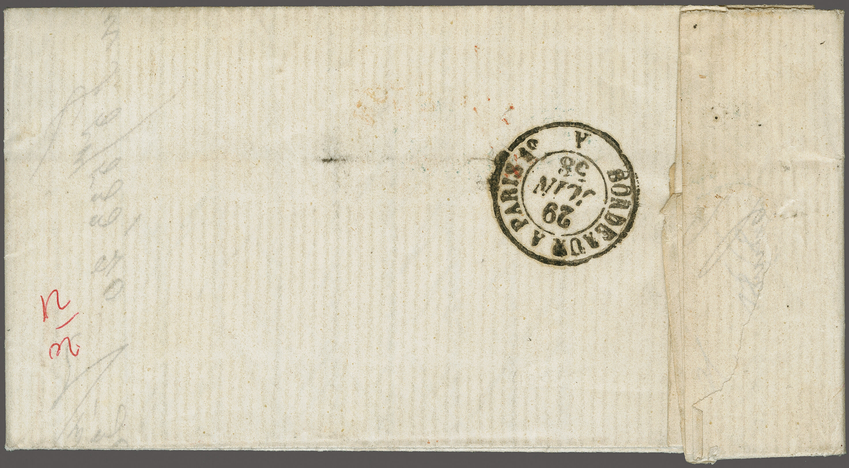 despatch cds of Libourne (June 29) alongside. London transit cds in red (July 1) and Chile circular "15" centavos due marking in red. An attractive entire. Signed Calves. (Image 1)