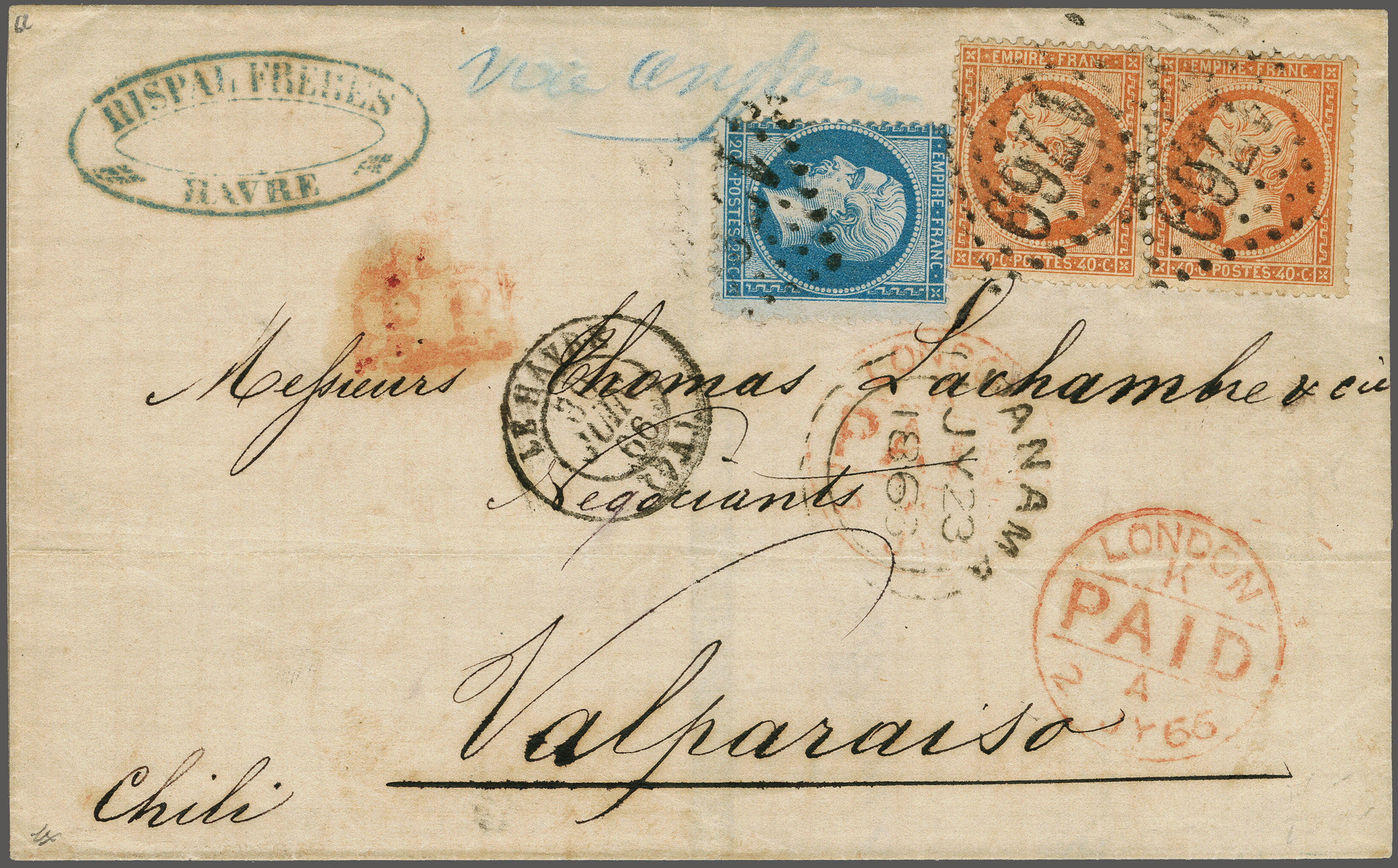 Incoming Mail 1862/63: France 20 c. blue and 40 c. orange in a horizontal pair, used on 1865 cover from Le Havre to Valparaiso endorsed "voie Anglaise" at top, tied by gros chiffres '1769' in black. 'London / Paid' transit cds