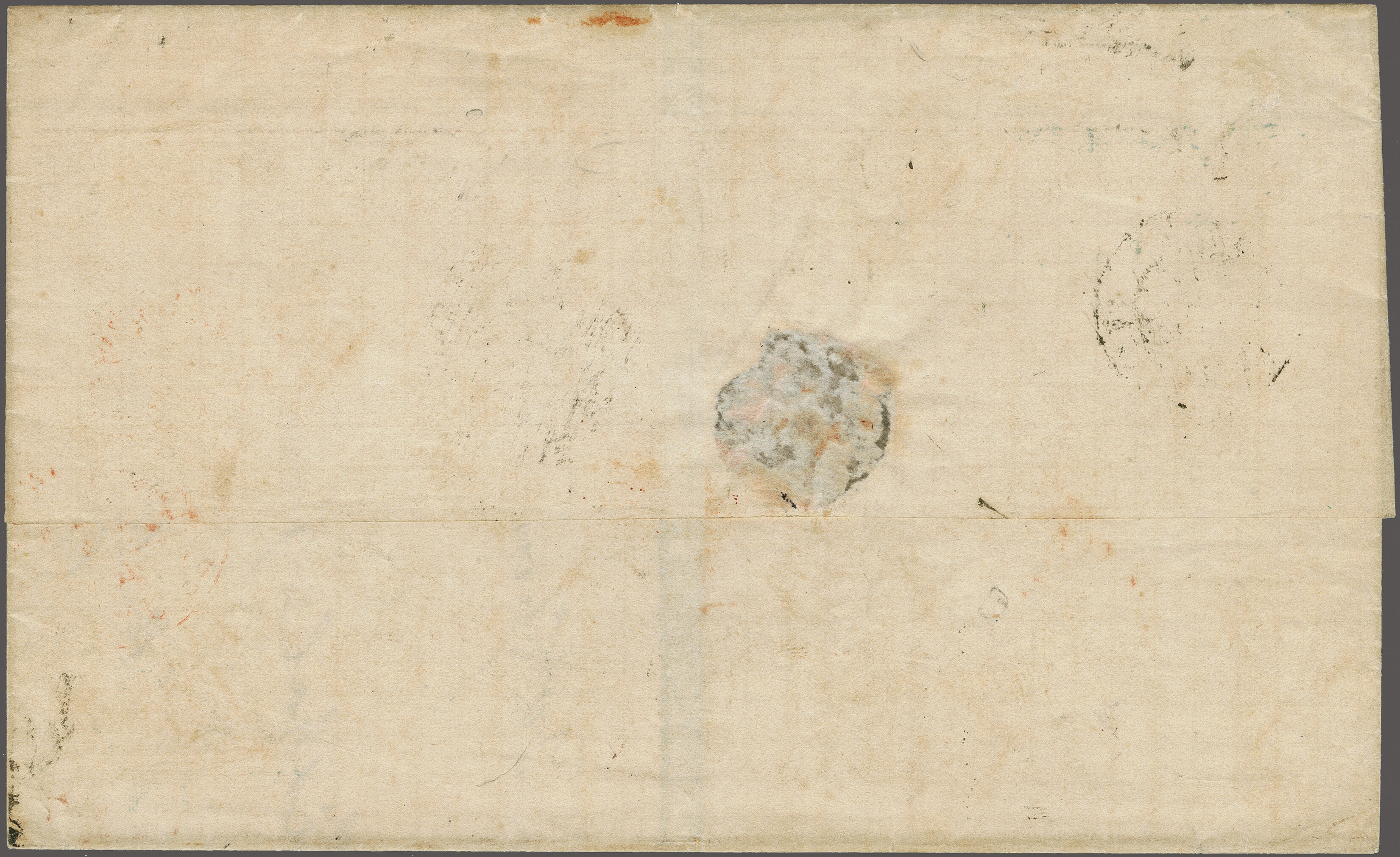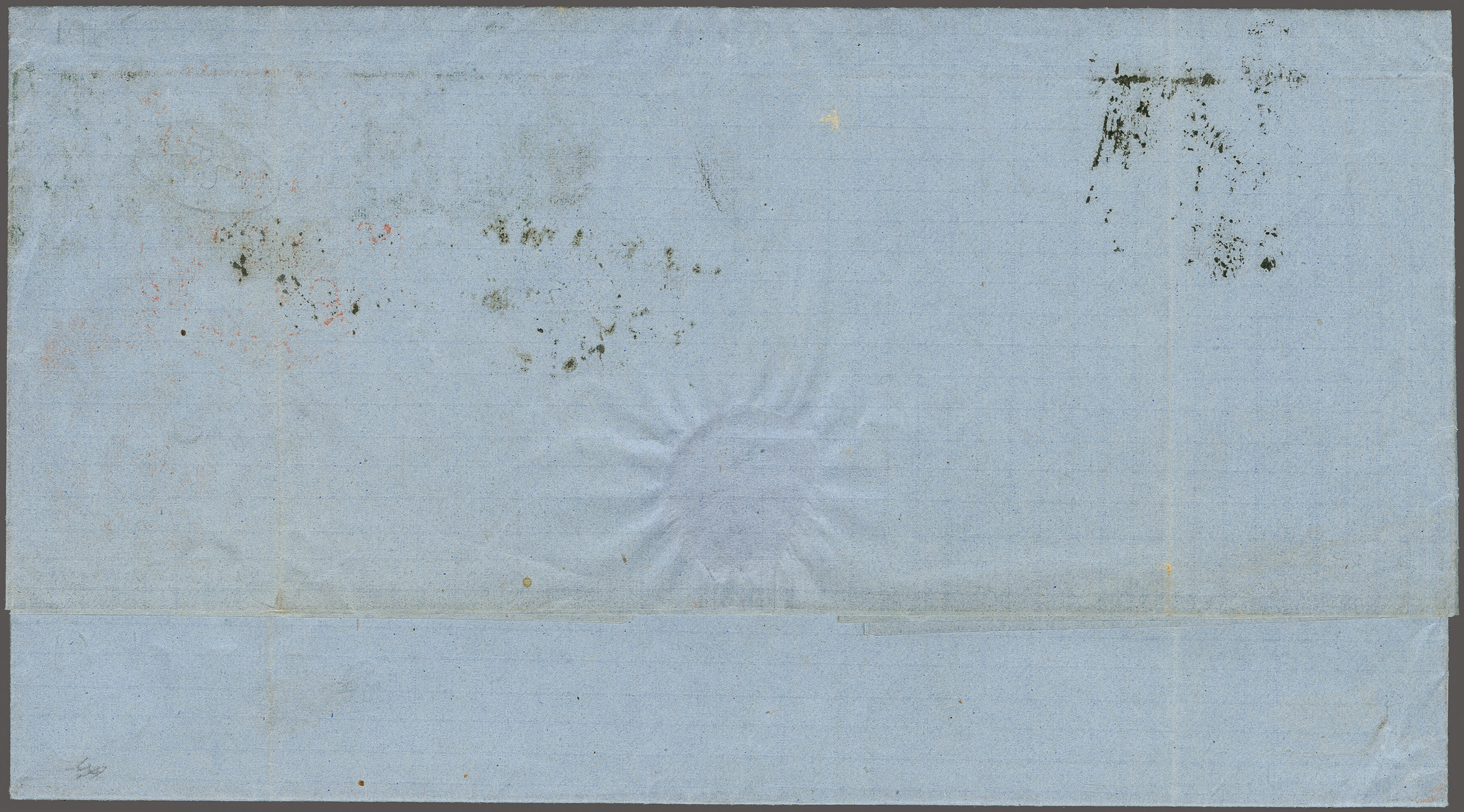 arrival cds (January 2) in black. Some contemporary docketing explaining contents "Daniel Barrios, Cartas de Quesada i un Contrato". Edge faults but very rare - the highest recorded franking. Ex the Brian Moorhouse estate. (Image 1)