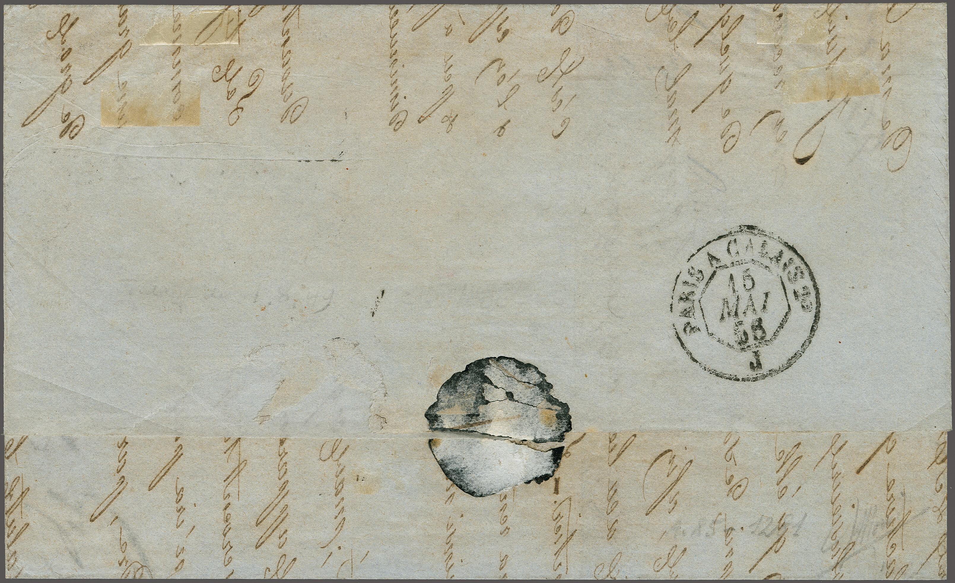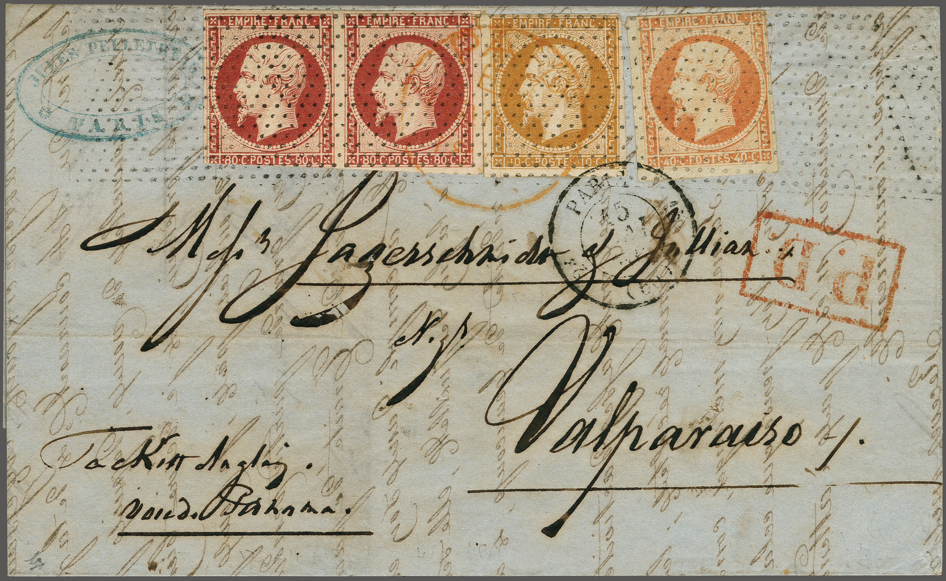 Incoming Mail 1853: France 10 c. bistre, 40 c. orange and 80 c. carmine in a horizontal pair, margins large to shaved, used on 15 May 1858 cover from Paris to Valparaiso endorsed "Packet Anglais voie de Panama", all tied