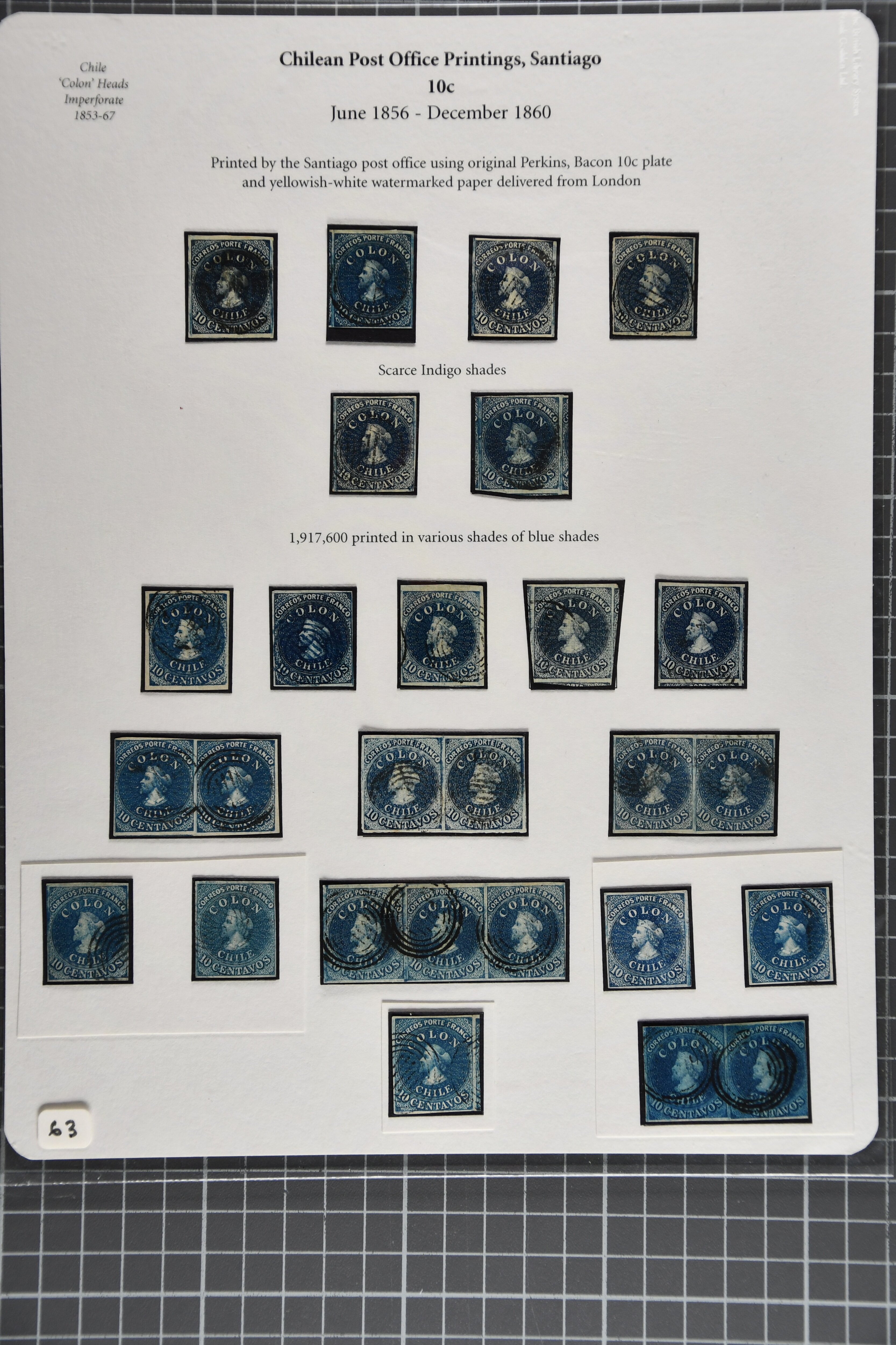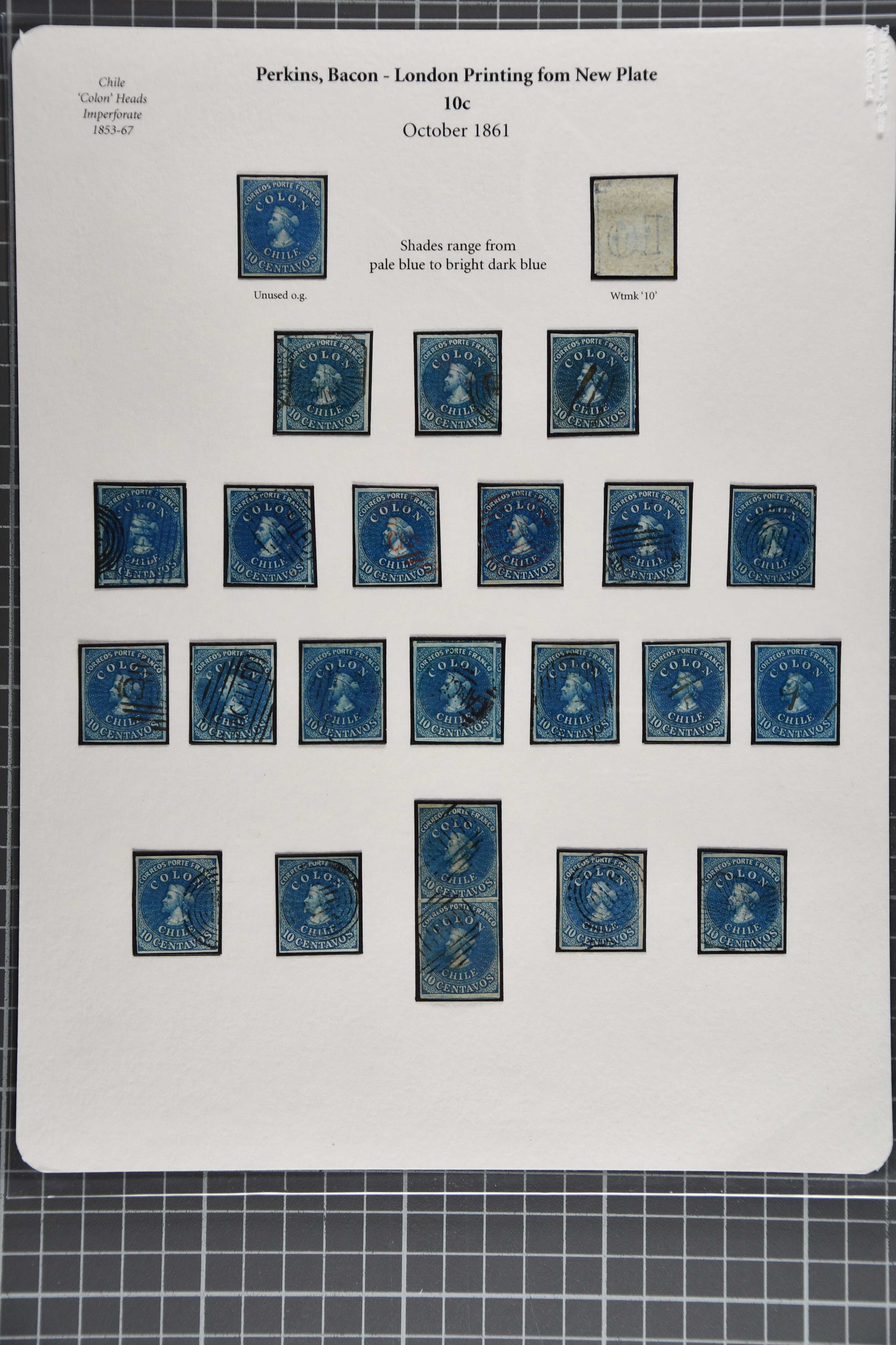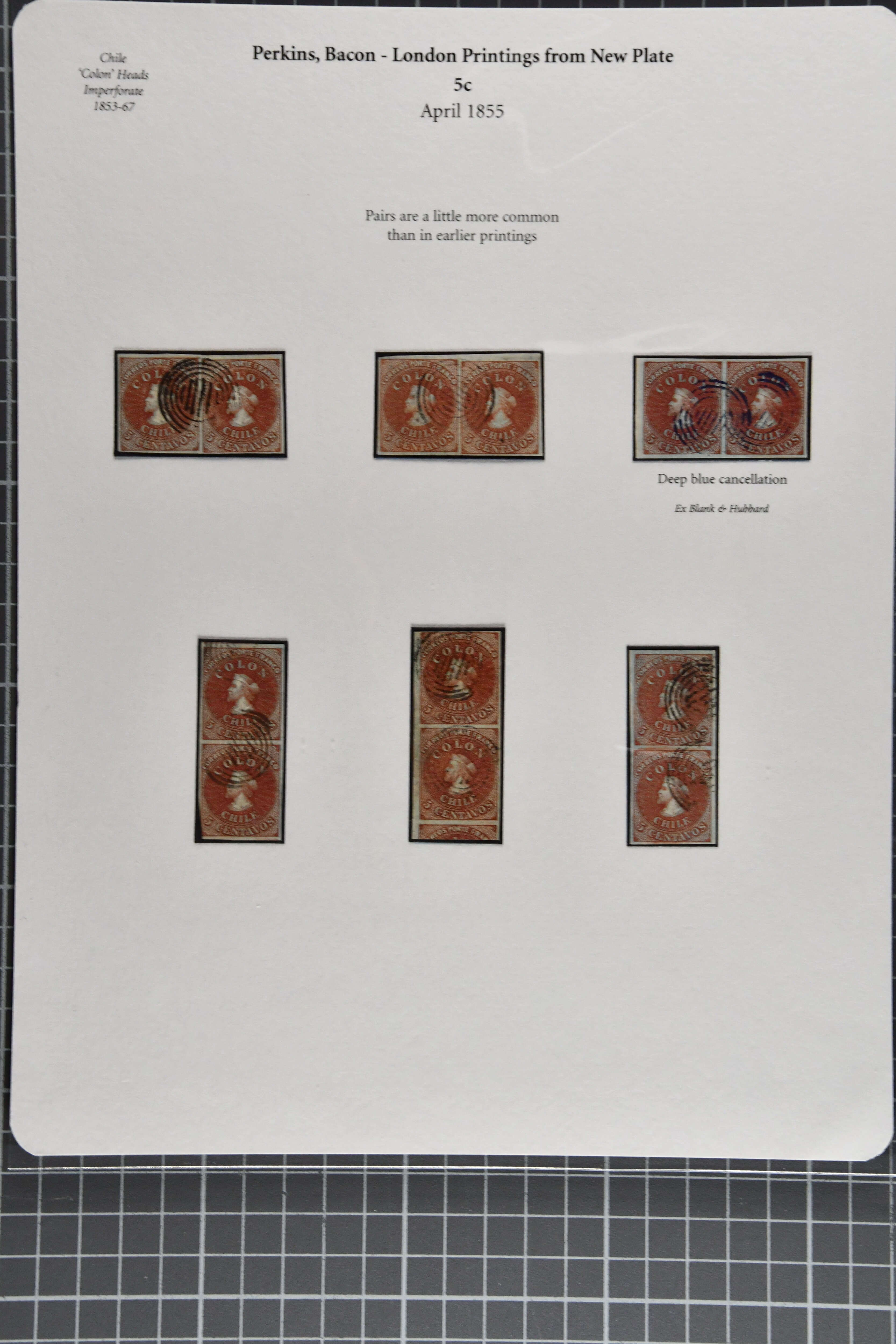the original sharp impressions and the later poor quality impressions, with one single example cancelled by blue target handstamp, the balance in black (but for a late impression with part CURICO handstamp); one pair showing an almost suffused colour