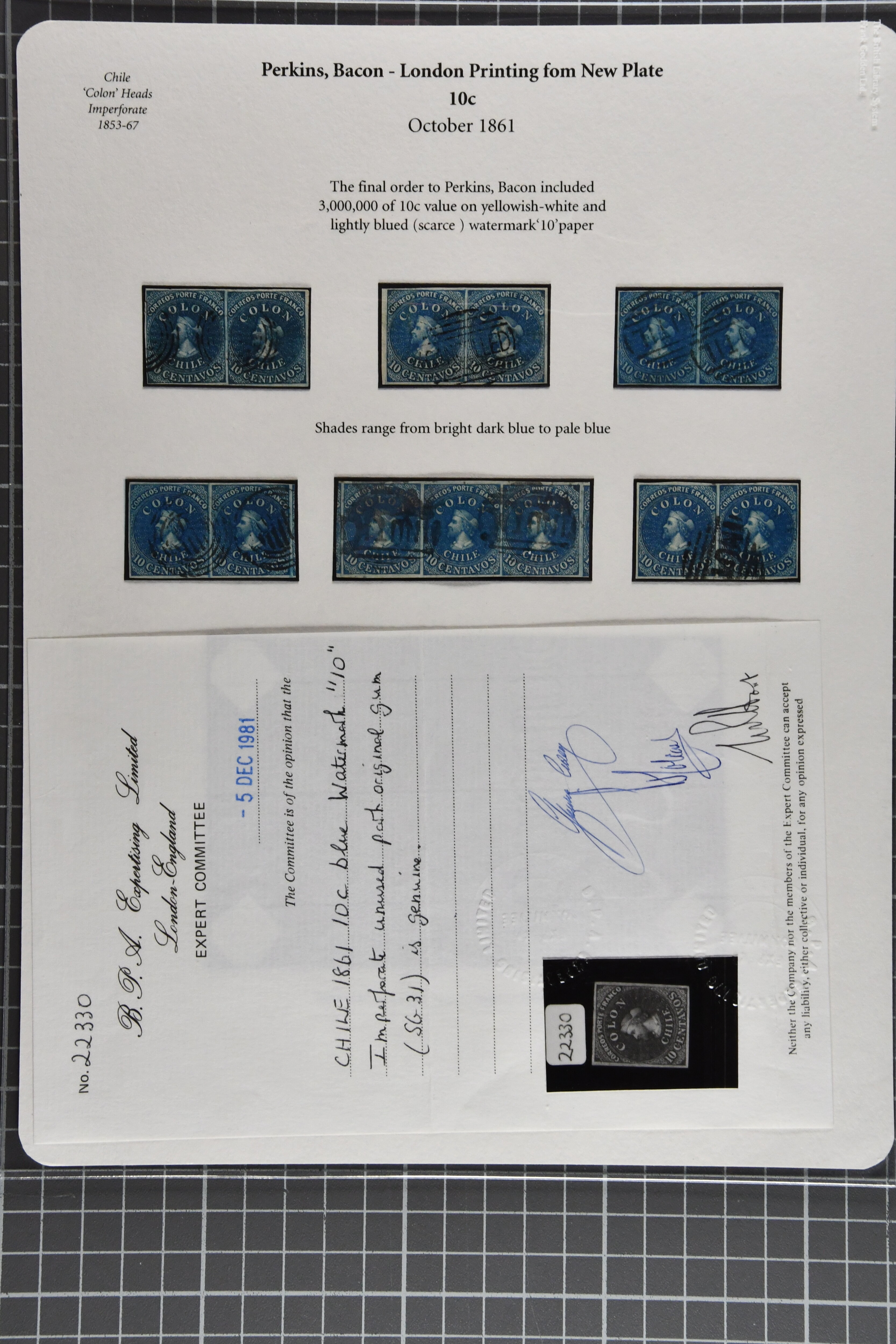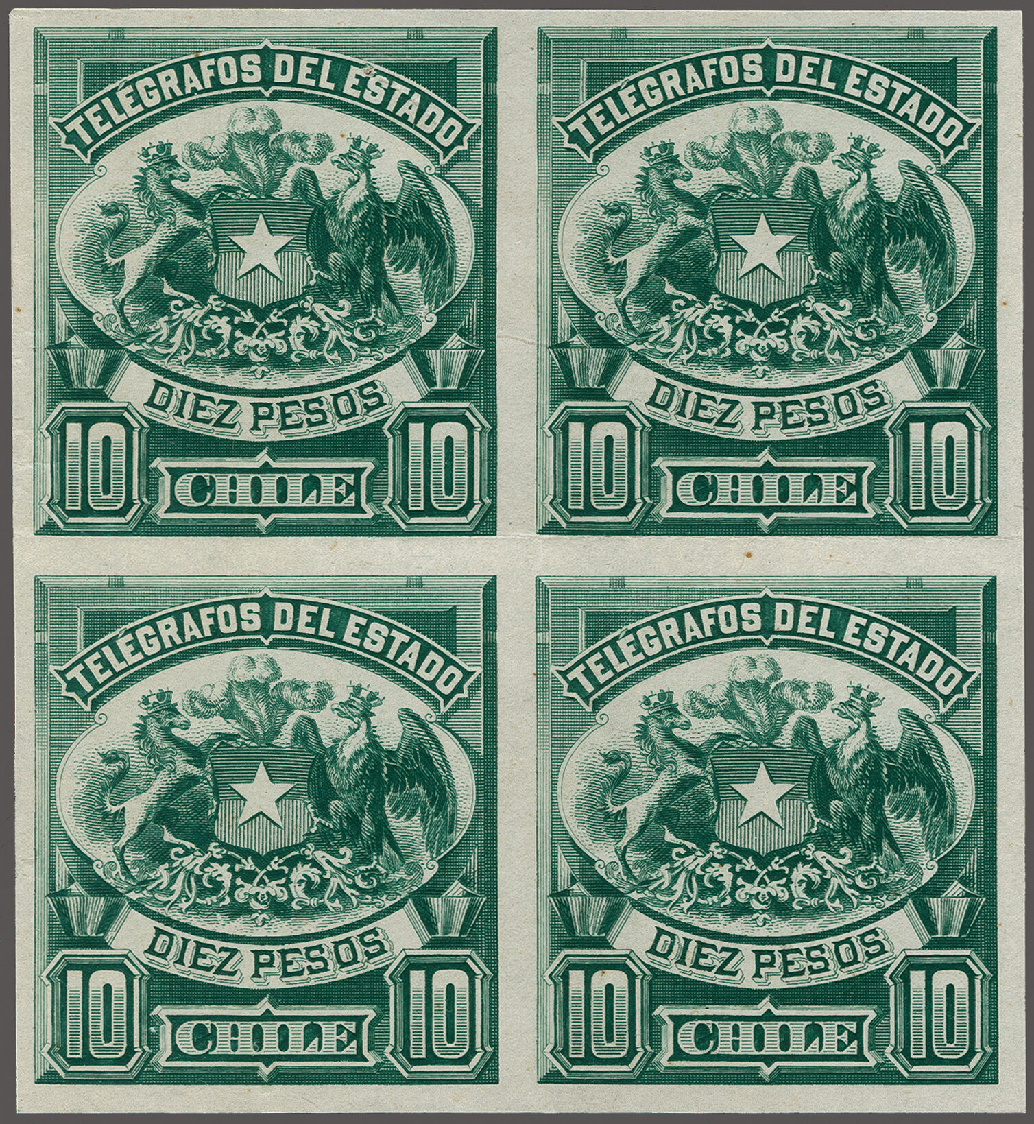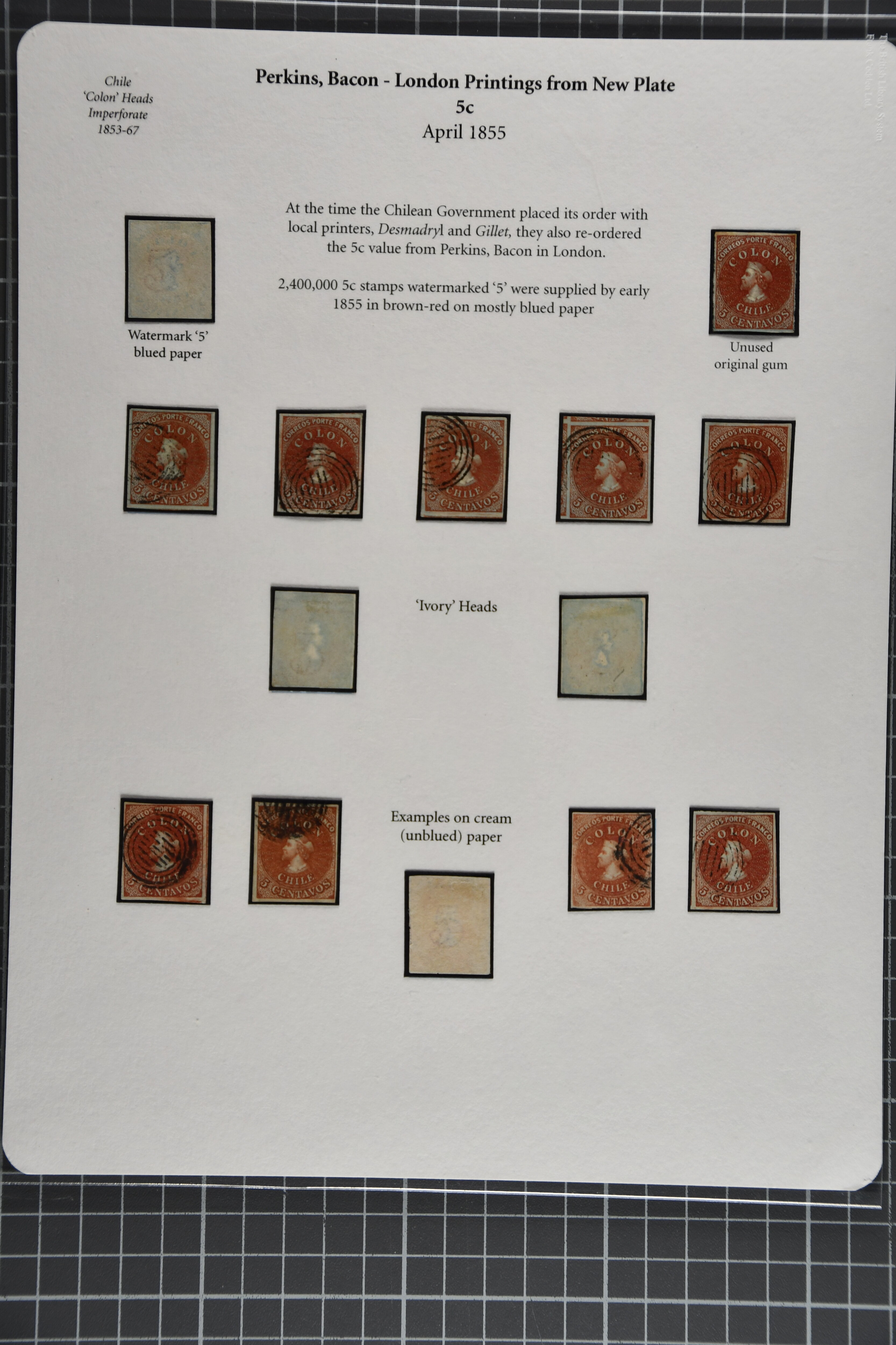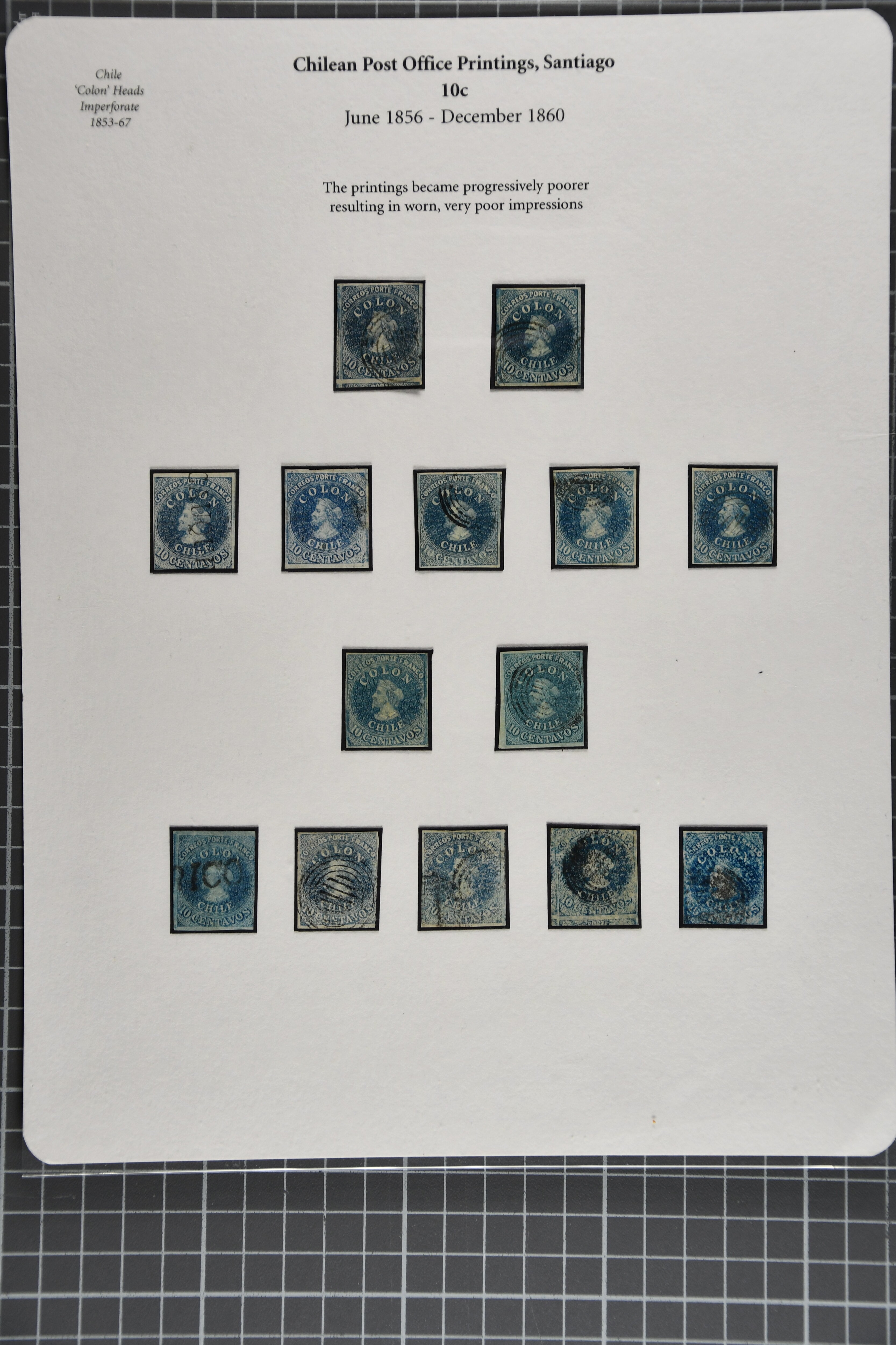the original sharp impressions and the later poor quality impressions, with one single example cancelled by blue target handstamp, the balance in black (but for a late impression with part CURICO handstamp); one pair showing an almost suffused colour