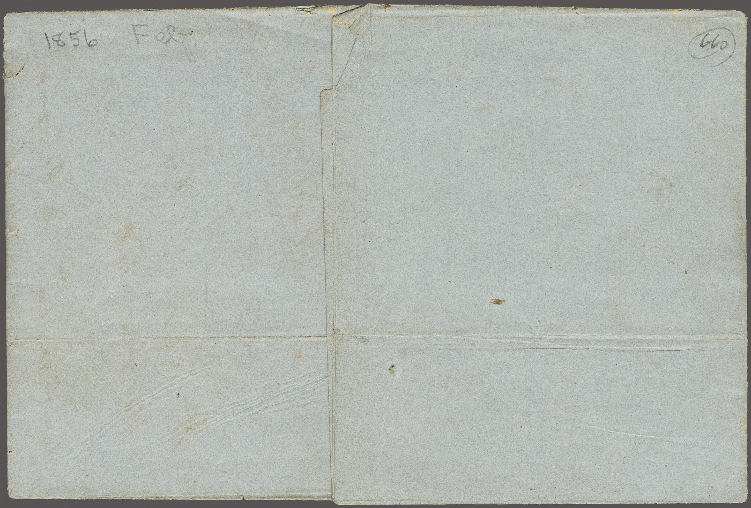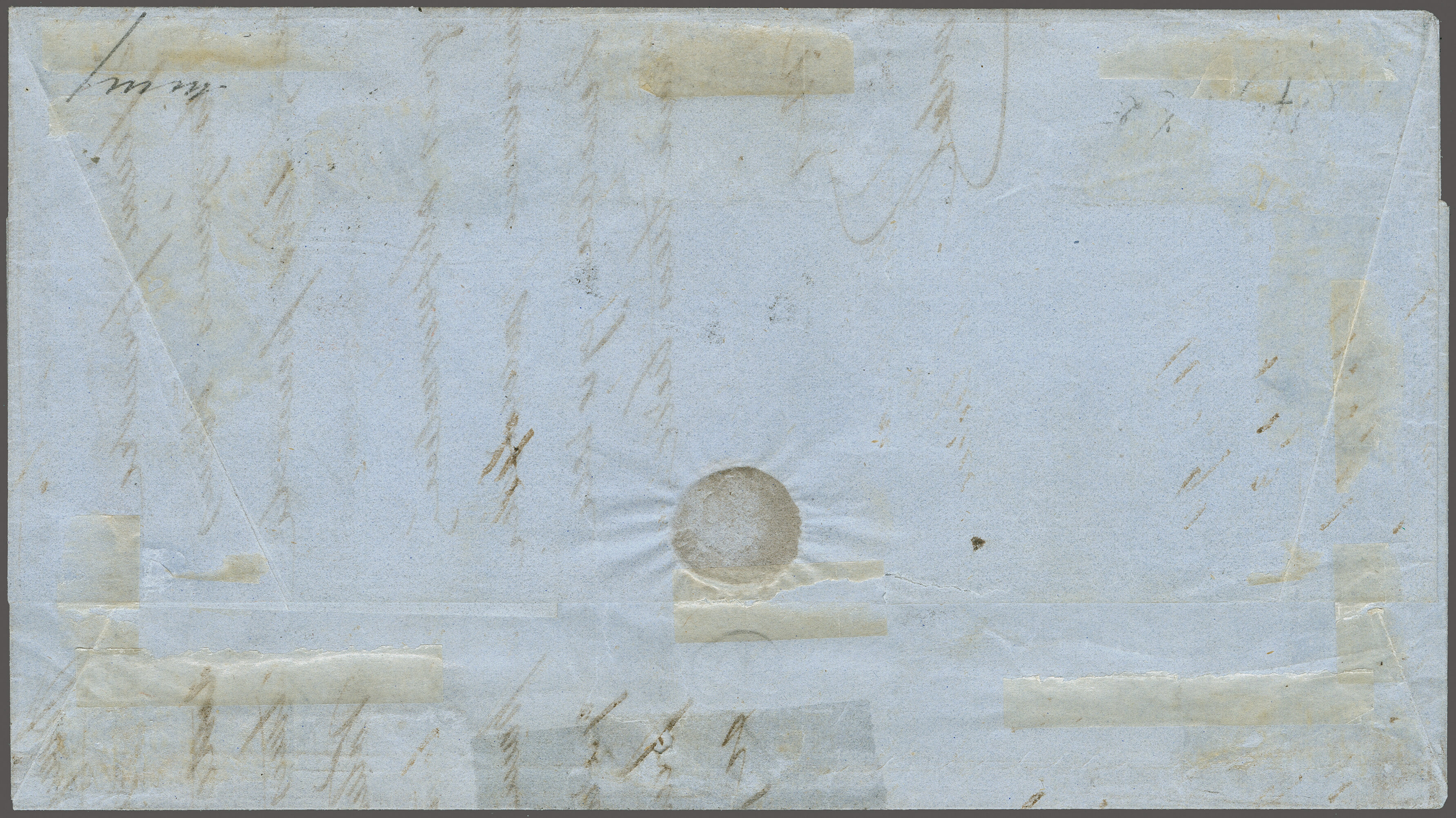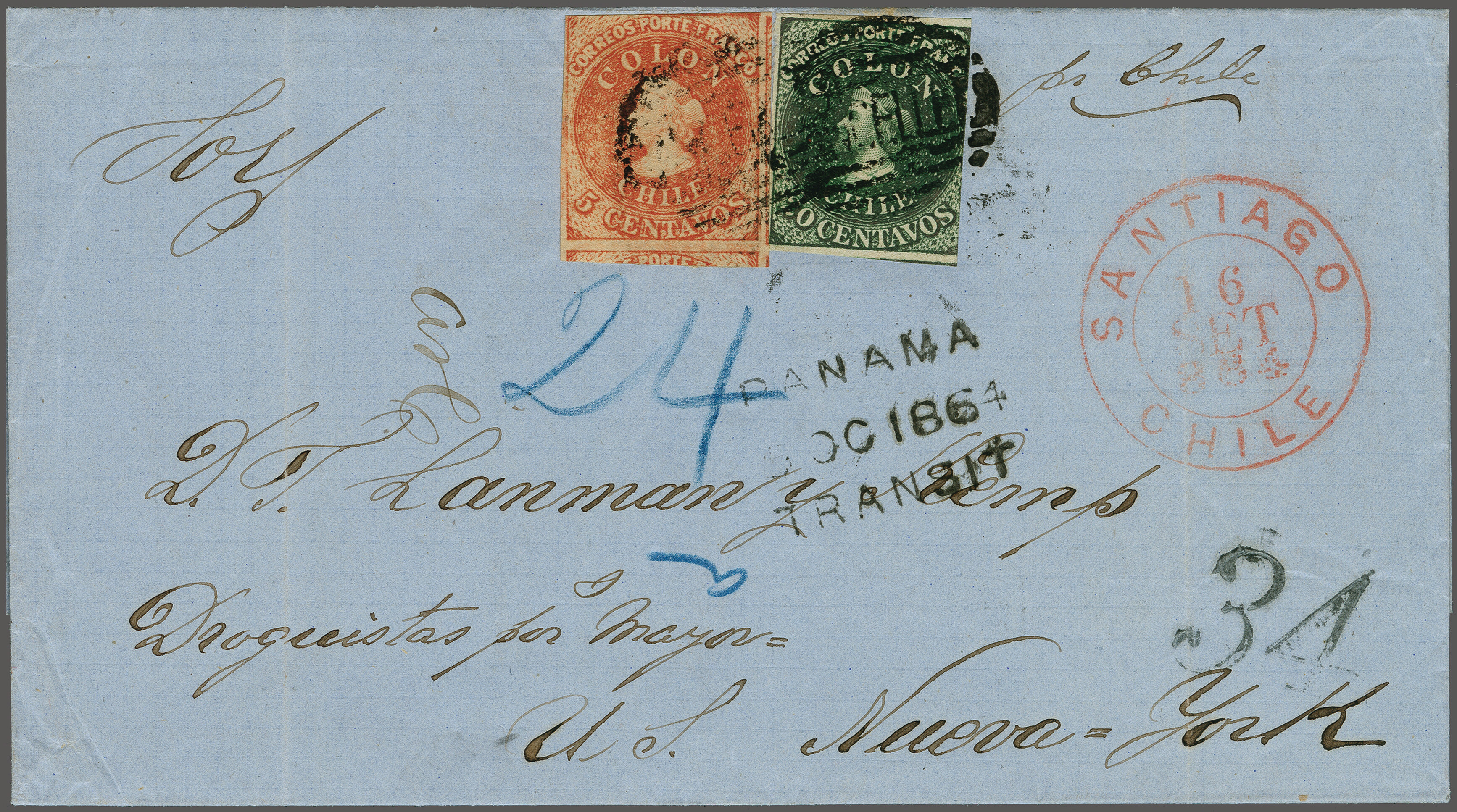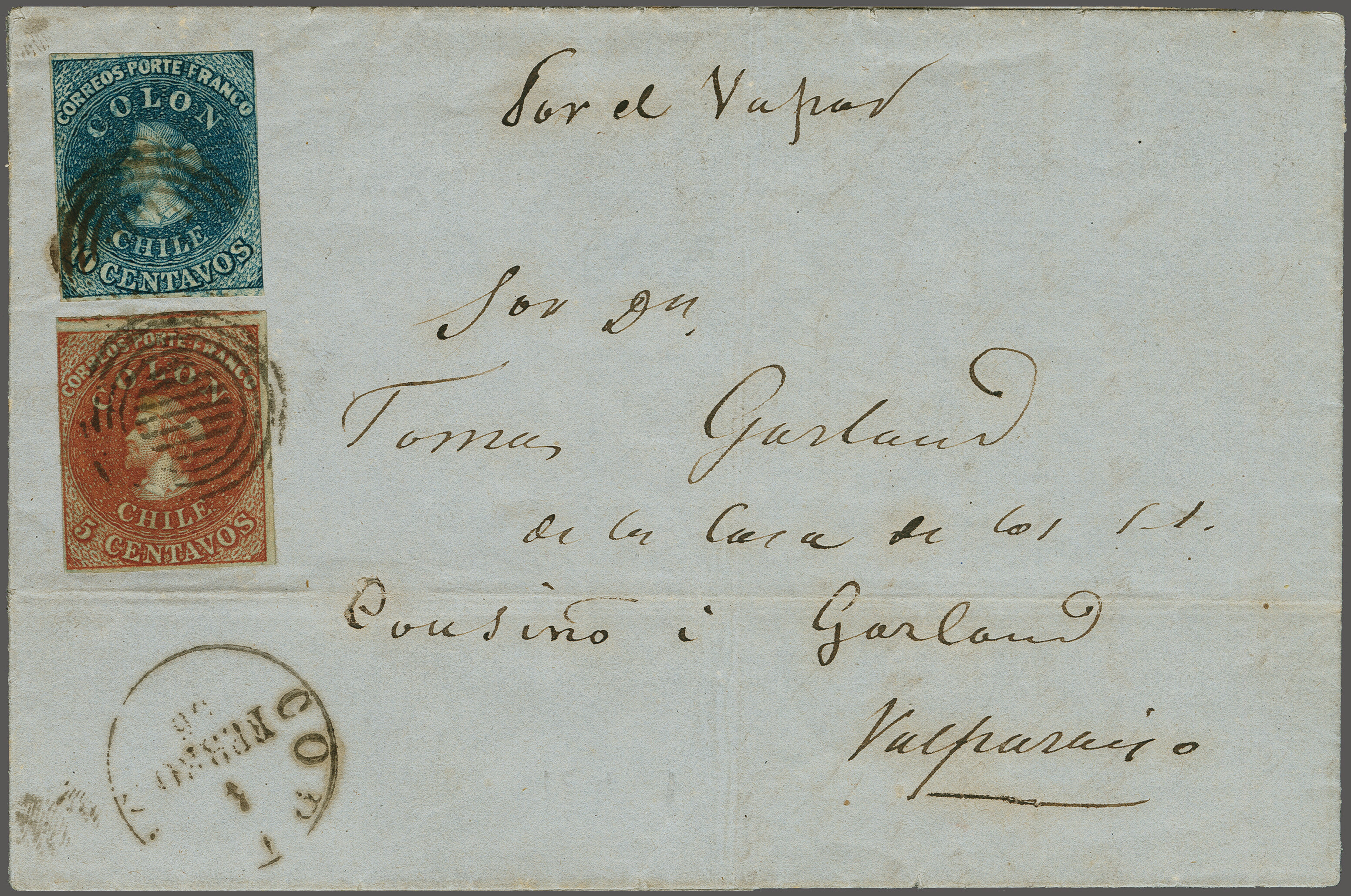 1855: 2nd London 5 c. red-brown on blued paper with clear to large margins all round and showing portion of adjoining stamp at top, used with 1856 Santiago print 10 c. blue, margins shaved to good, on 1856 entire letter at