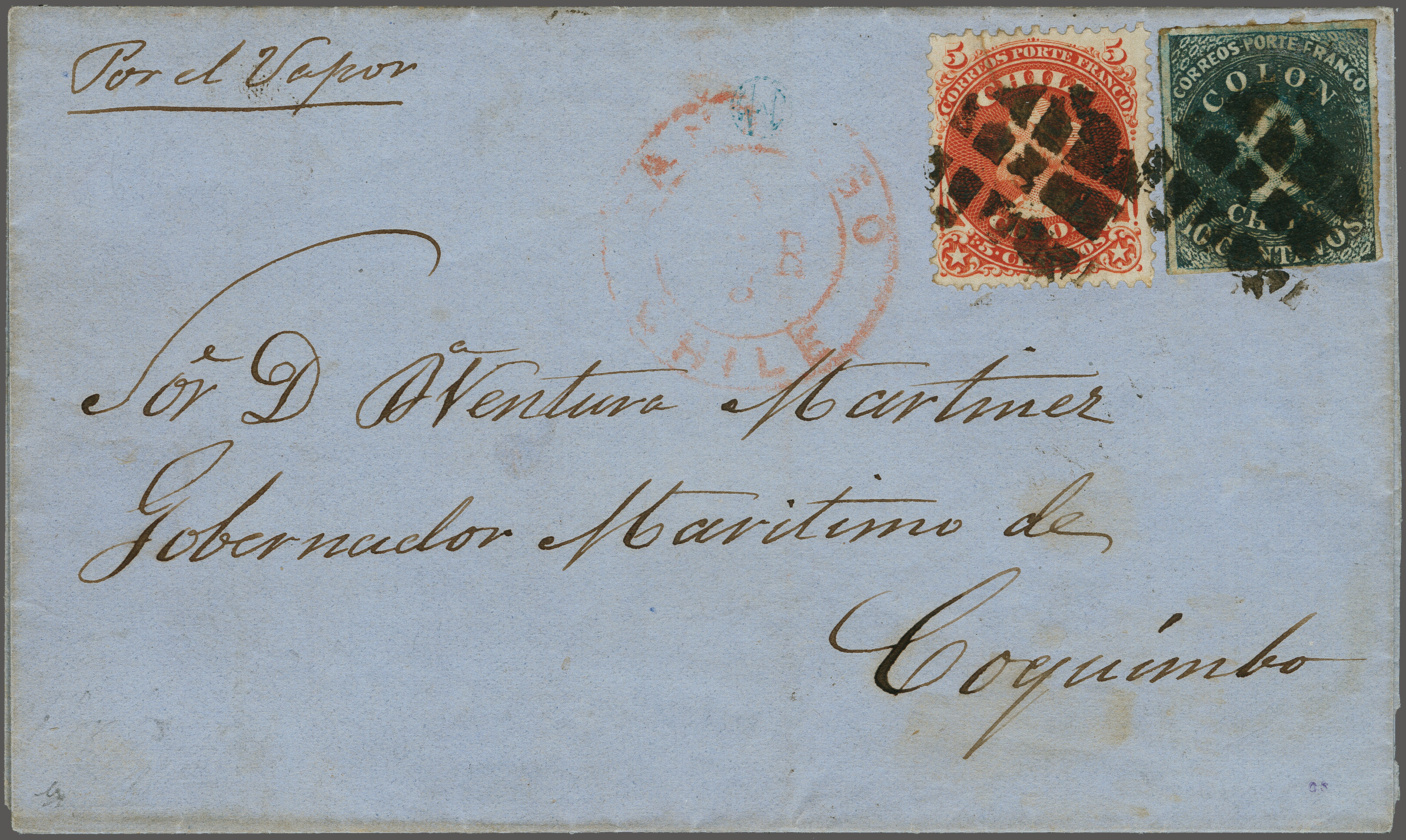 1856/62: 10 c. blue, a used example, just shaved at base with large margins on three sides, used with 1867 5 c. red on 1868 cover to Coquimbo endorsed "por el Vapor", tied by segmenmted cork handstamps in black. Faint