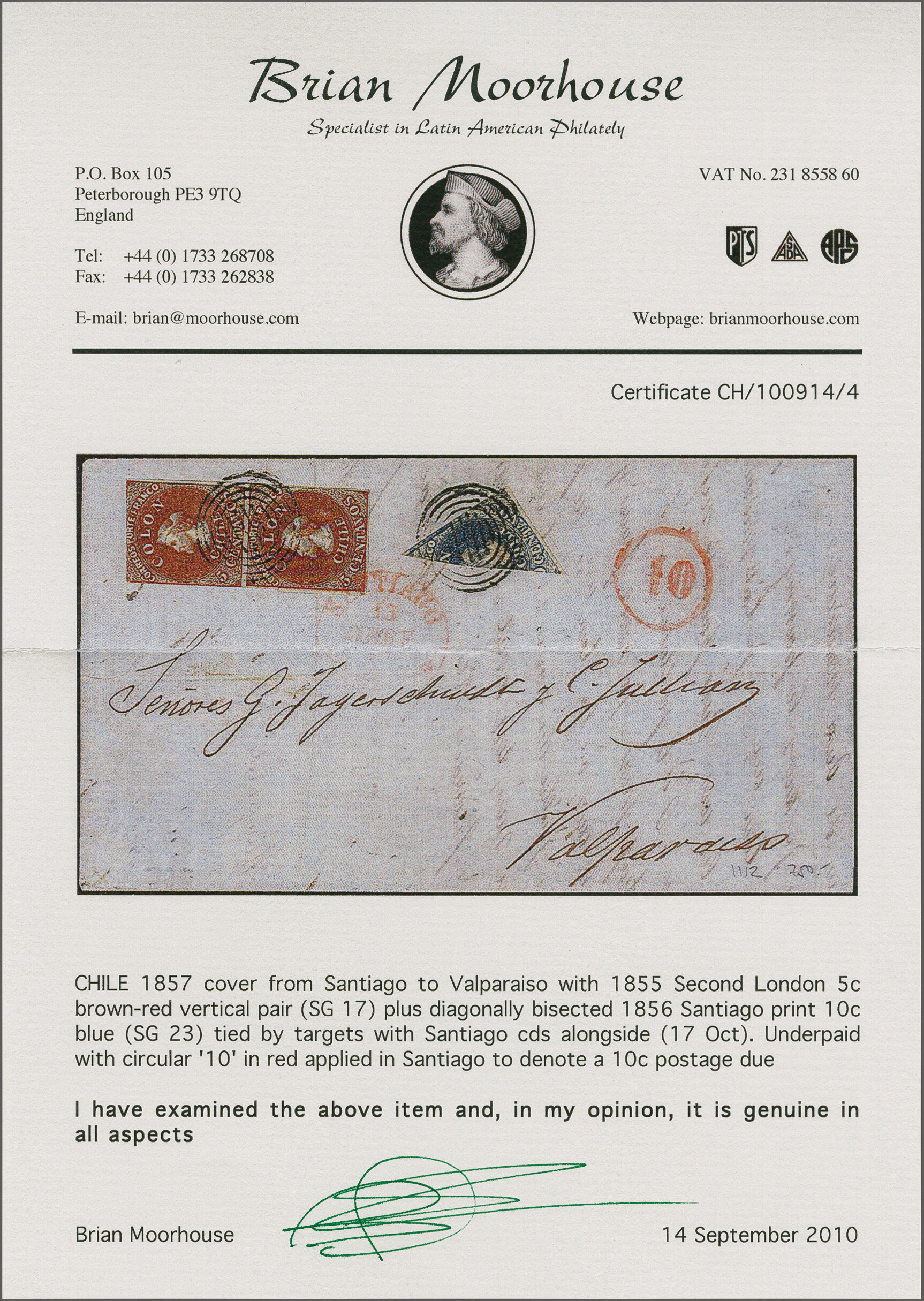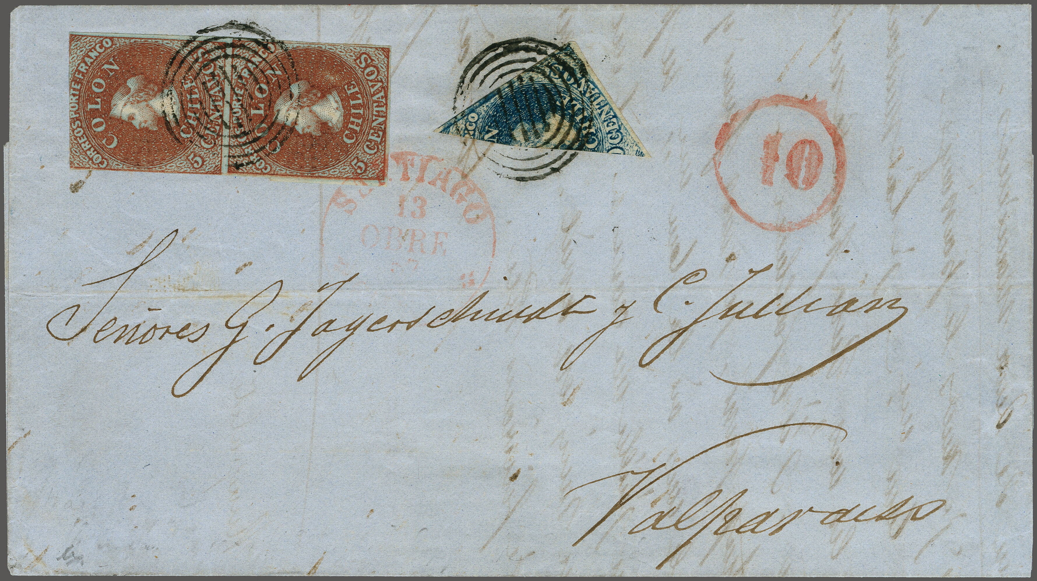 vertical pair, margins clear to touched in places, on 1857 second sheet of letter from Santiago to Valparaiso tied by six barred target handstamps in black. SANTIAGO despatch cds in red (Oct 13) and circular "10" Postage Due handstamp in red