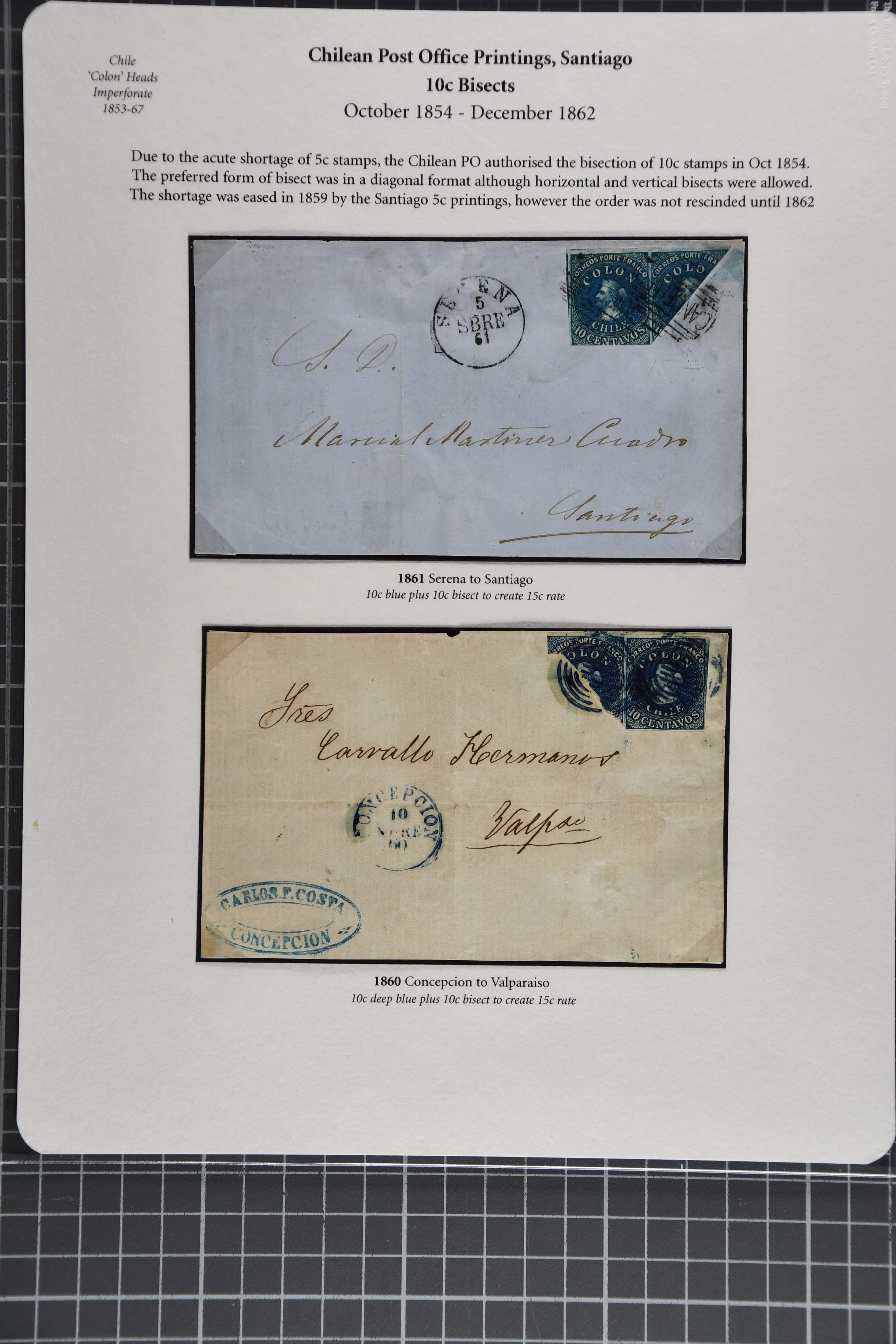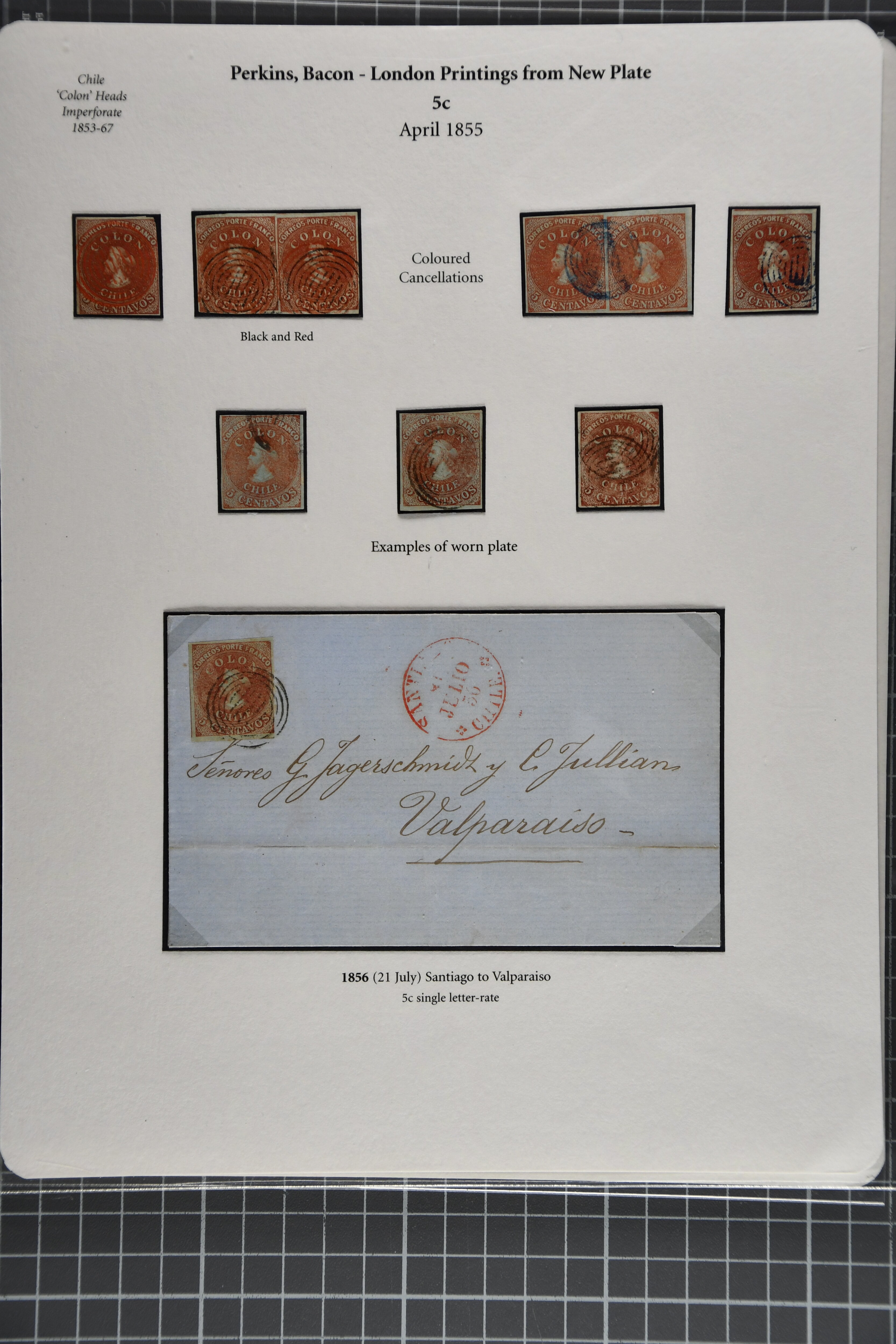 in red and another in blue; two horizontal pairs - one cancelled by target handstamp in blue and the other cancelled in red and re-cancelled in black; together with a fine example on July 1856 cover from Santiago to Valparaiso. A splendid lot (22