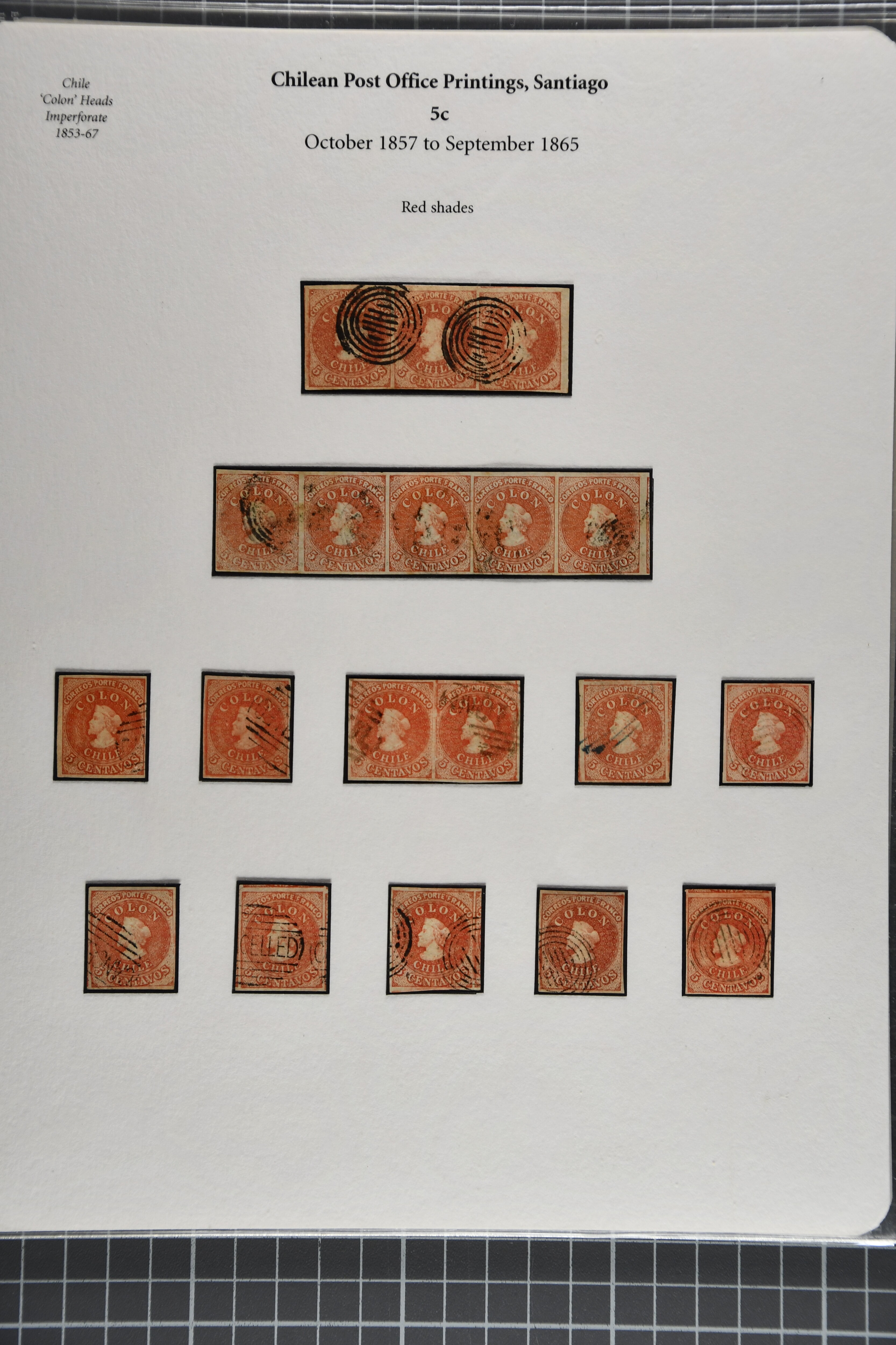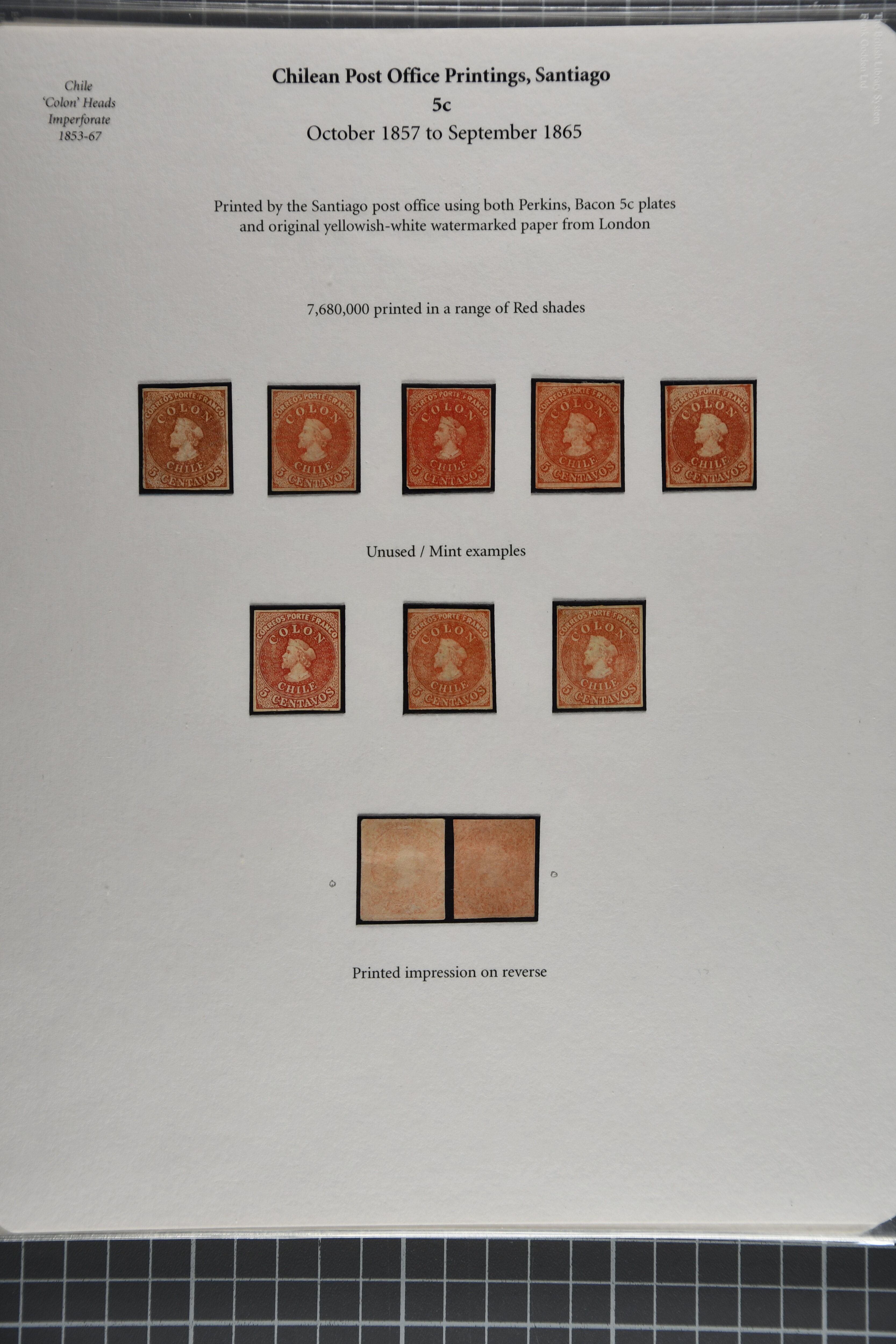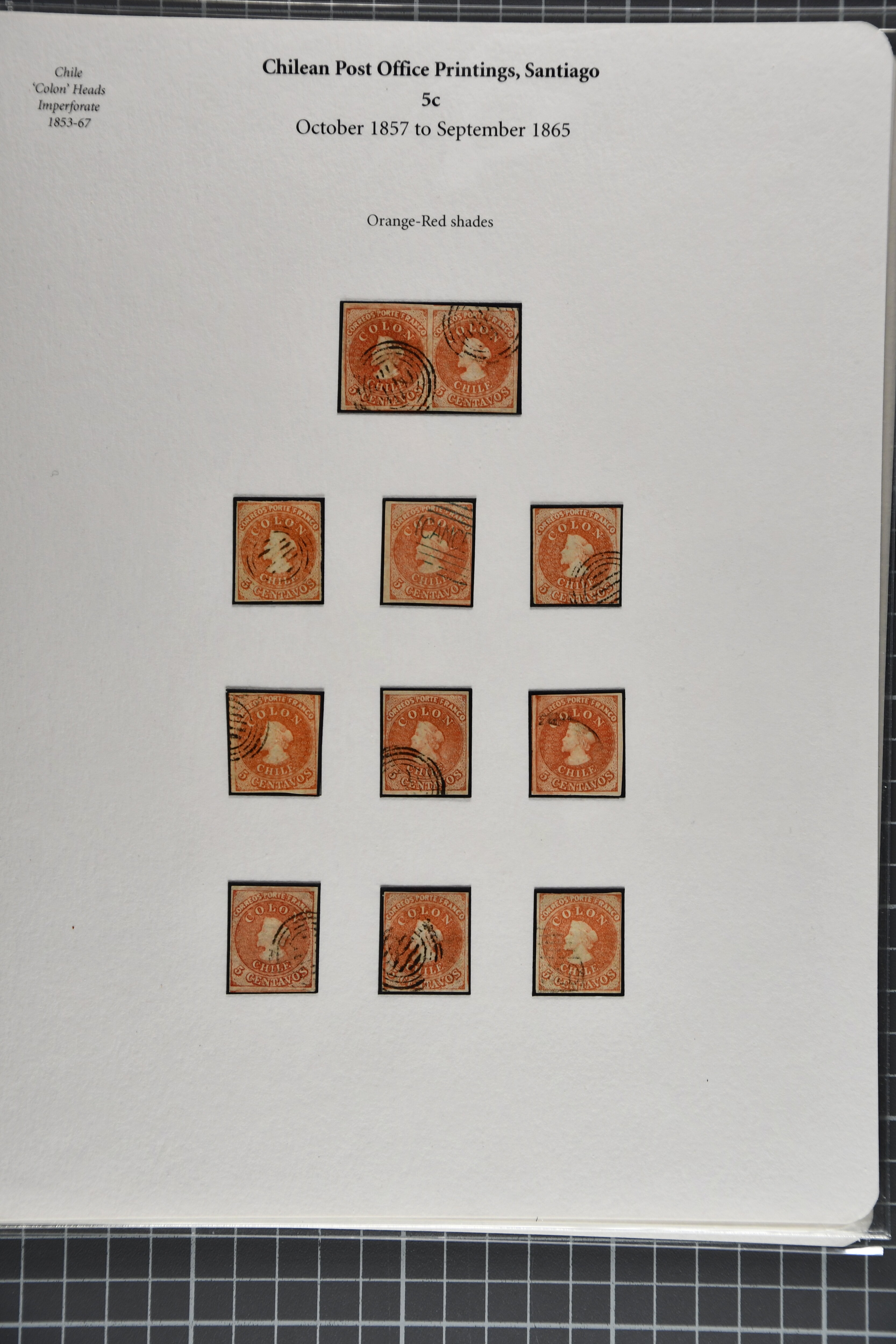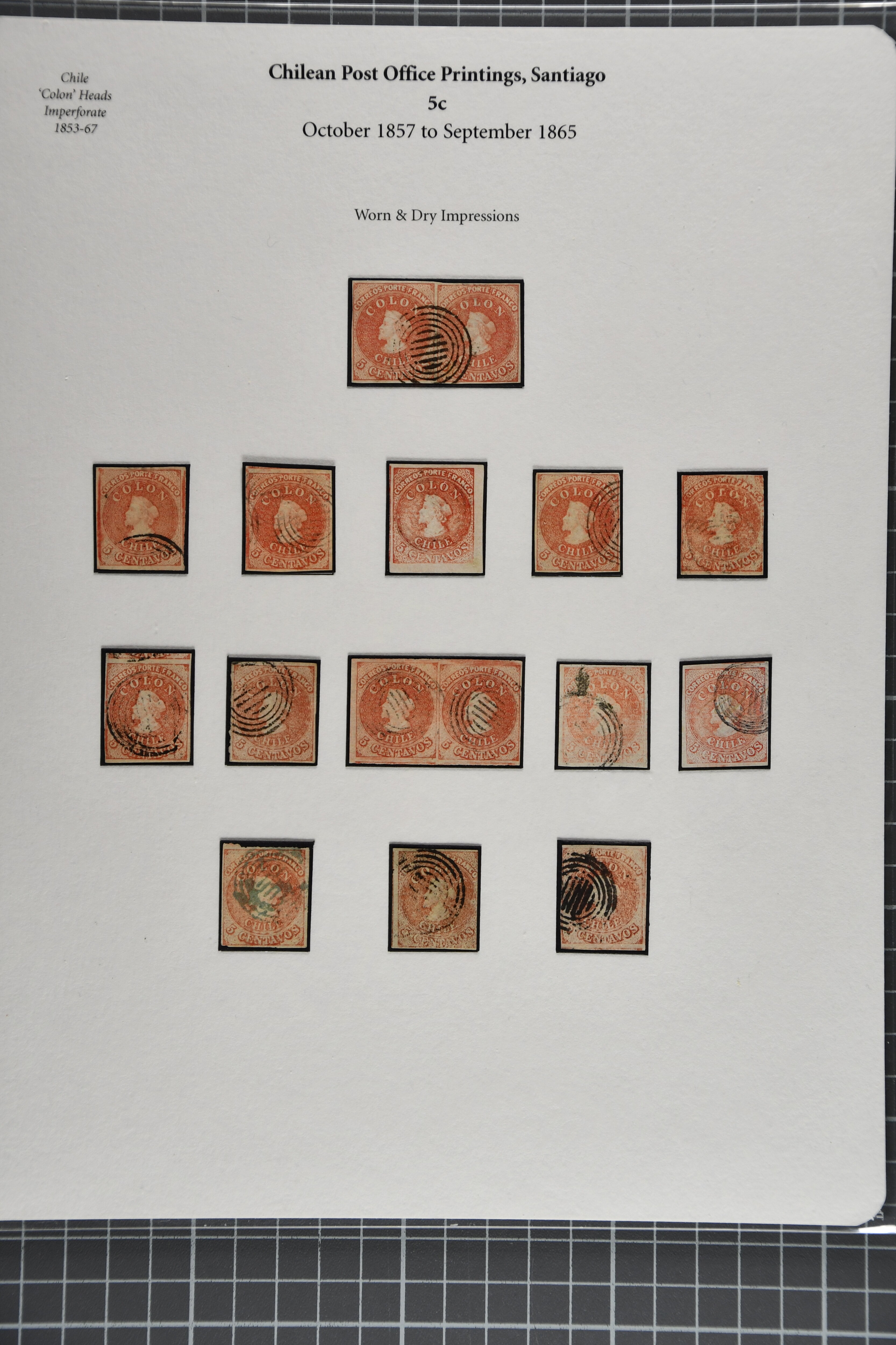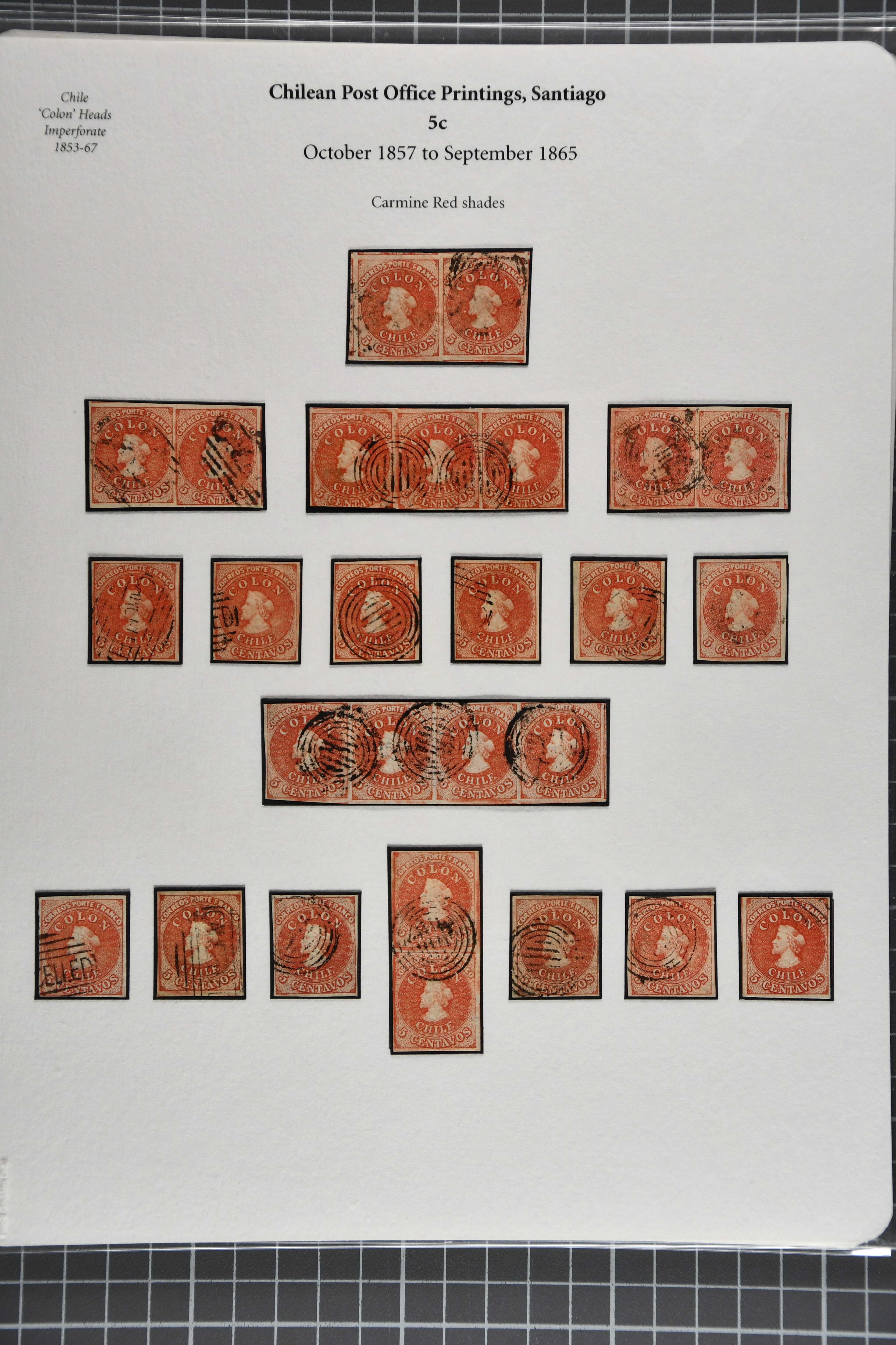 1857/65: Santiago P.O. printings, 5 c. carmine-red (all shades excluding the 'canela' brown shade), the collection beautifully written up on leaves with unused examples (8), used examples and multiples in