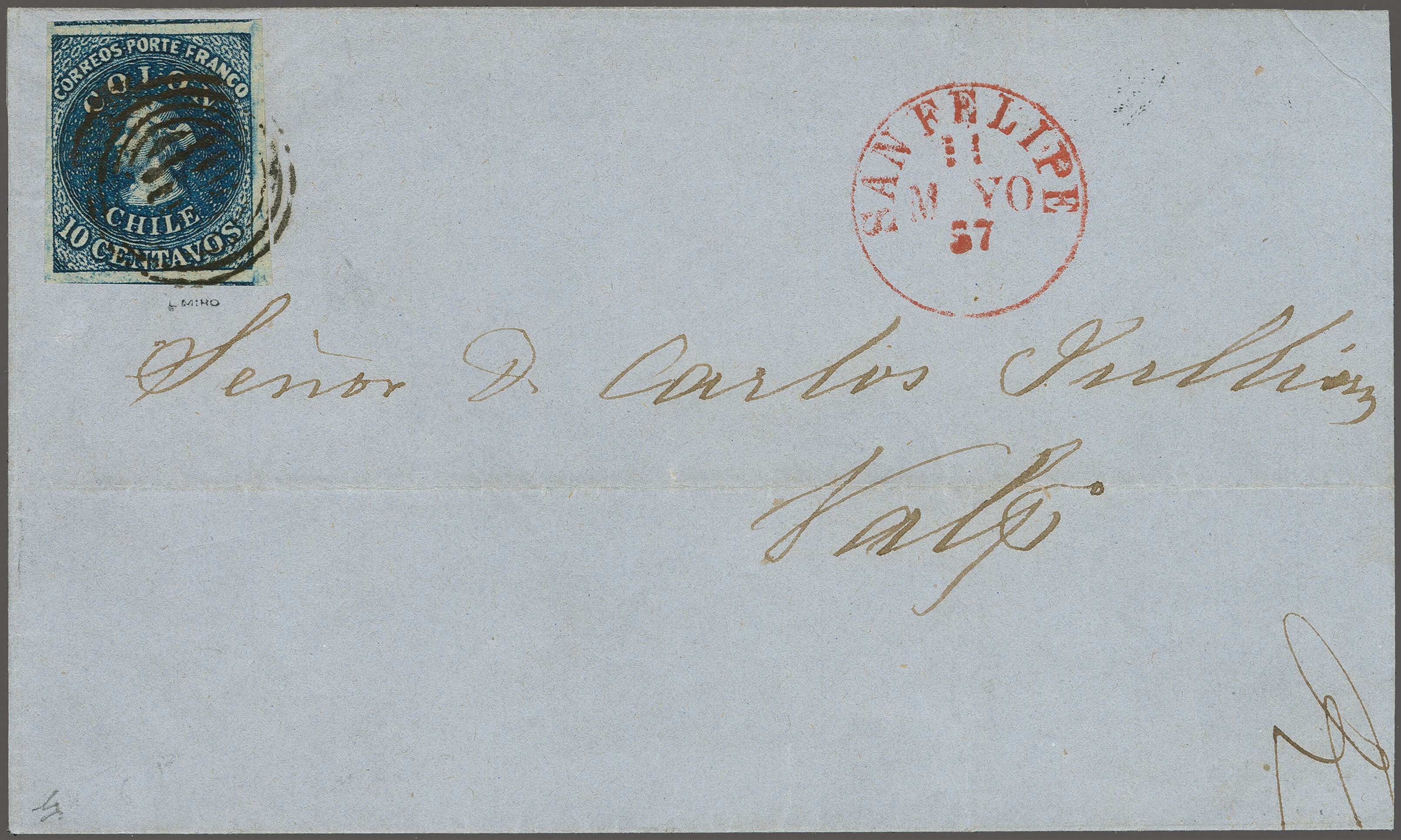 1856/60: Santiago P.O. 10 c. deep indigo blue, sharp impression (Gi 23), a used example with enormous margins for this issue and showing portions of adjoining stamps at top and at base, on 1857 cover to Valparaiso tied by neat