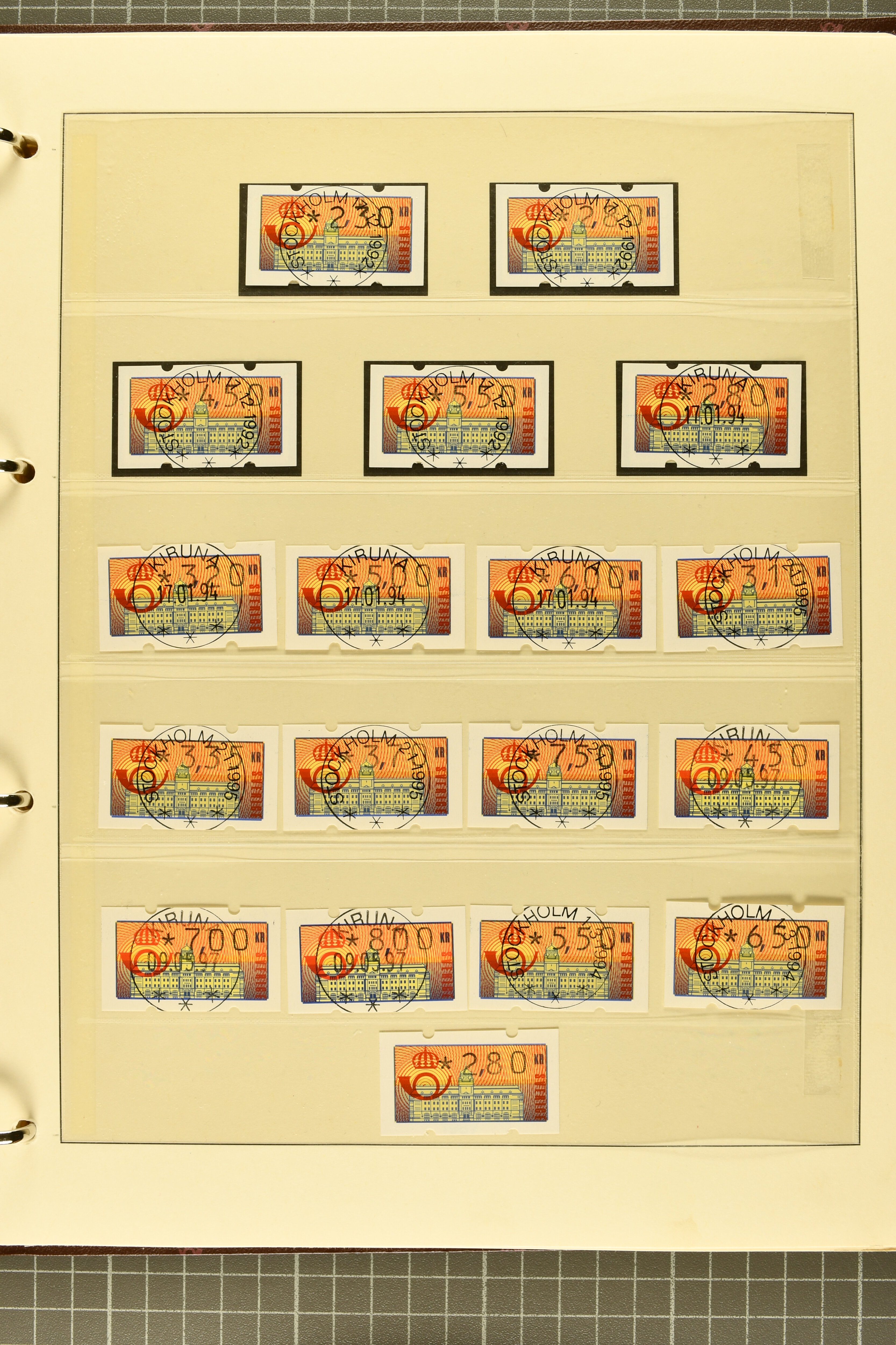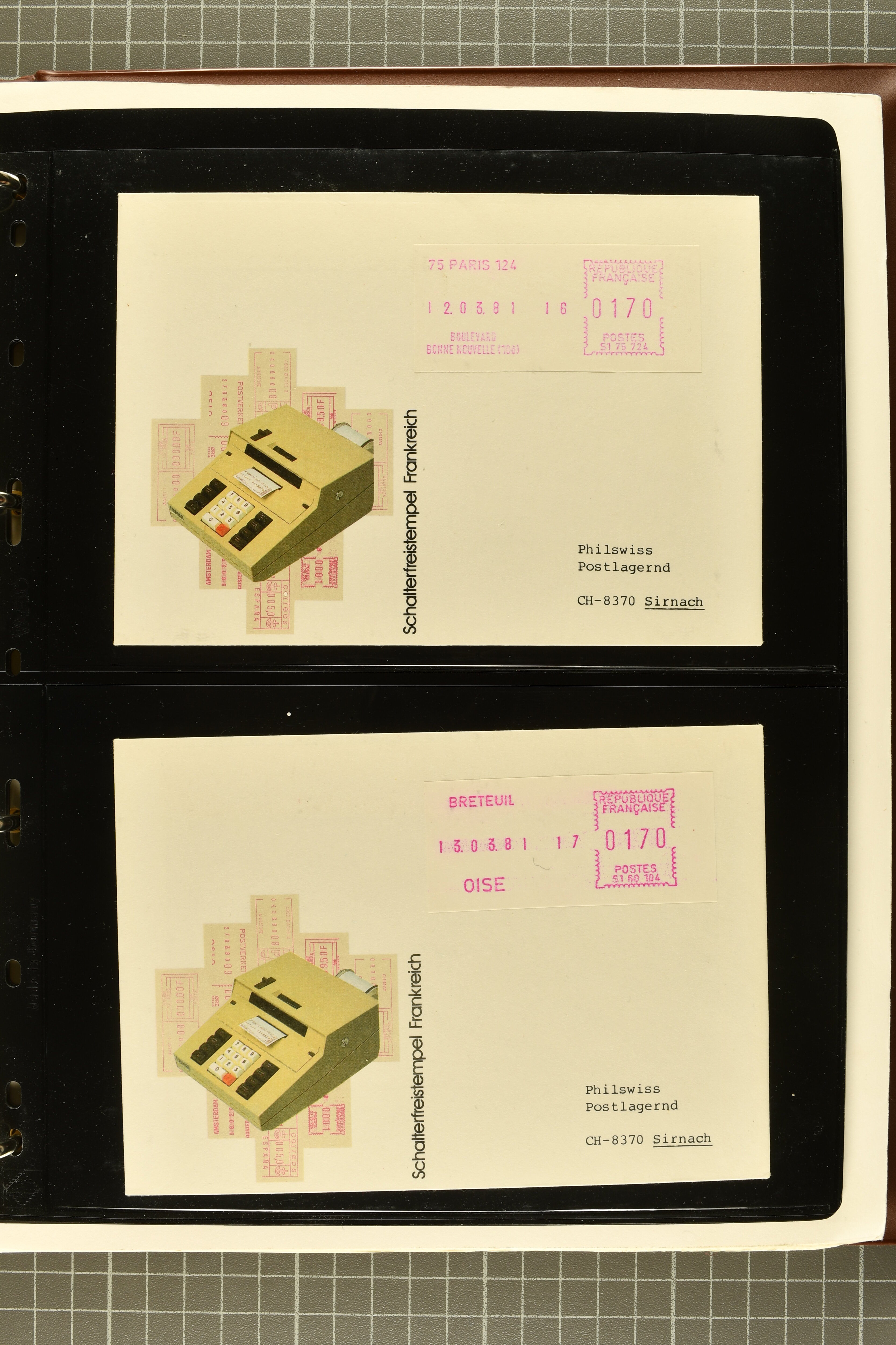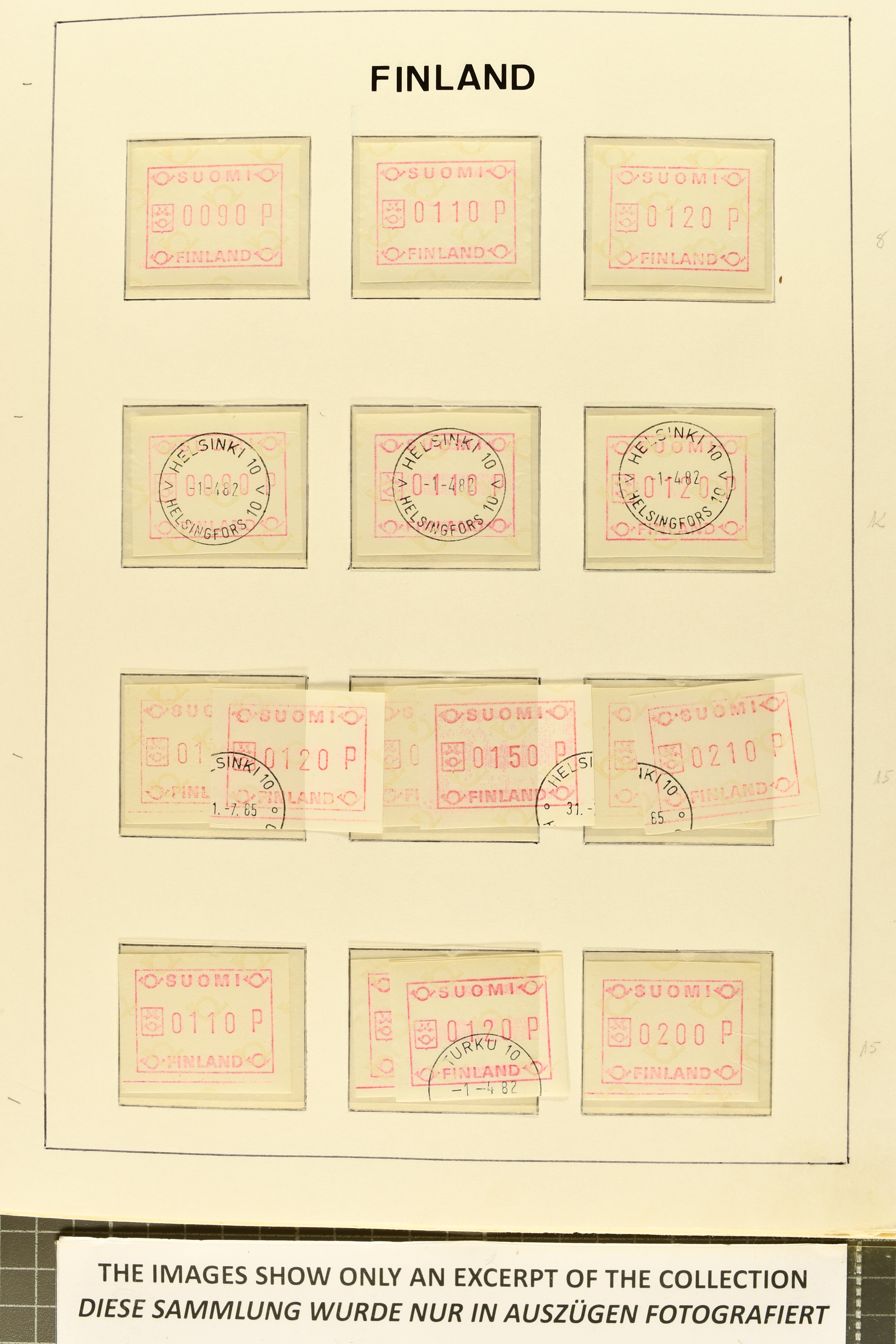 2722 image1975/90ca.: Extensive collection of ATM/Frama post automation stamps from various countries, meticulously arranged in six albums. The collection includes issues from Belgium, Cyprus, Finland, France, Germany, Norway, Israel, Portugal, and more. Additionally, it features coil stamps from the USA. The material is diverse, comprising both used and unused stamps, as well as covers, providing a comprehensive insight into automated postal systems worldwide. (Image 1) (Image 2) (Image 3) (Image 4) (Image 5) (Image 6) (Image 7) (Image 8) (Image 9) (Image 10) (Image 11) (Image 12) (Image 13) (Image 14) (Image 15) (Image 16) (Image 17) (Image 18) (Image 19) (Image 20) (Image 21) (Image 22) (Image 23) (Image 24) (Image 25)