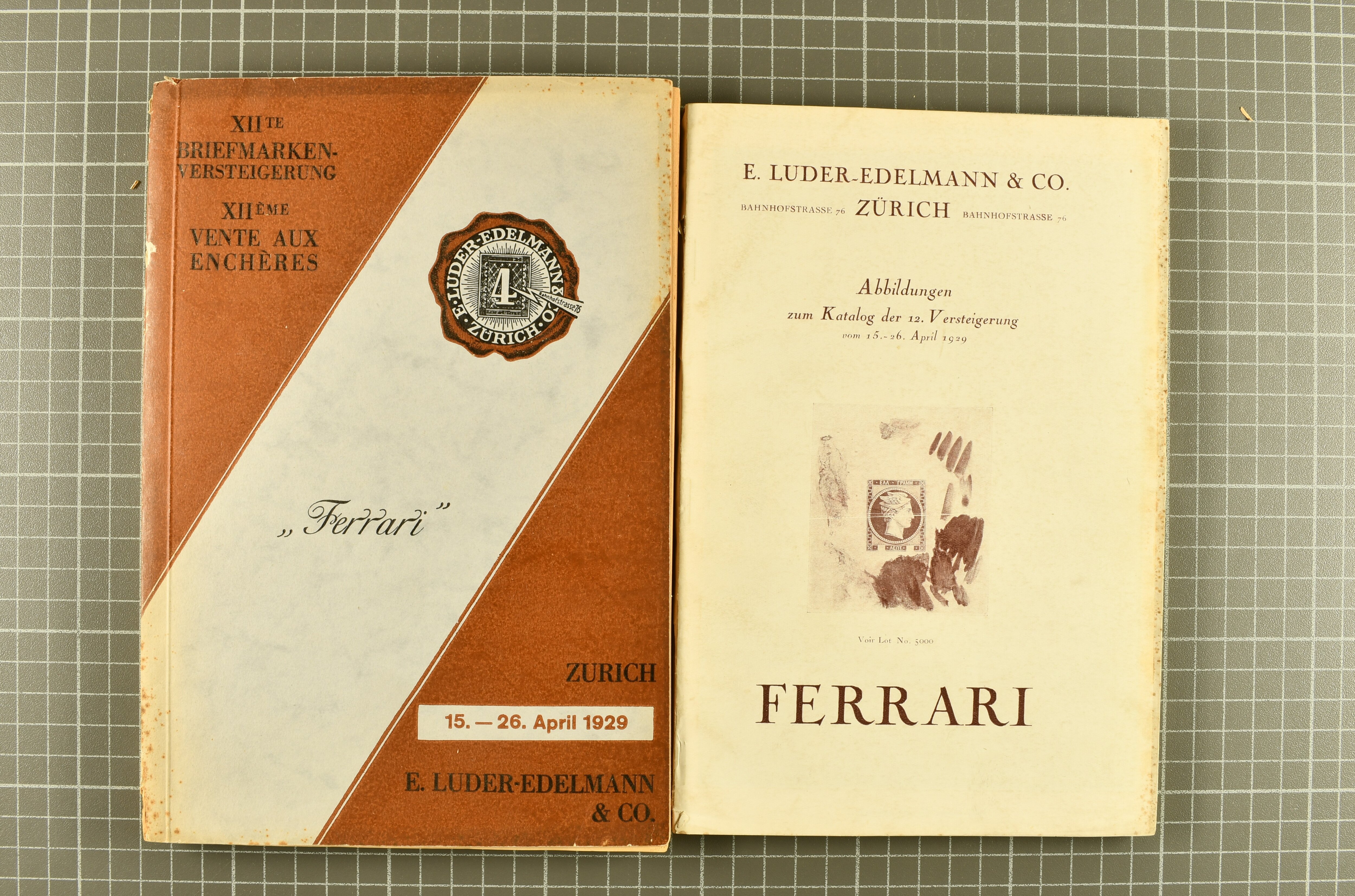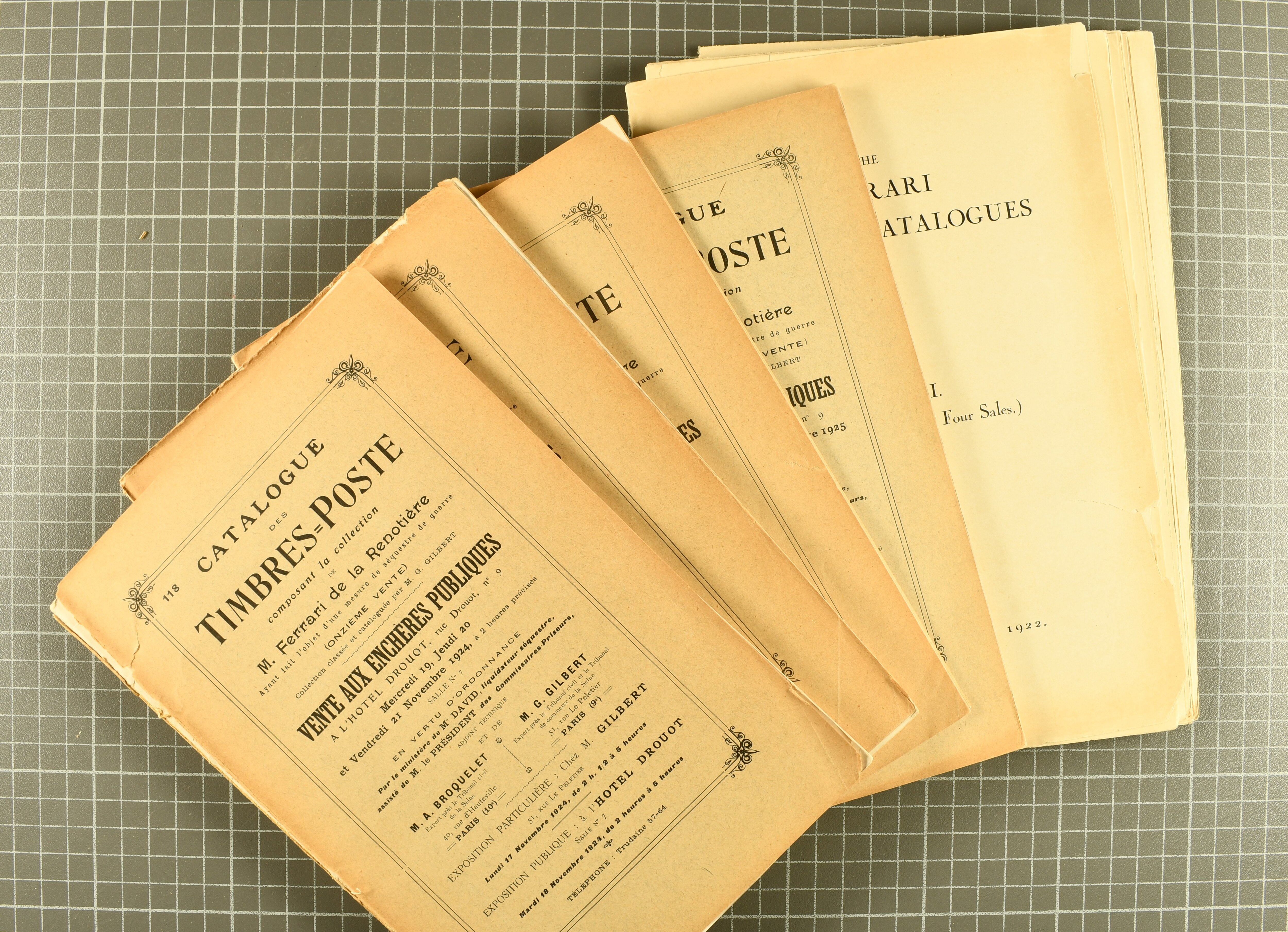 1700 image1921/25: The Phillip von Ferrari de la Renotière Collection: Fifteen auction catalogues with all fourteen sales conducted by Broquelet and Gilbert in Paris (1921-25) and the XII. Luder-Edelmann (Corinphila) sale (Zurich 1929) including "Greece" from the Ferrari collection together with the specially bound illustration-booklet for this sale. Accompanied by the Index and Prices Realized to the sales taken from the bound volumes prepared by the RPSL. A scarce and legendary set of catalogues, as usual with some wear to the binding of most volumes (Paris-sale two with several loose pages), otherwise in fine and extraordinarily fresh condition. (Image 1) (Image 2) (Image 3)