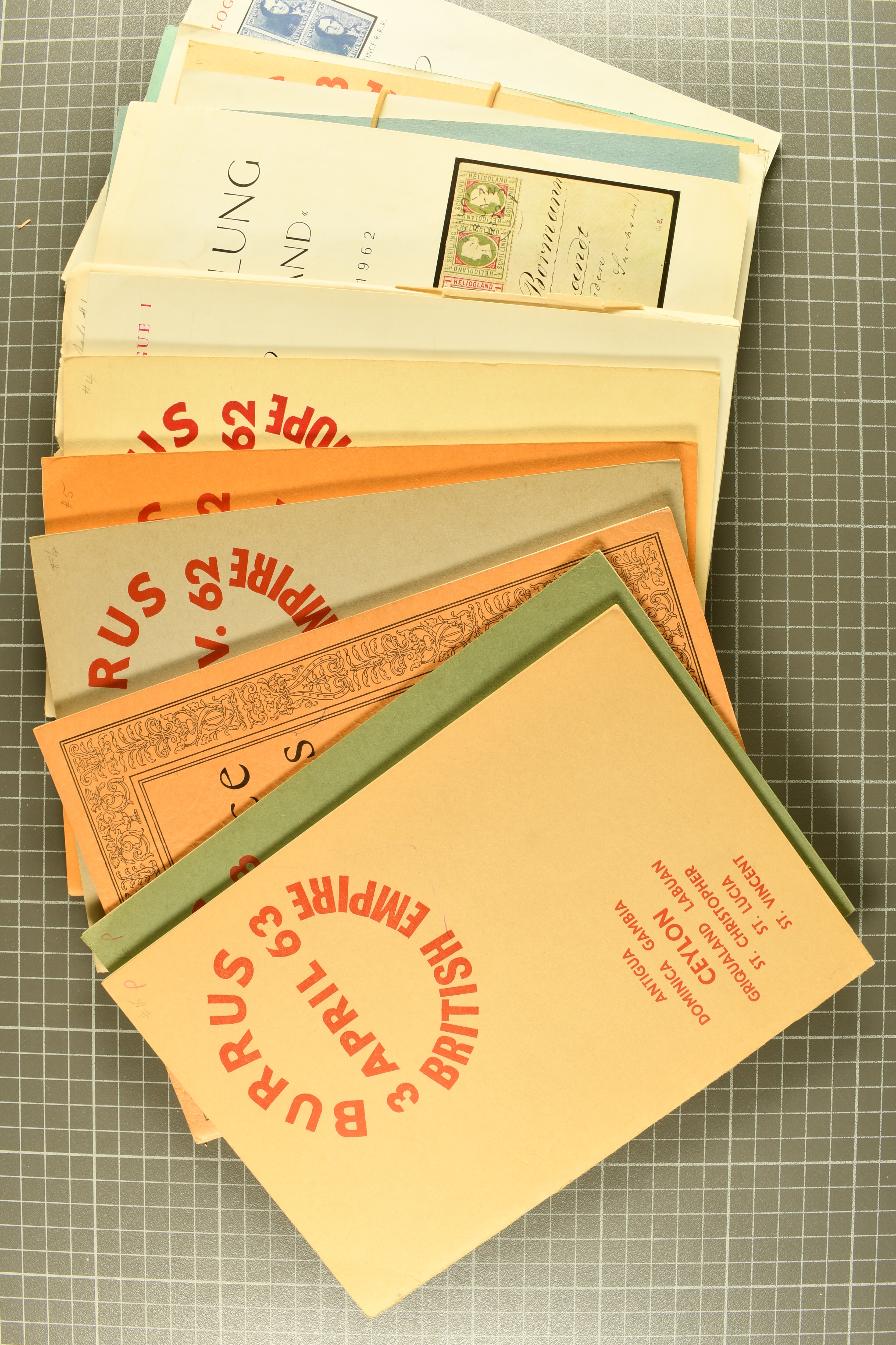 1702 image1960/64ca: Assembly of 48 all different Burrus catalogues, mostly in good condition and most often with result lists, including some better ones. As a highlight, a perfect Japan catalogue containing the floor ticket. (Image 1)