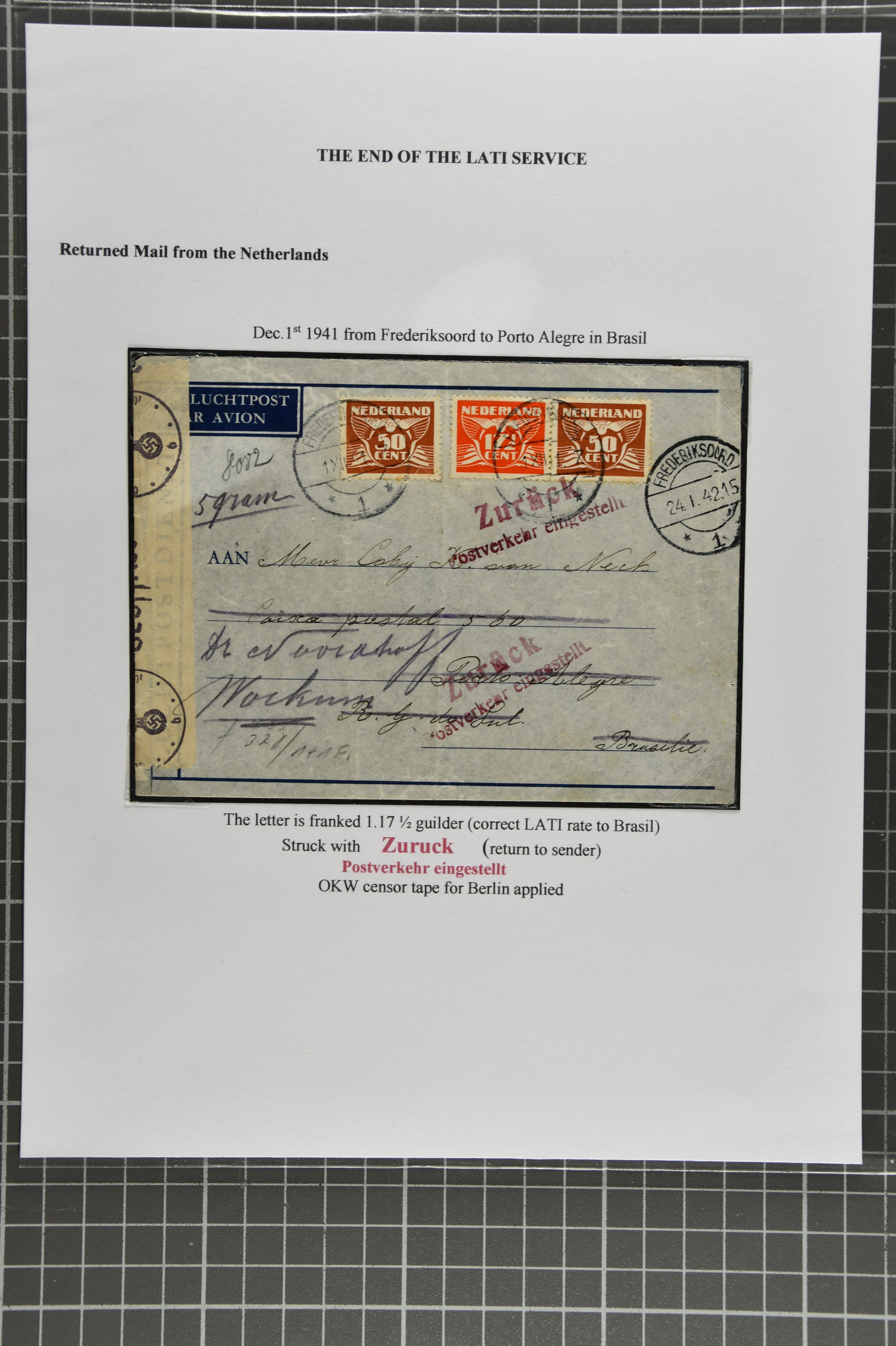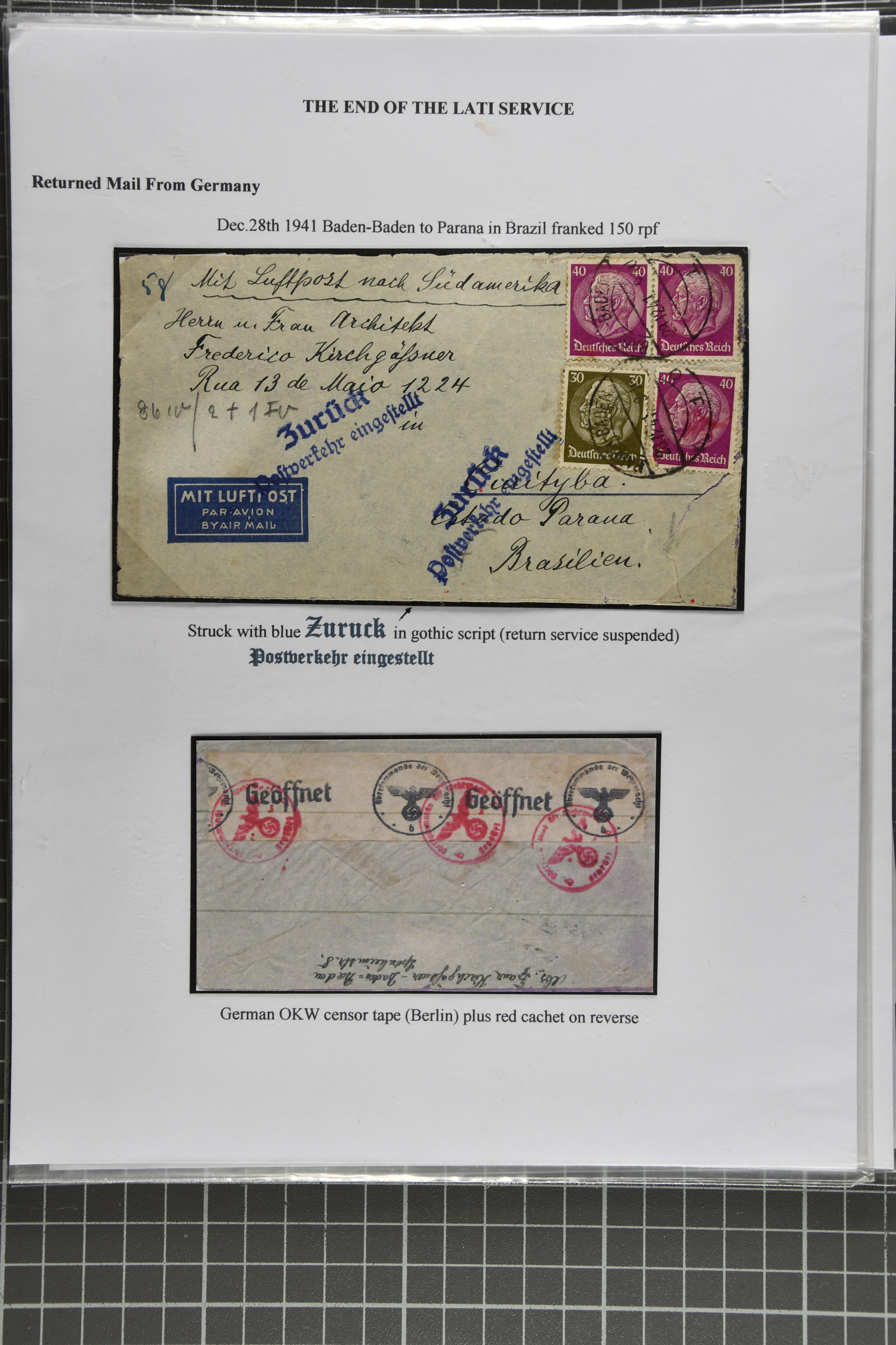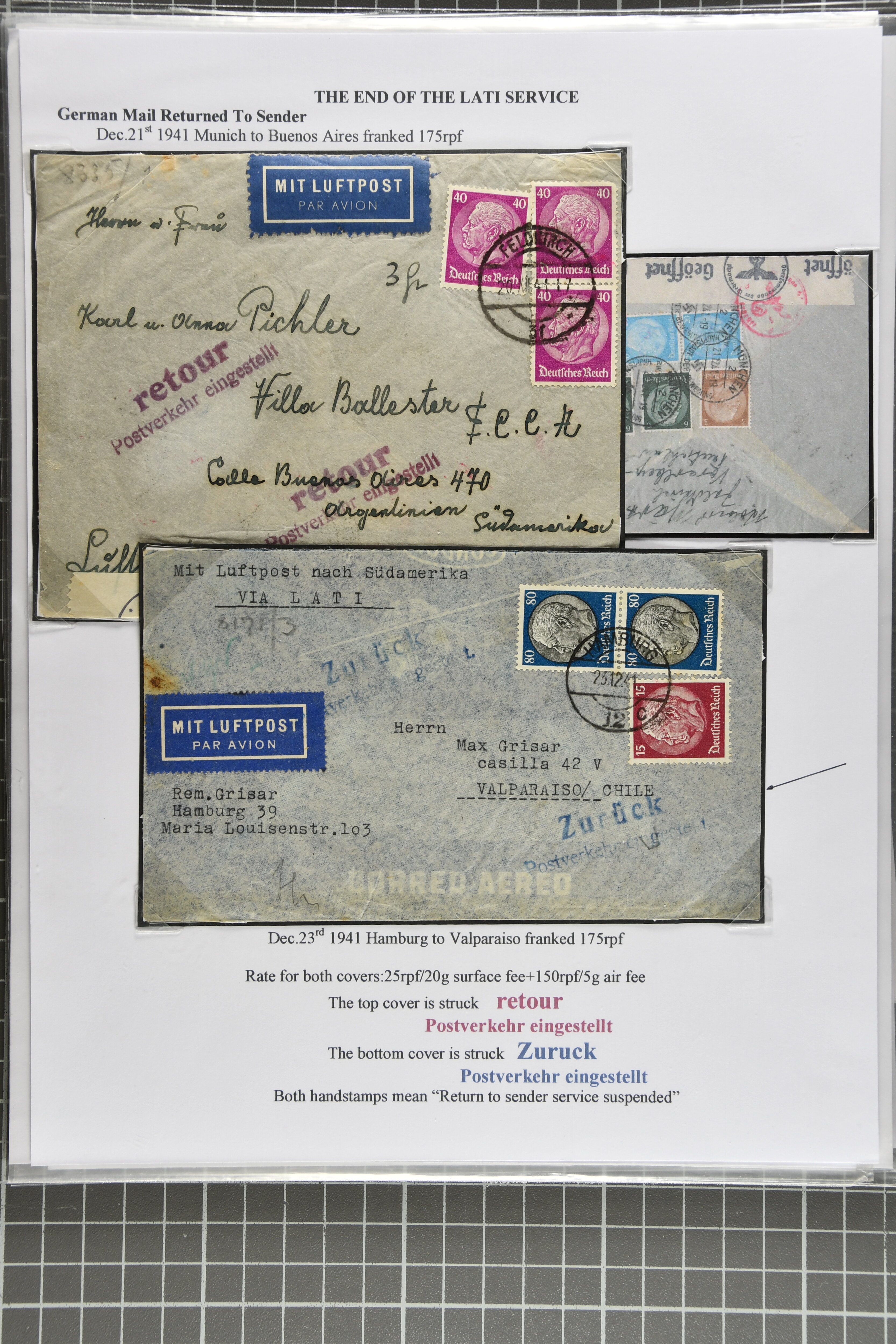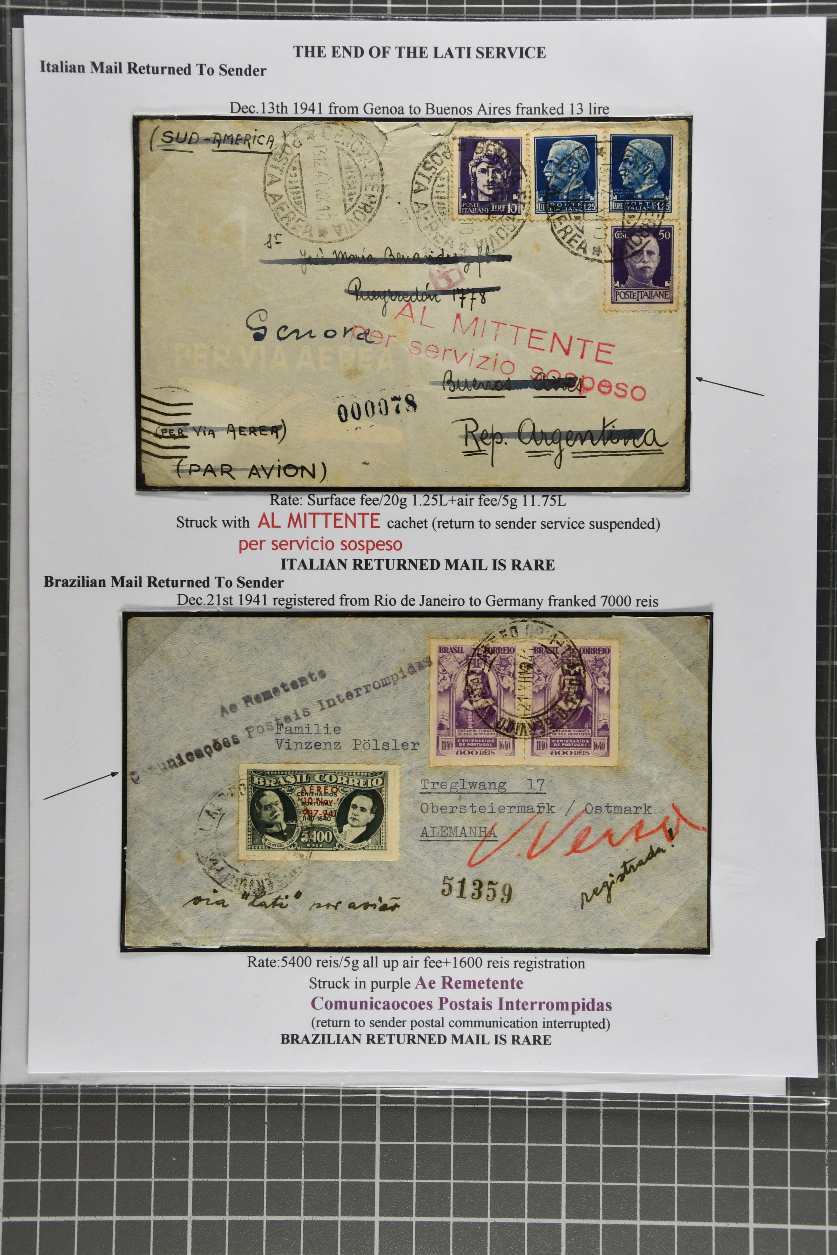 2368 cover imageEnd of LATI Service 1941 (Dec.): Group of 13 envelopes with instructional markings 'zurück' or 'retour / Postverkehr eingestellt', including two from Prague to Quito, Ecuador, one from Kopenhagen (Dec. 18) with ' Postal service suspended',six covers from Germany, two covers from Italy 'Al mittente per servizio sospeso' (two diff. types in black and red), cover from Rio to Germany showing 'Ae Remetente / Comunicaocoes Postais Interrompidas' in black (returned Mail from Brazil is rare), as well as envelope from Frederiksoord, Netherlands to Porto Alegre in Brazil. A fine and scarce assemply of returned LATI mail. (Image 1) (Image 2) (Image 3) (Image 4) (Image 5) (Image 6) (Image 7) (Image 8) (Image 9) (Image 10) (Image 11)