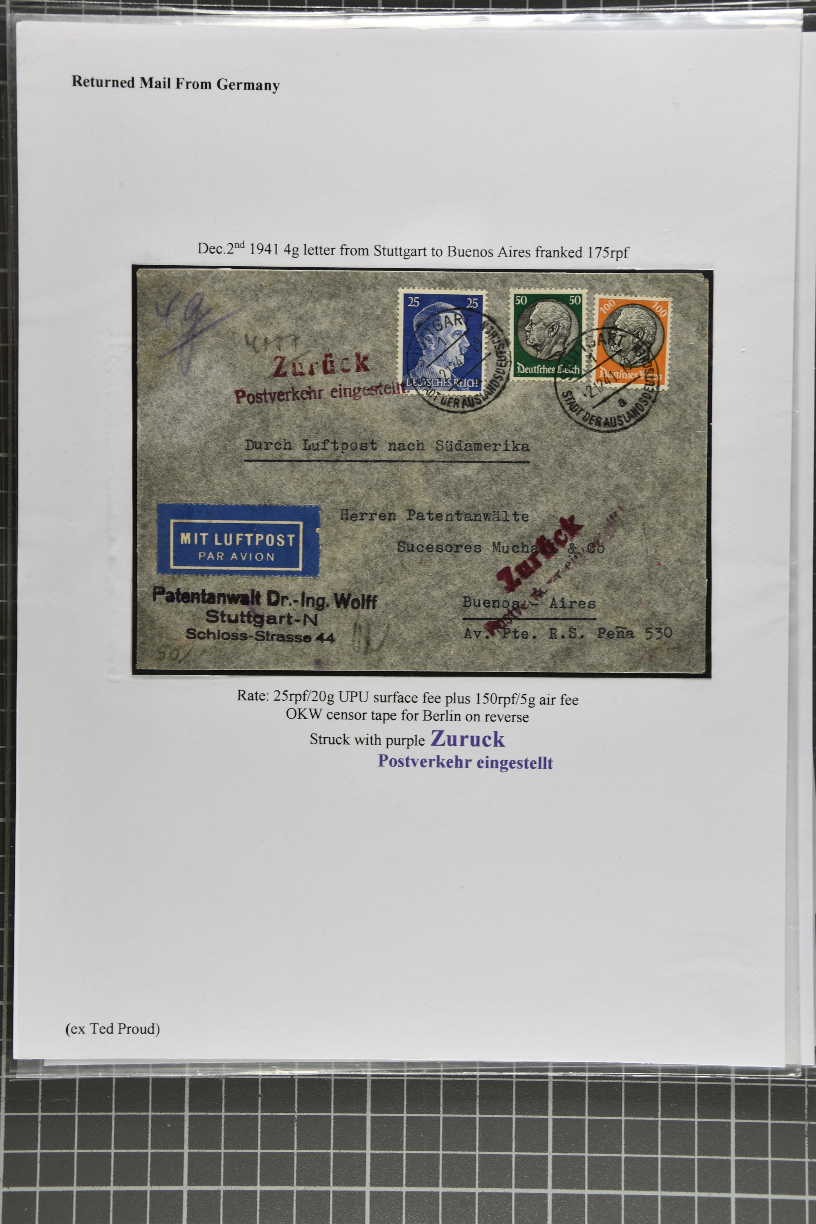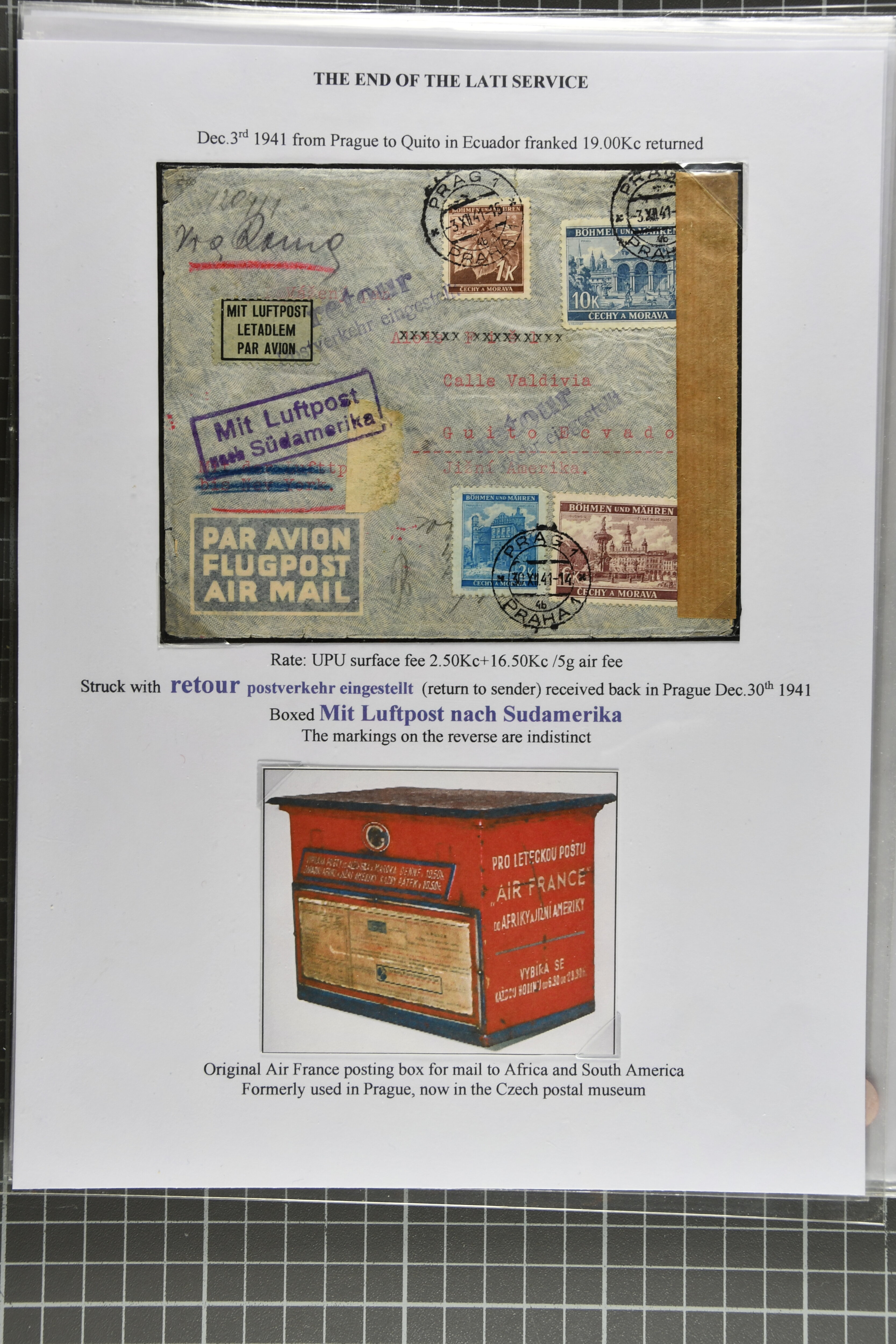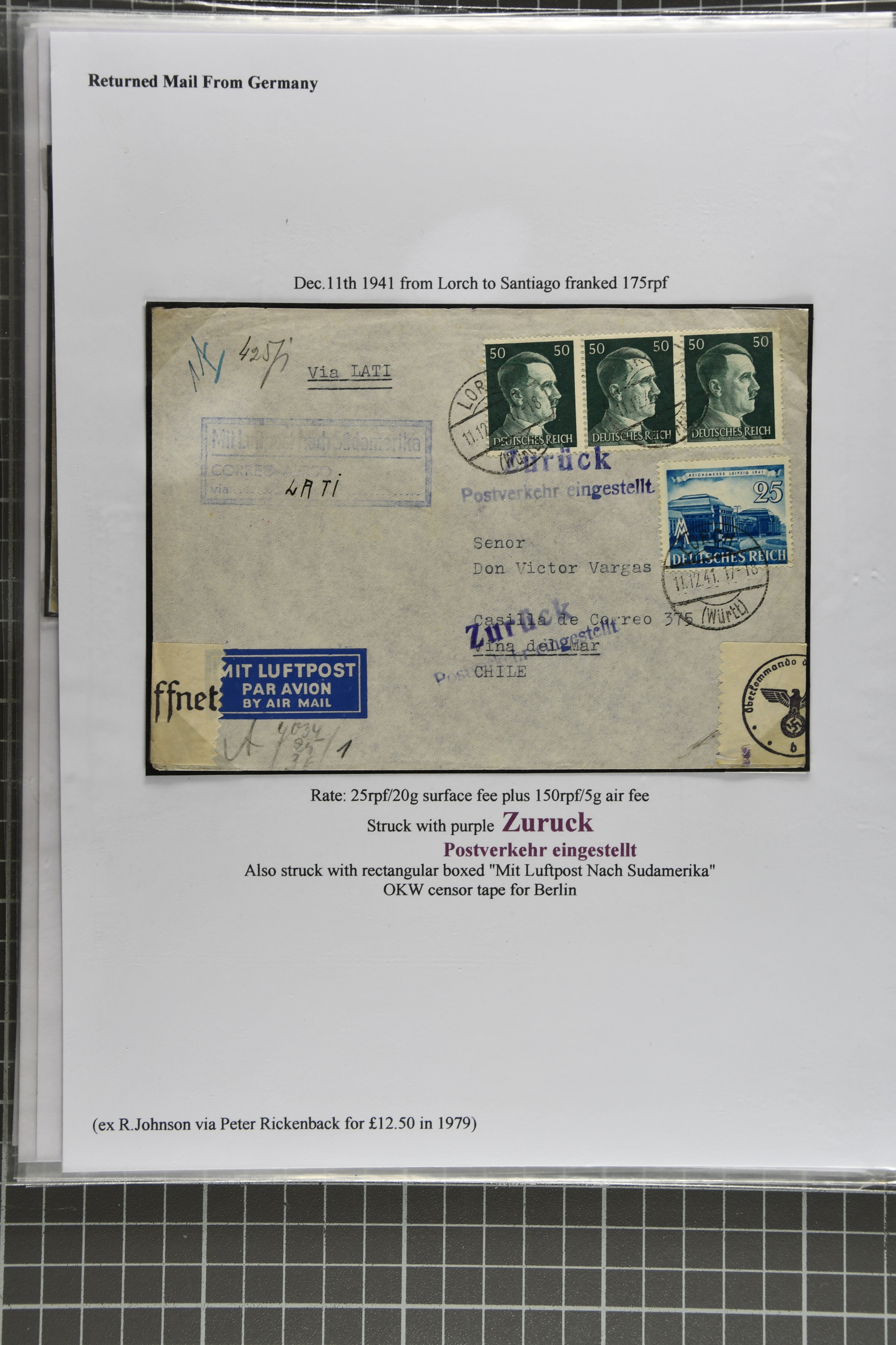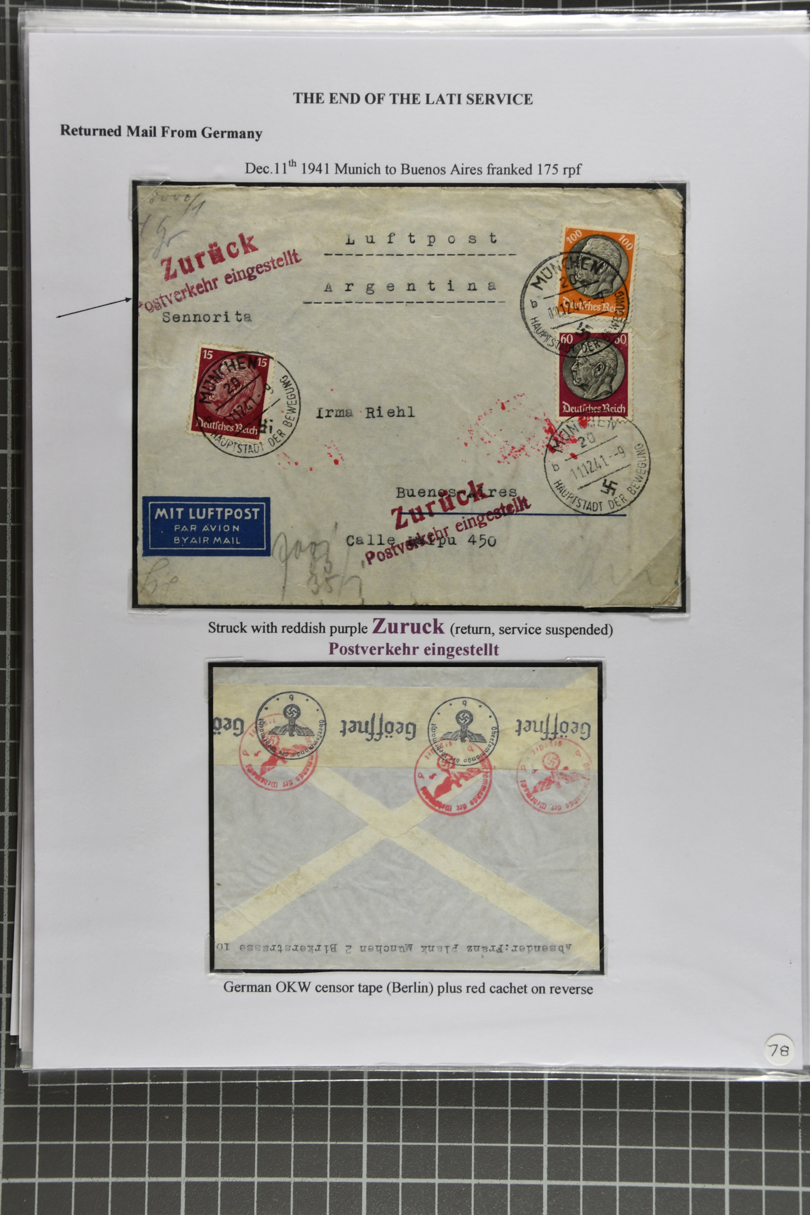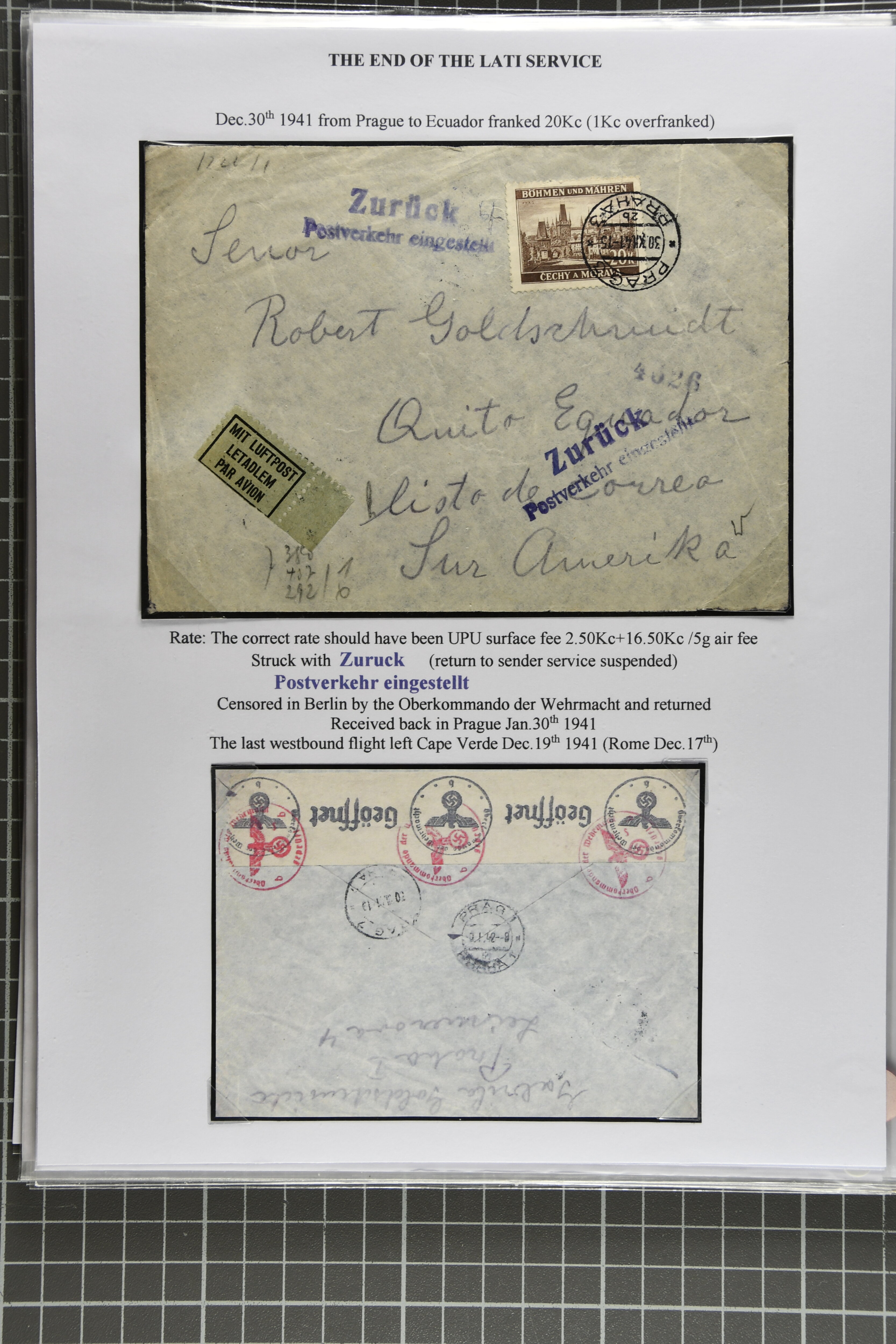 2368 cover imageEnd of LATI Service 1941 (Dec.): Group of 13 envelopes with instructional markings 'zurück' or 'retour / Postverkehr eingestellt', including two from Prague to Quito, Ecuador, one from Kopenhagen (Dec. 18) with ' Postal service suspended',six covers from Germany, two covers from Italy 'Al mittente per servizio sospeso' (two diff. types in black and red), cover from Rio to Germany showing 'Ae Remetente / Comunicaocoes Postais Interrompidas' in black (returned Mail from Brazil is rare), as well as envelope from Frederiksoord, Netherlands to Porto Alegre in Brazil. A fine and scarce assemply of returned LATI mail. (Image 1) (Image 2) (Image 3) (Image 4) (Image 5) (Image 6) (Image 7) (Image 8) (Image 9) (Image 10) (Image 11)