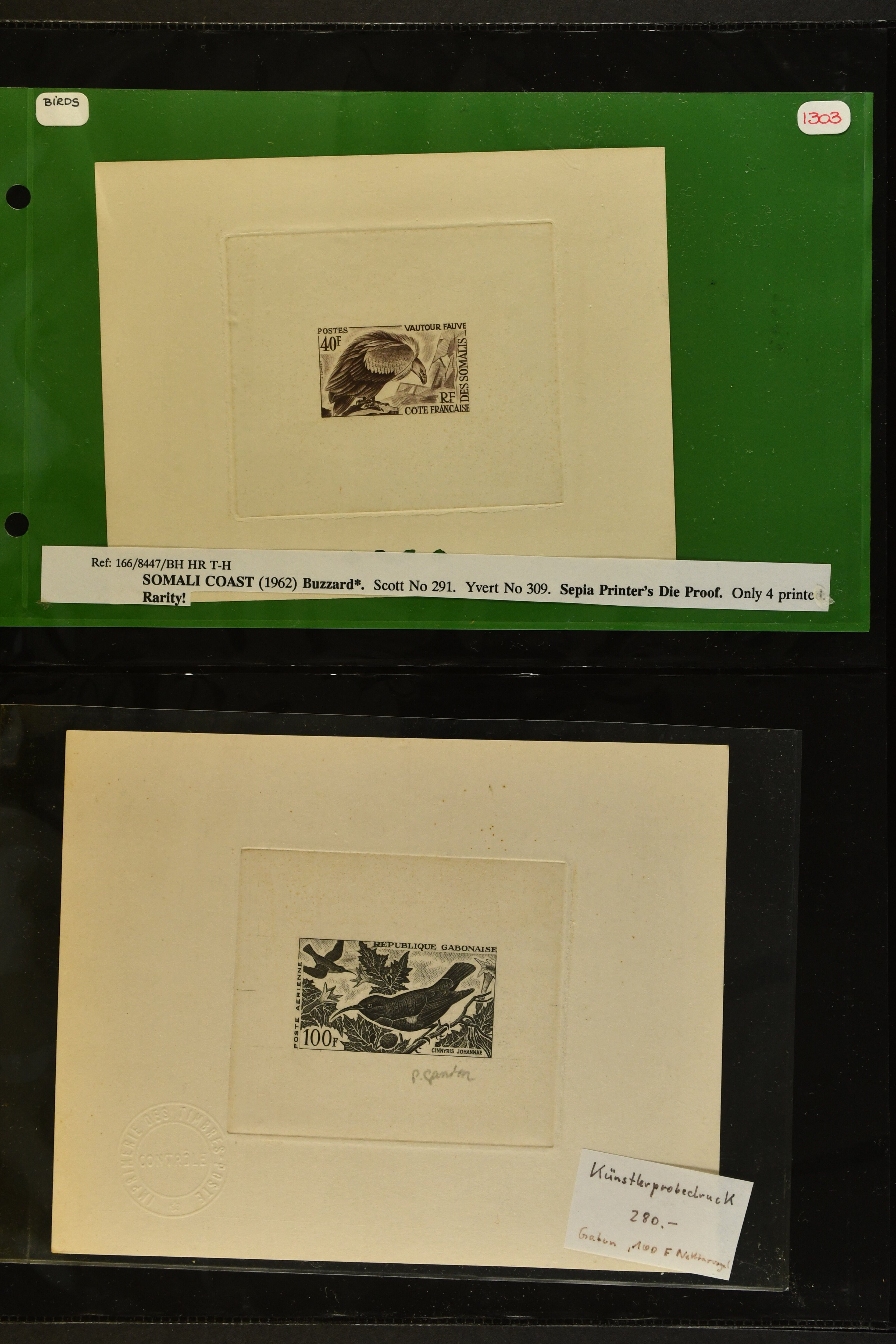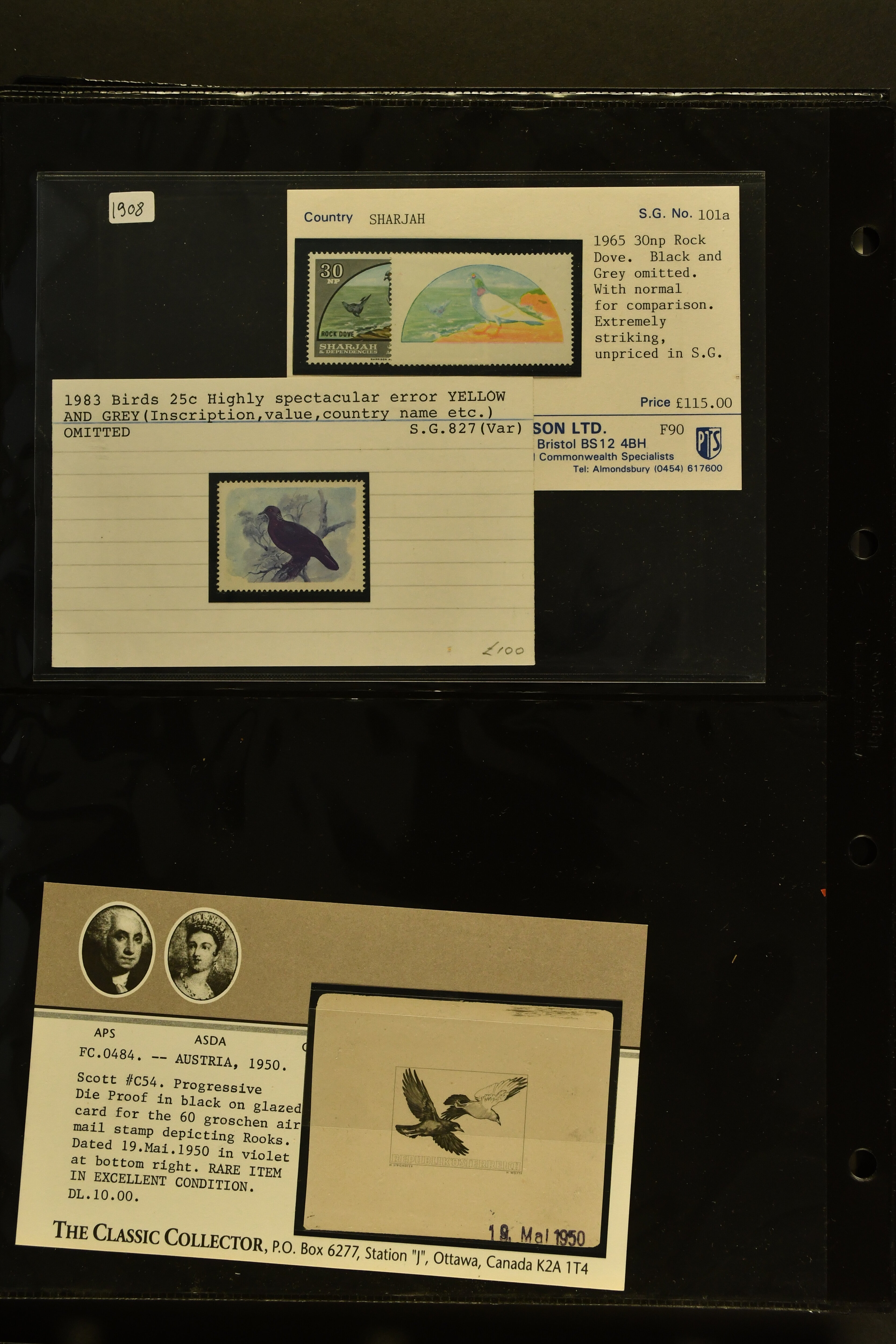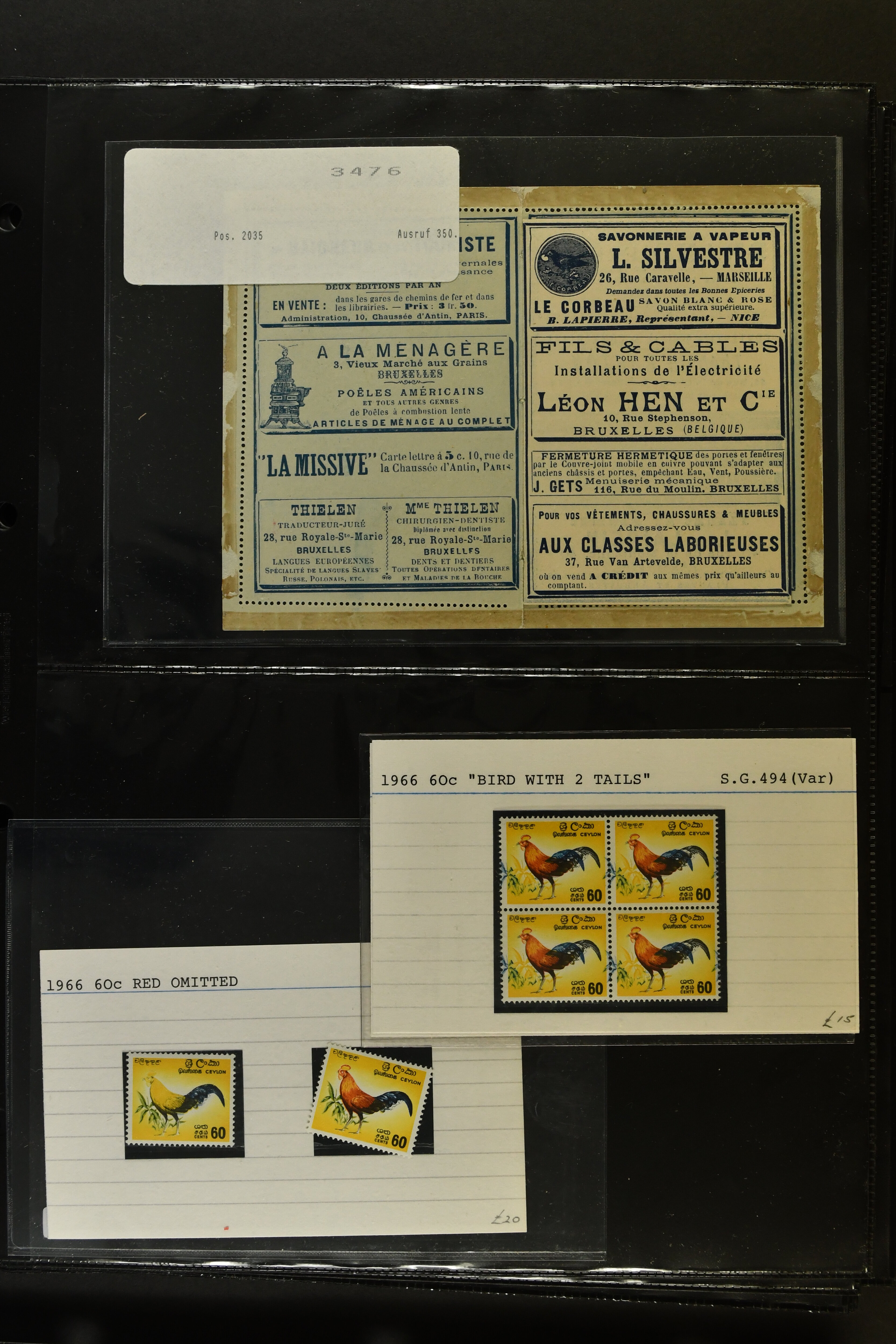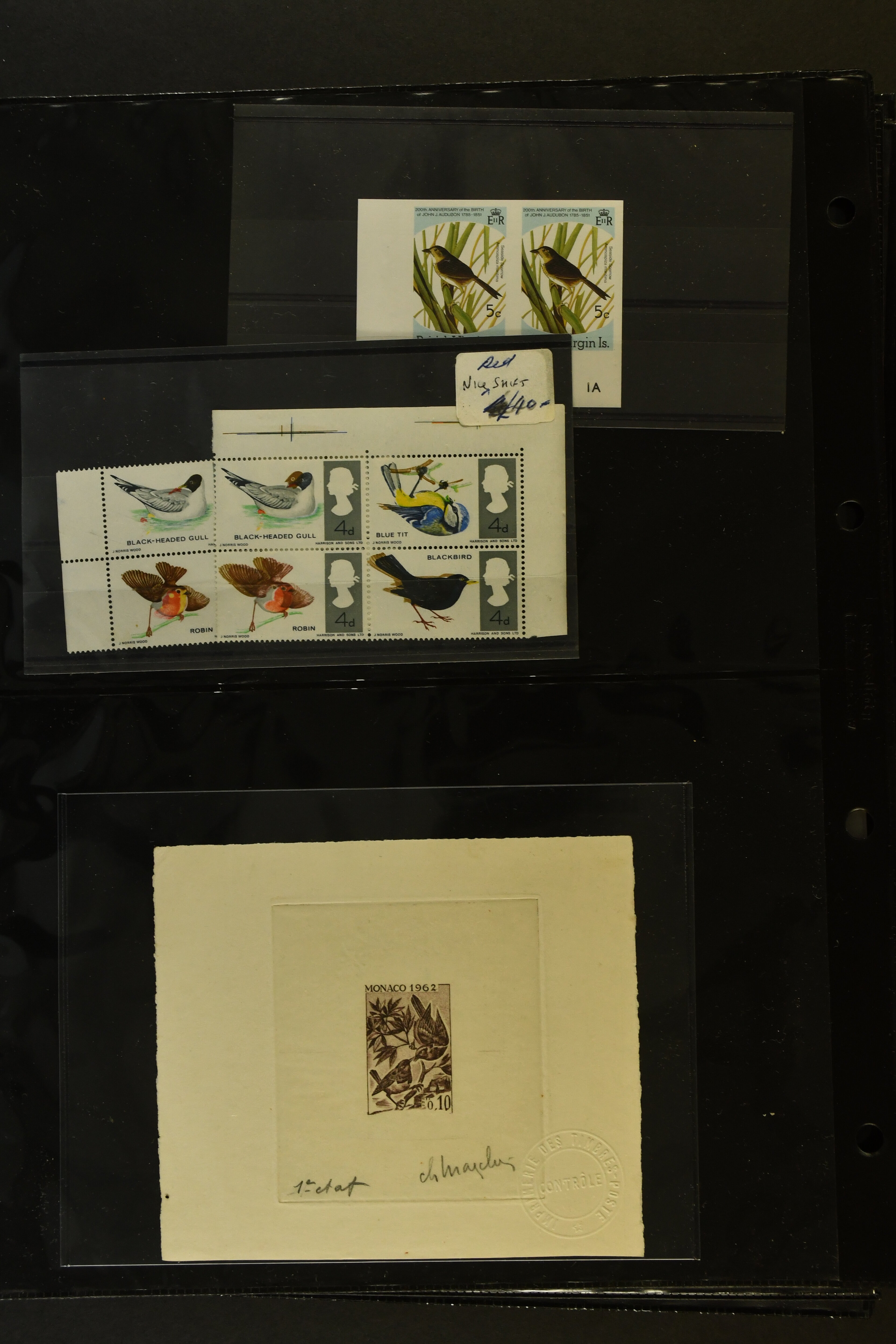 2758 imageTopical Selection Birds from Europe and North America, a special group of 32 primarily unused adhesives / multiples with varieties and proofs incl. USA 1966 Yellow-shafted Flicker with displaced colours, UK Songbirds Blackbird & Robin with missing legs, Blue Tit with missing colour blue, and strong colour shifts on diff. adhesives, 1926 booklet with 'Blackbird Fountpens' advertisement, British Virgin Islands with Audubon anniversary, Cockerels Ceylon 1966 with shifts and three colours omitted, Doves Sharjah 1965 colours omitted, Algeria epreuve de luxe Boy with dove, Crooks Austria 1950, two progressive die proofs, Swallows France 1949 Airmail 100f Grand Palais, Storks AOF 1947 Epreuve 100f., Birds of Prey, five proofs and Epreuves from Austria and diff. French Colonies, UK booklet cover with a Falcon, Owls seven issues with strongly missing and misplaced perfs and colours, and proofs, also two groups of UK booklet cover designs with diff. bird designs. A high catalogue value assemby. (Image 1) (Image 2) (Image 3) (Image 4) (Image 5) (Image 6) (Image 7) (Image 8) (Image 9) (Image 10) (Image 11) (Image 12) (Image 13) (Image 14)